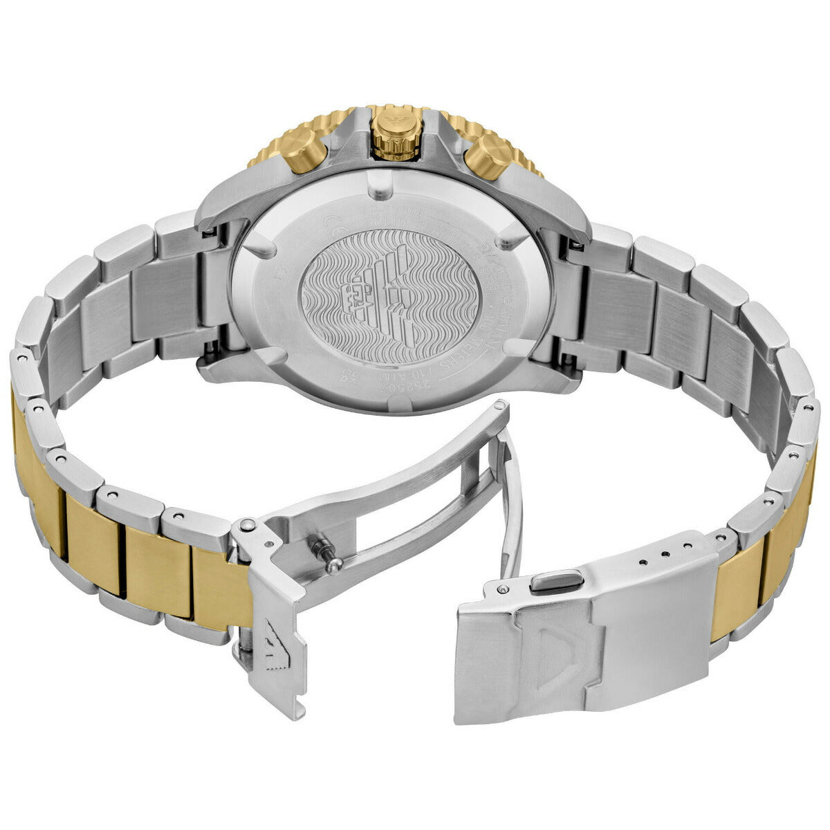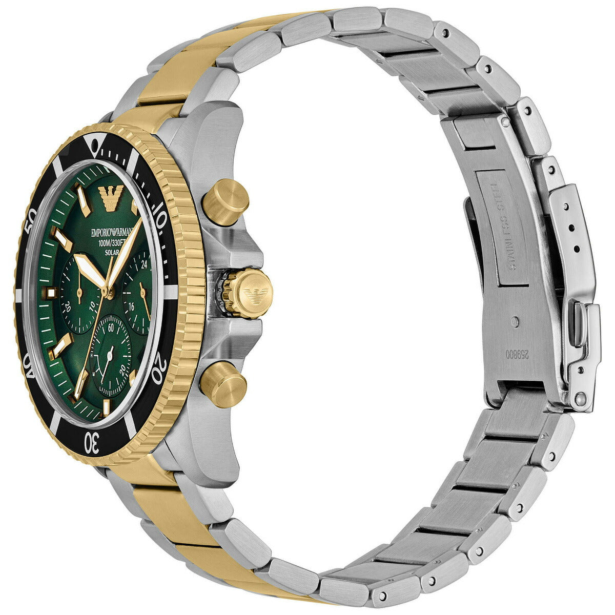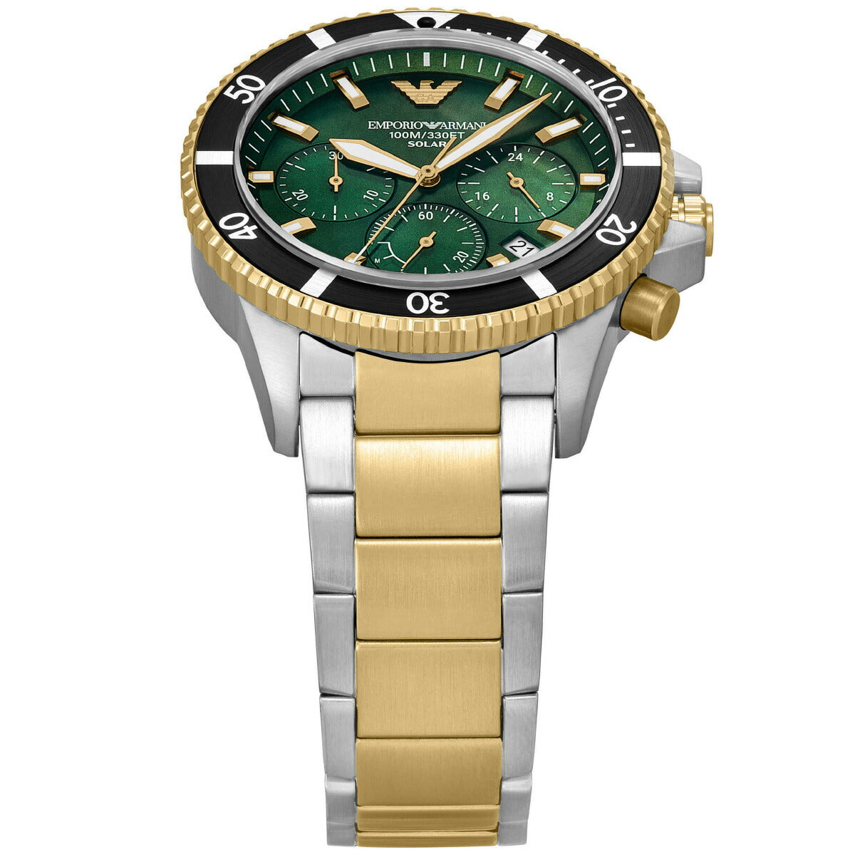 Emporio Armaniの43.5mm径 ワールドエクスプローラー ソーラーパワー クロノグラフウォッチ。グリーンのサンレイダイヤル、サファイアクリスタル、ツートーンのステンレススチール製ブレスレットを組み合わせました。ソーラー駆動のムーブメントが信頼性を約束し、頻繁な電池交換を不要にします。この時計は1度のフル充電で最長5ヶ月間使用できます。