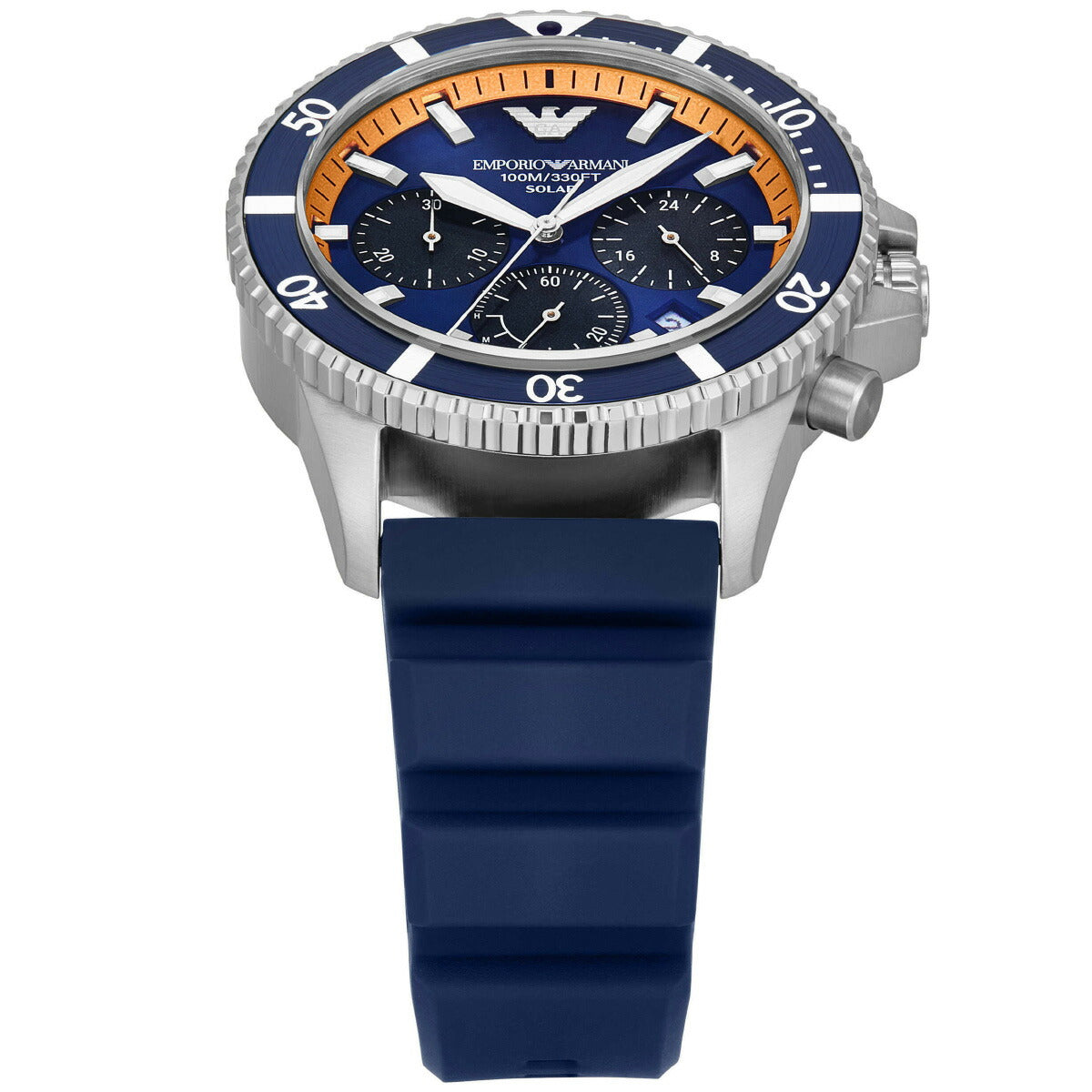 Emporio Armaniの43.5mm径 ワールドエクスプローラー ソーラーパワー クロノグラフウォッチ。ブルーとオレンジのサンレイダイヤル、サファイアクリスタル、ダークブルーのシリコンストラップを組み合わせました。ソーラー駆動のムーブメントが信頼性を約束し、頻繁な電池交換を不要にします。この時計は1度のフル充電で最長5ヶ月間使用できます。
