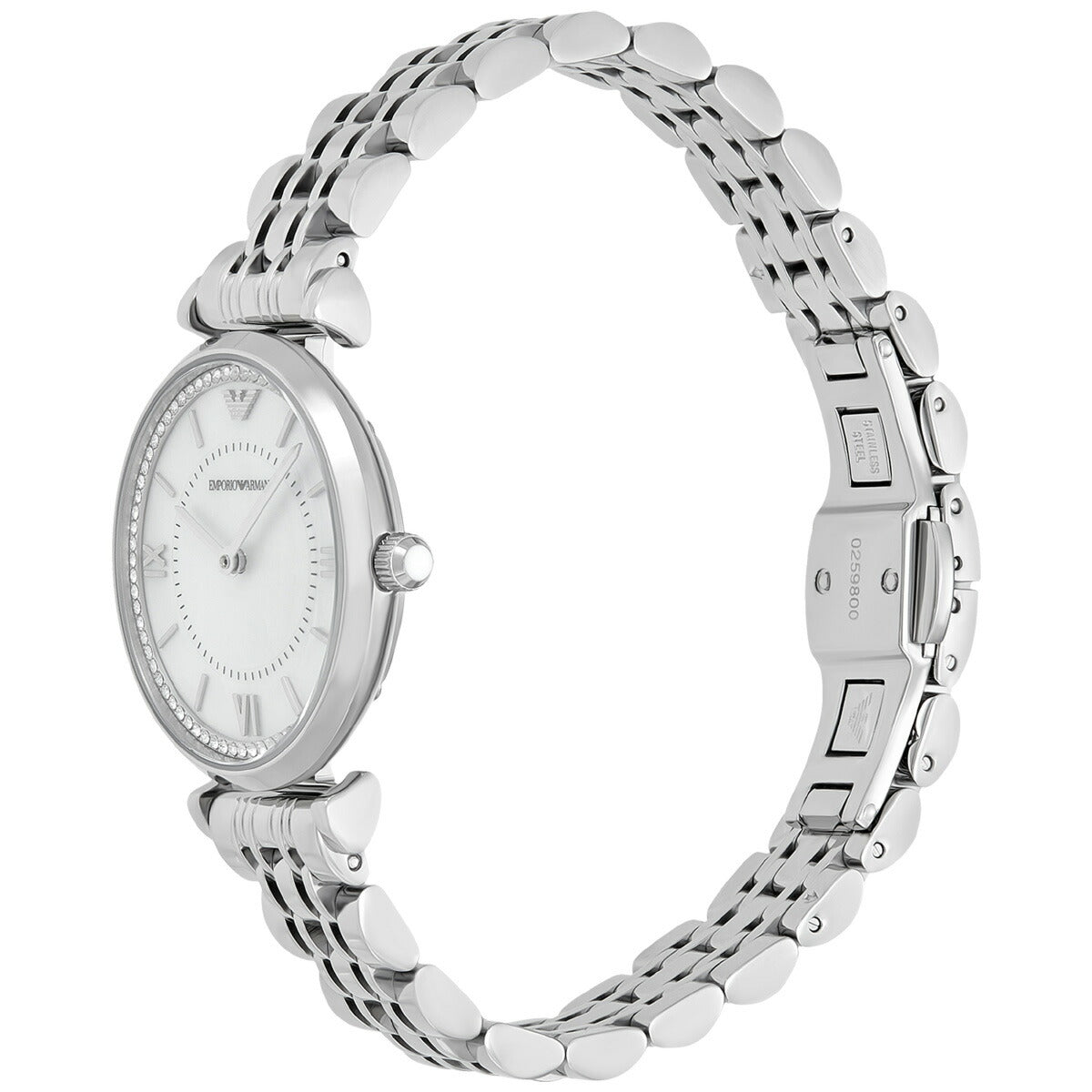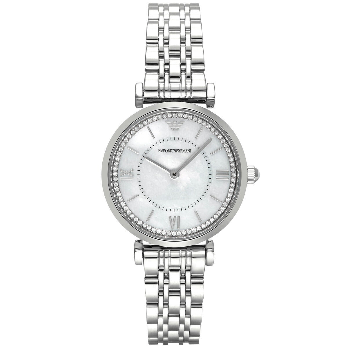 Emporio Armaniの32mm径ウォッチ。ホワイトマザーオブパールのダイヤルとクリスタルのインレイを施した外縁を組み合わせました。ローマ数字インデックスが、ステンレススチール製ケースと複雑なブレスレットに配されたダイヤルを彩ります。