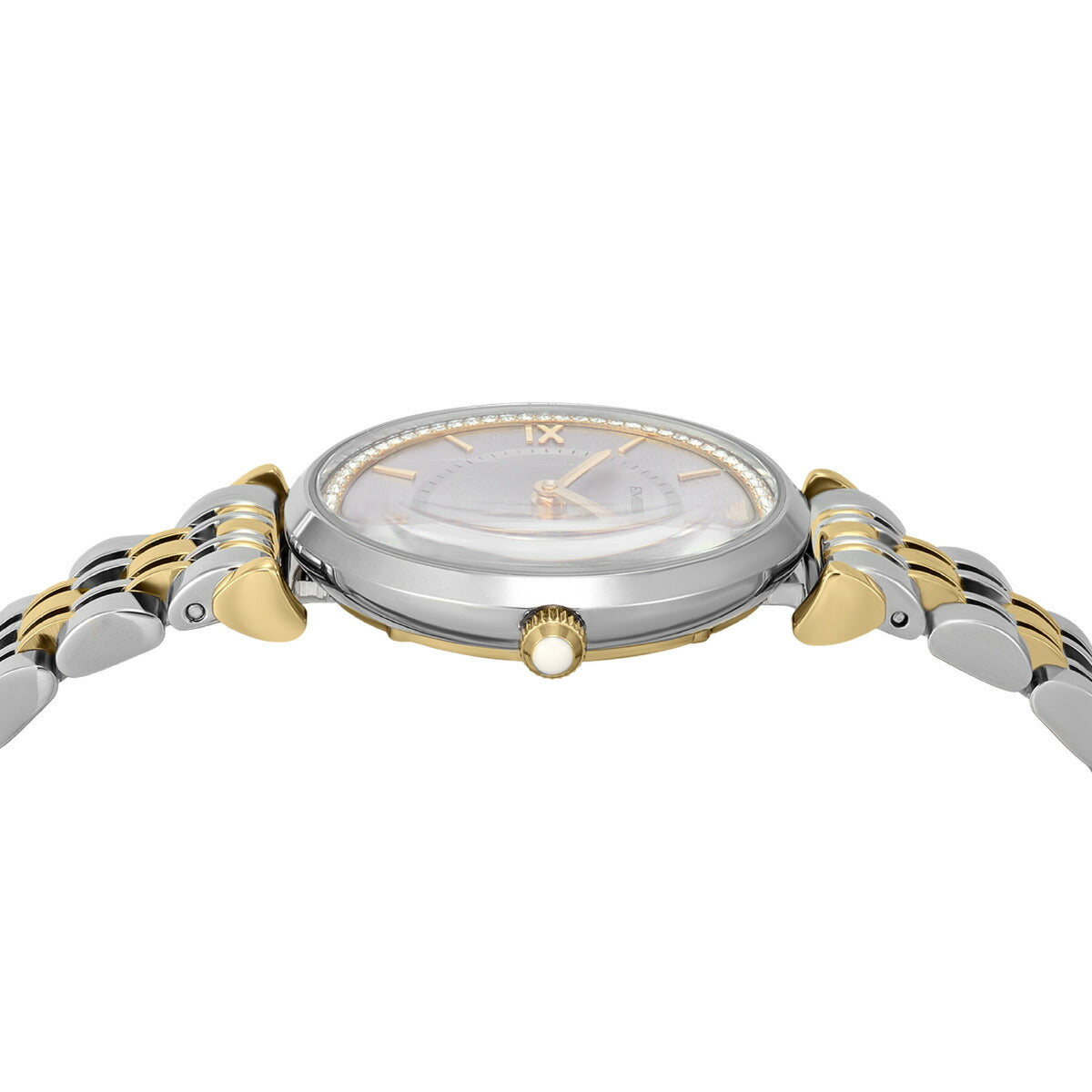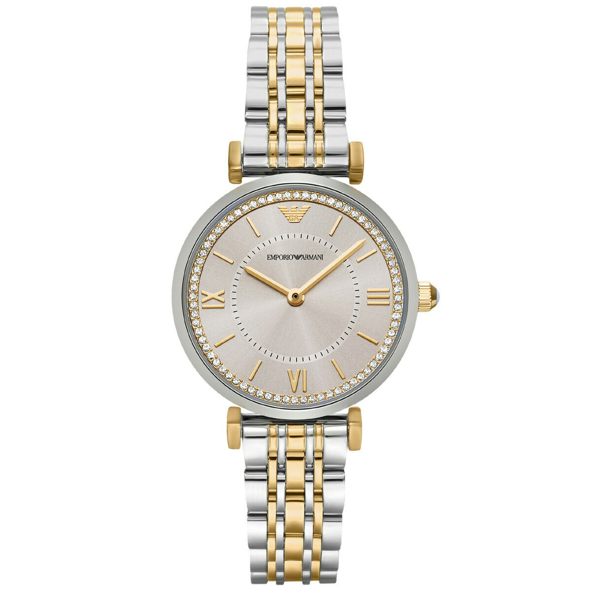 Emporio Armaniの32mm径ウォッチ。シャンパーニュのサンレイダイヤルとクリスタルのインレイを施した外縁を組み合わせました。ゴールドトーンのローマ数字インデックスが、ツートーンのステンレススチール製ケースと複雑なブレスレットに配されたダイヤルを彩ります。