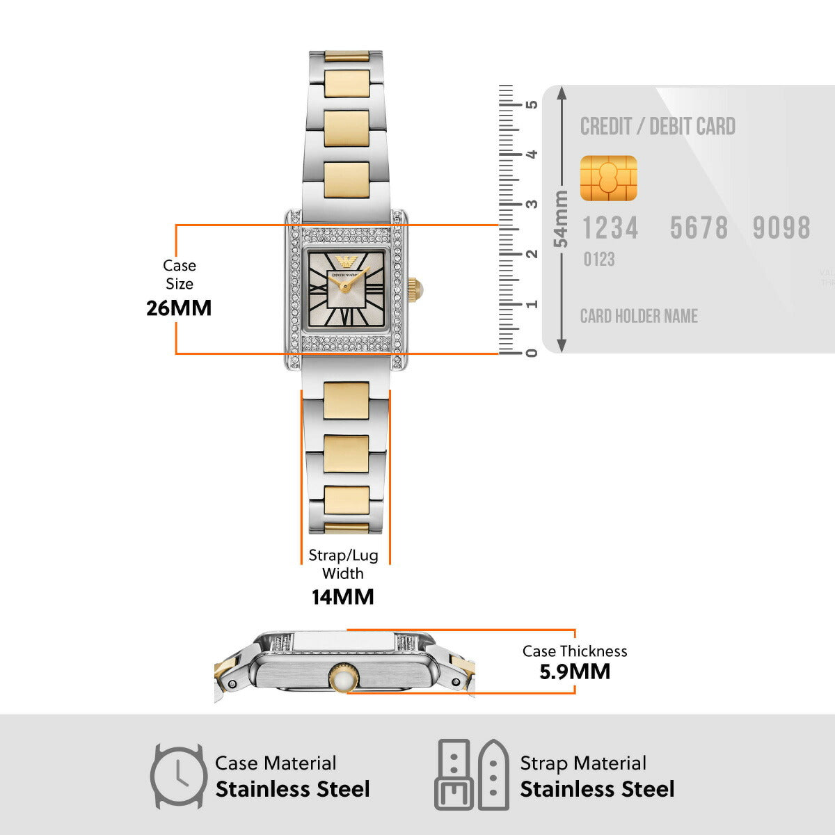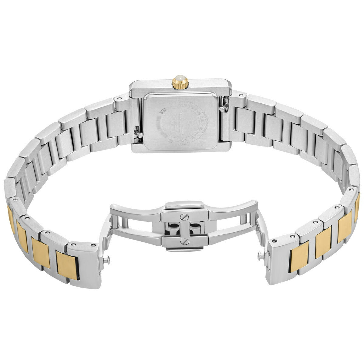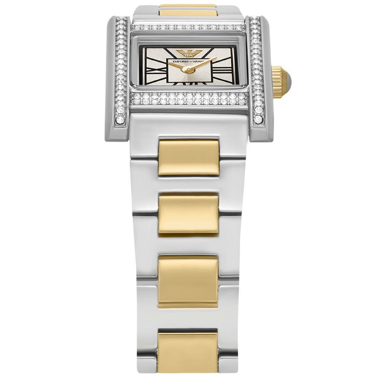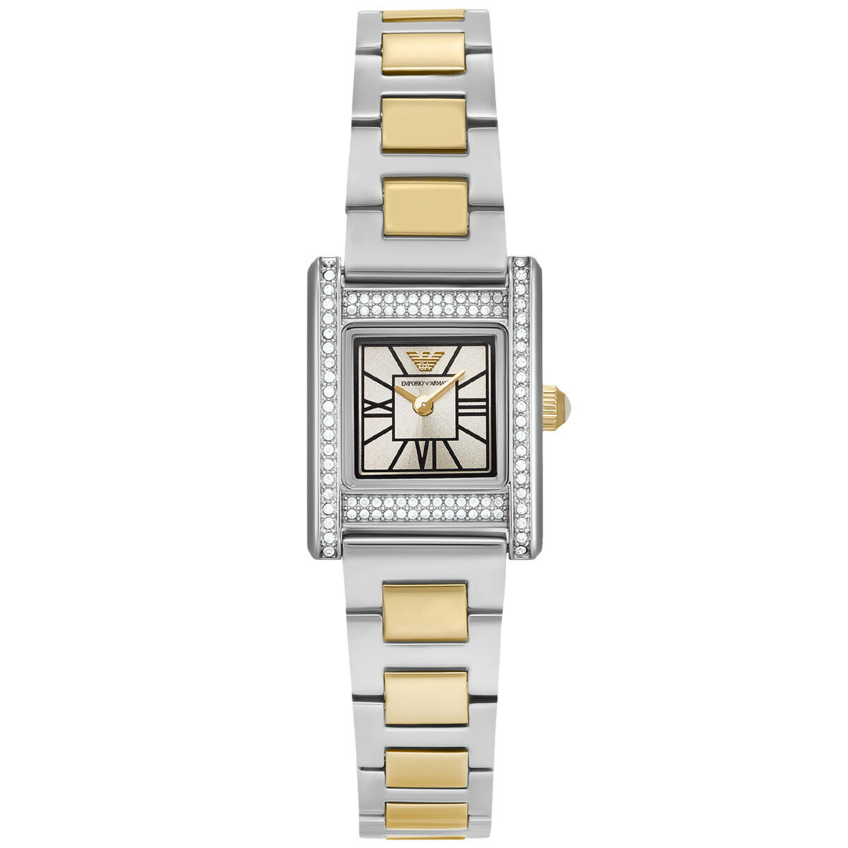 Emporio Armaniのケースサイズ20×26mmのウォッチ。温かみのあるグレーのサンレイダイヤルにローマ数字インデックスを配し、ツートーンのステンレススチール製ケースにクリスタルをあしらいました。ツートーンカラー ステンレススチール製ブレスレットが洗練された印象を与える二針ムーブメントのドレスウォッチは、お手持ちのコレクションの中で永遠の魅力を放ちます。