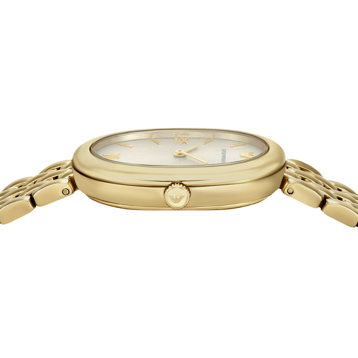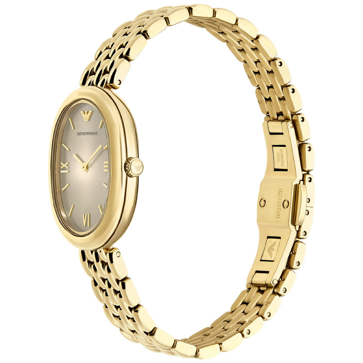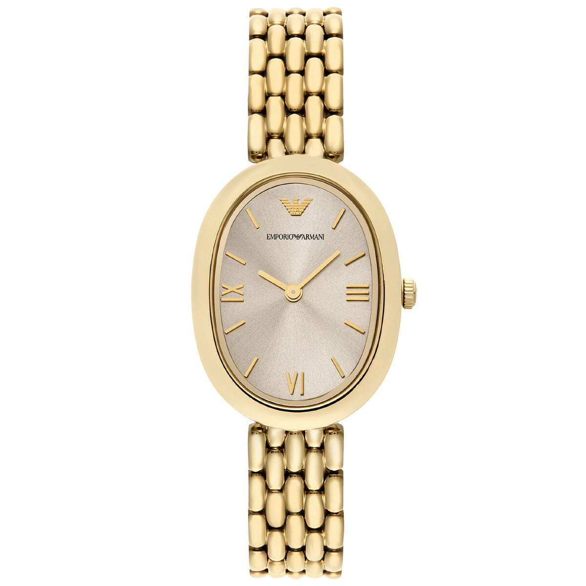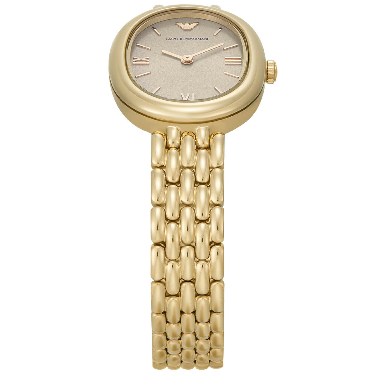 Emporio Armaniのケースサイズ26×34mmのウォッチ。温かみのあるグレーのサンレイダイヤルにゴールドトーンのローマ数字インデックスを配し、複雑なデザインに仕上げたゴールドトーン ステンレススチール製マルチリンクブレスレットを組み合わせました。特徴的なオーバルシルエットが、この時計を理想的なドレス アクセサリーにしています。