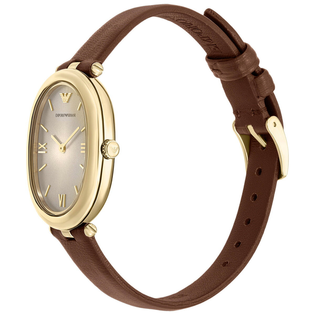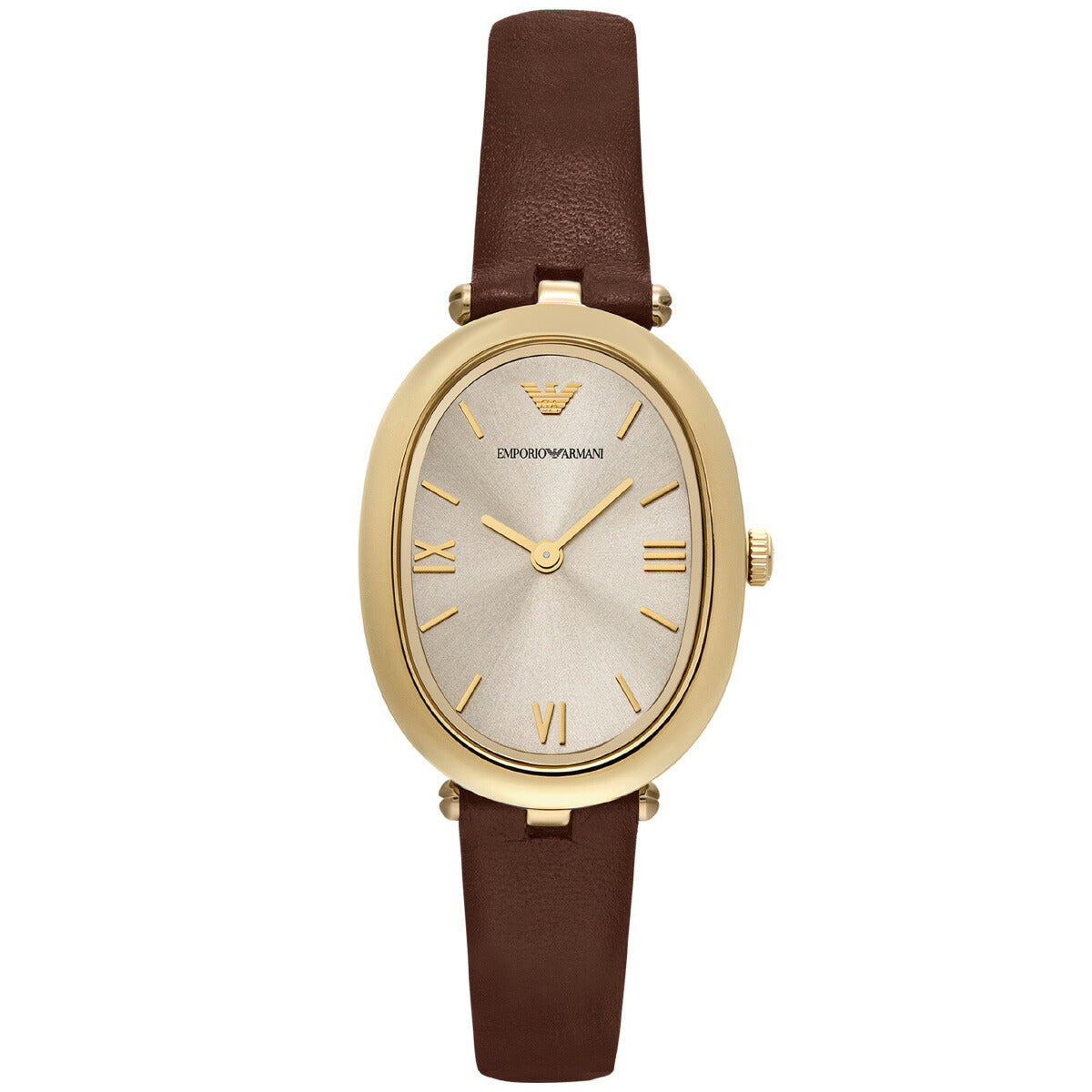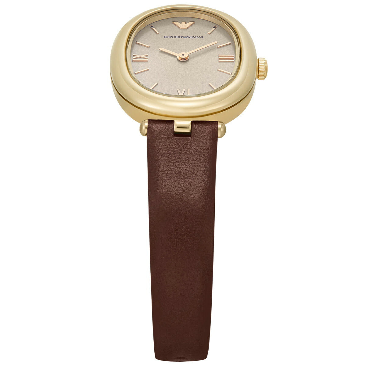 Emporio Armaniのケースサイズ26×34mmのウォッチ。温かみのあるグレーのサンレイダイヤルにゴールドトーンのローマ数字インデックスを配し、ブラウンのナッパレザーストラップを組み合わせました。特徴的なオーバルシルエットが、この時計を理想的なアクセサリーにしています。