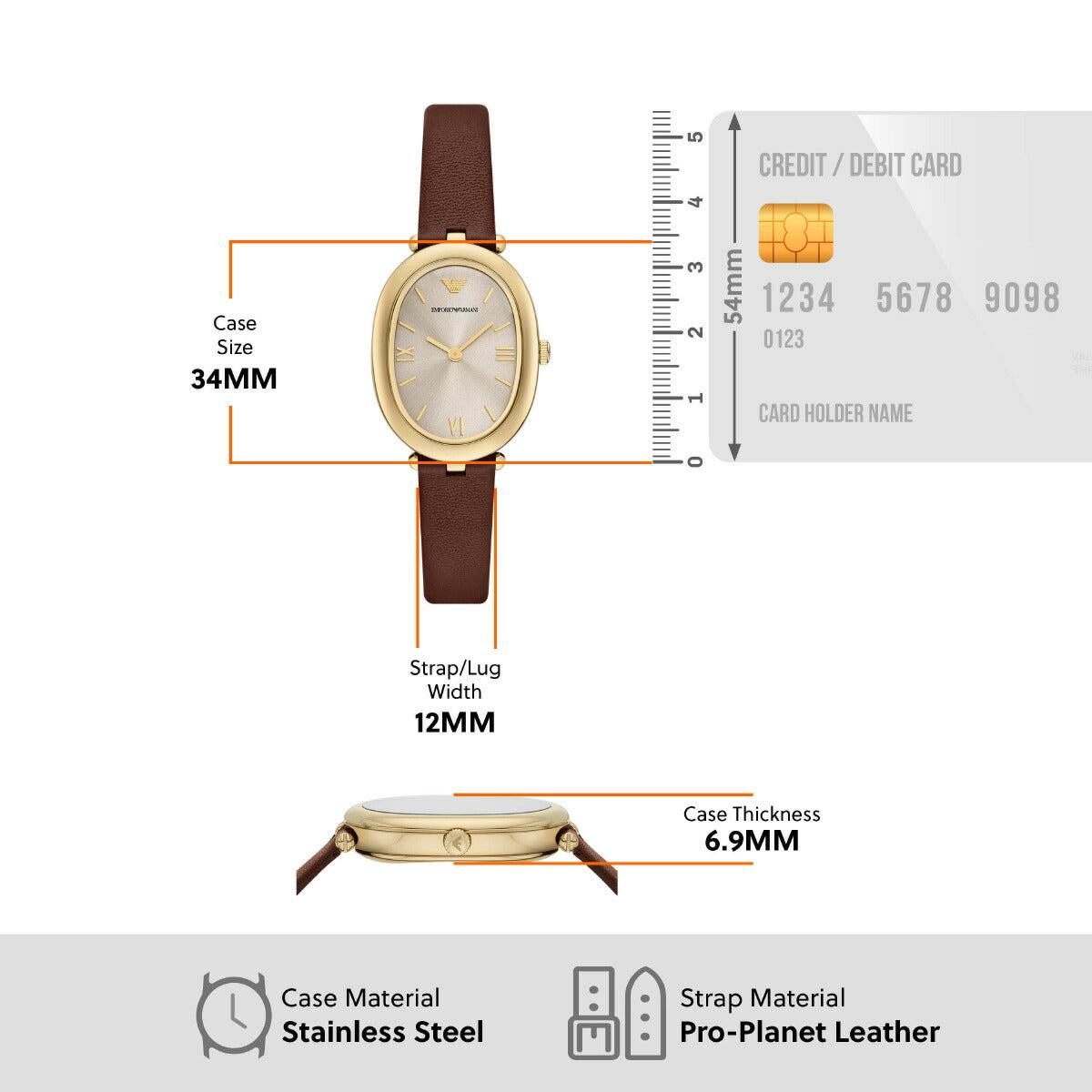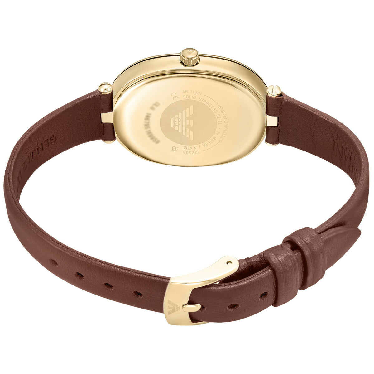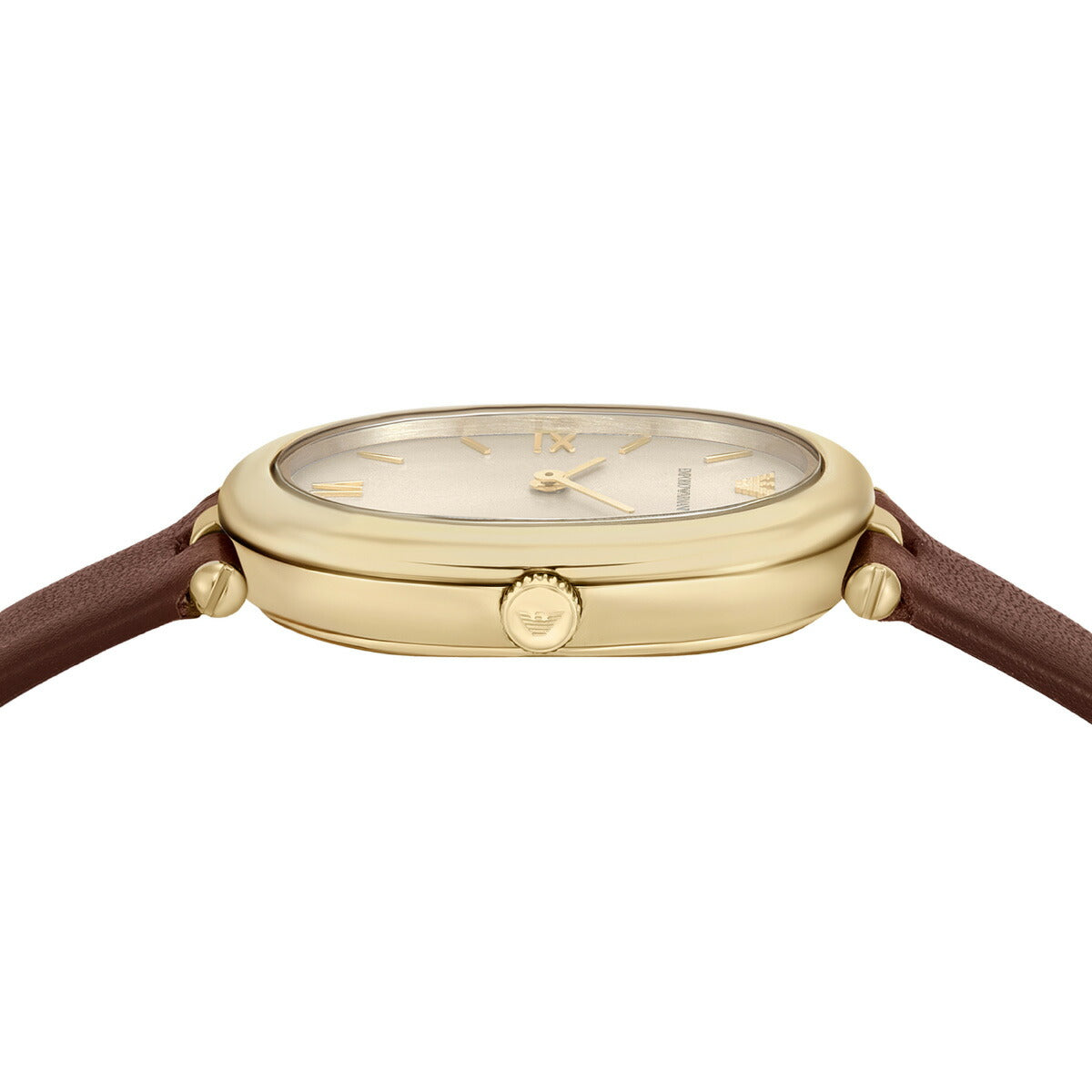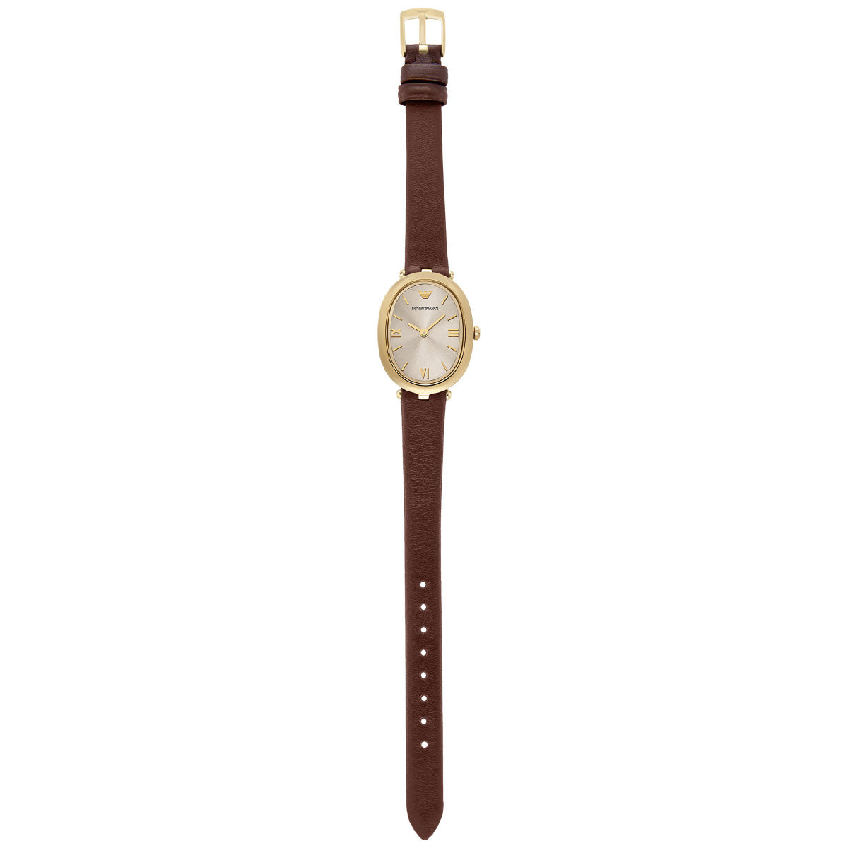 Emporio Armaniのケースサイズ26×34mmのウォッチ。温かみのあるグレーのサンレイダイヤルにゴールドトーンのローマ数字インデックスを配し、ブラウンのナッパレザーストラップを組み合わせました。特徴的なオーバルシルエットが、この時計を理想的なアクセサリーにしています。