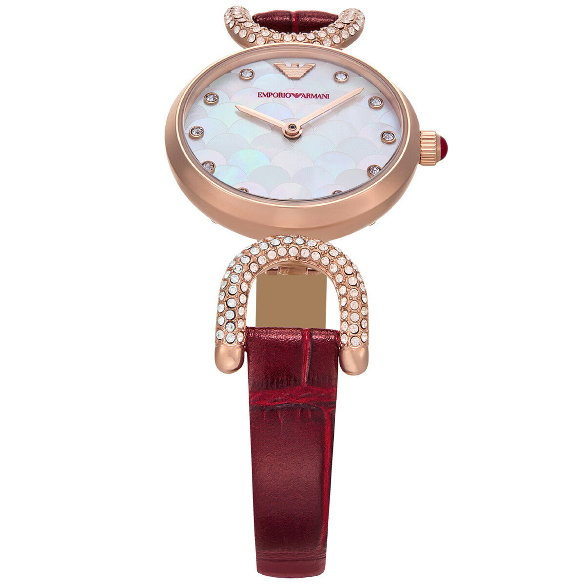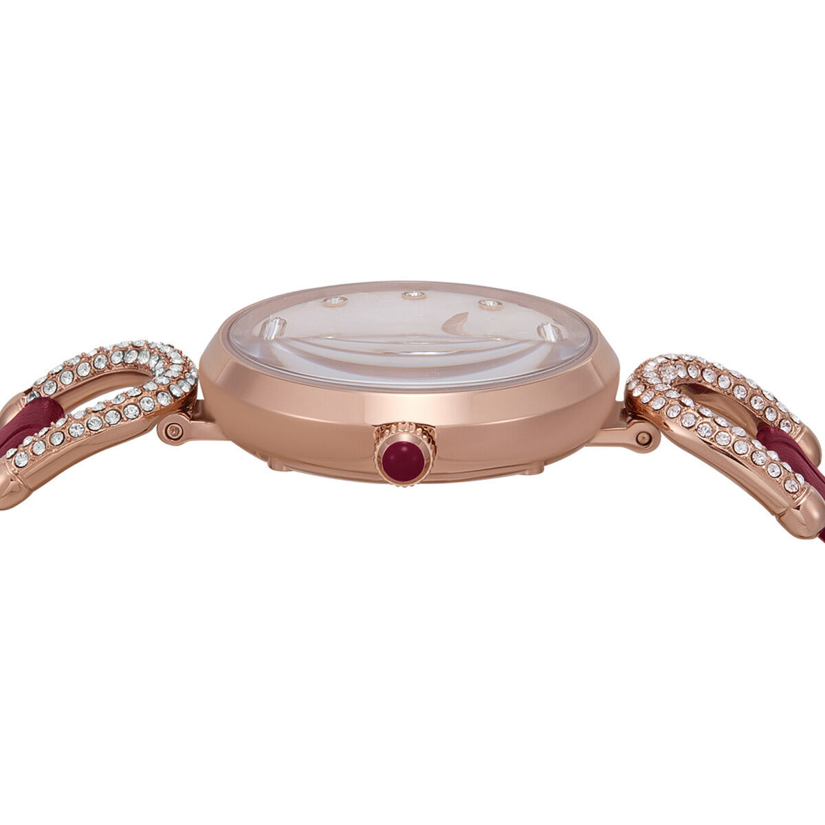 このウォッチはスカラップ模様を施したホワイトのマザーオブパールダイヤルが特徴で、ローズゴールドトーンのステンレススチール製ケースとクリスタルのインデックスを組み合わせ、リッチなバーガンディのレザーストラップを備えています。馬蹄型のクリスタルのラグは、午年にちなんだものです。