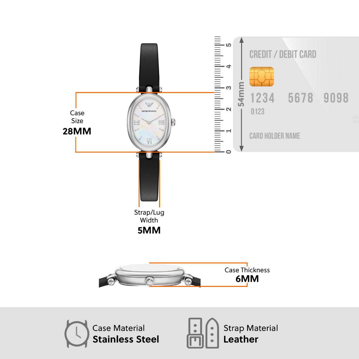 エンポリオ・アルマーニのSINFONIAは、22×28mmのウォッチ。ホワイトマザーオブパールのダイヤルにローマ数字インデックスを配し、ステンレススチール製ケースにセットしました。ブラックのレザーストラップとの組み合わせは、個性的なオーバルのシルエットがこのウォッチを理想的なアクセサリーにしています。