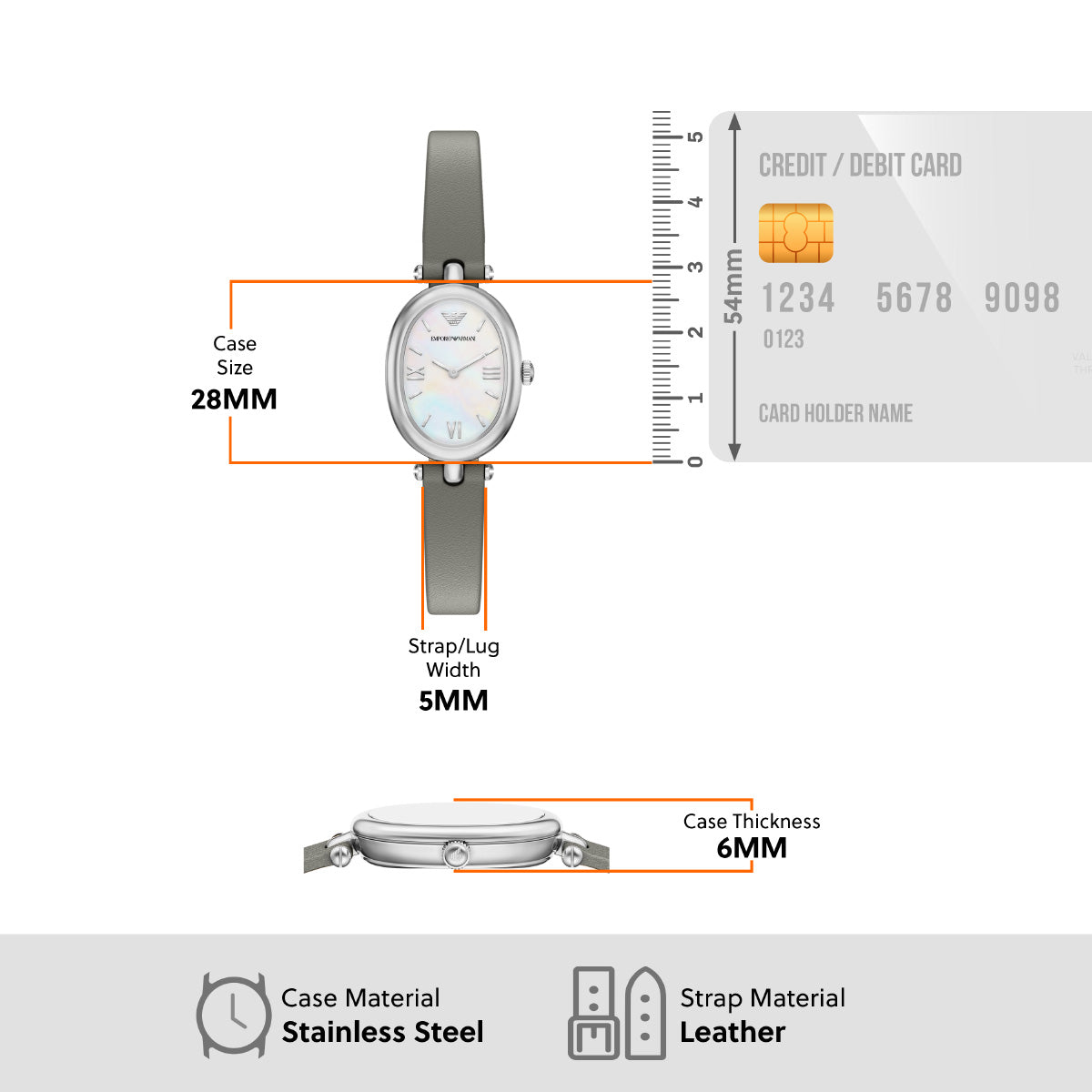 エンポリオ・アルマーニのSINFONIAは、22×28mmのウォッチ。ホワイトマザーオブパールのダイヤルにローマ数字インデックスを配し、ステンレススチール製ケースにセットしました。グレーのレザーストラップと組み合わされ、個性的なオーバルのシルエットがこのウォッチを理想的なアクセサリーにしています。