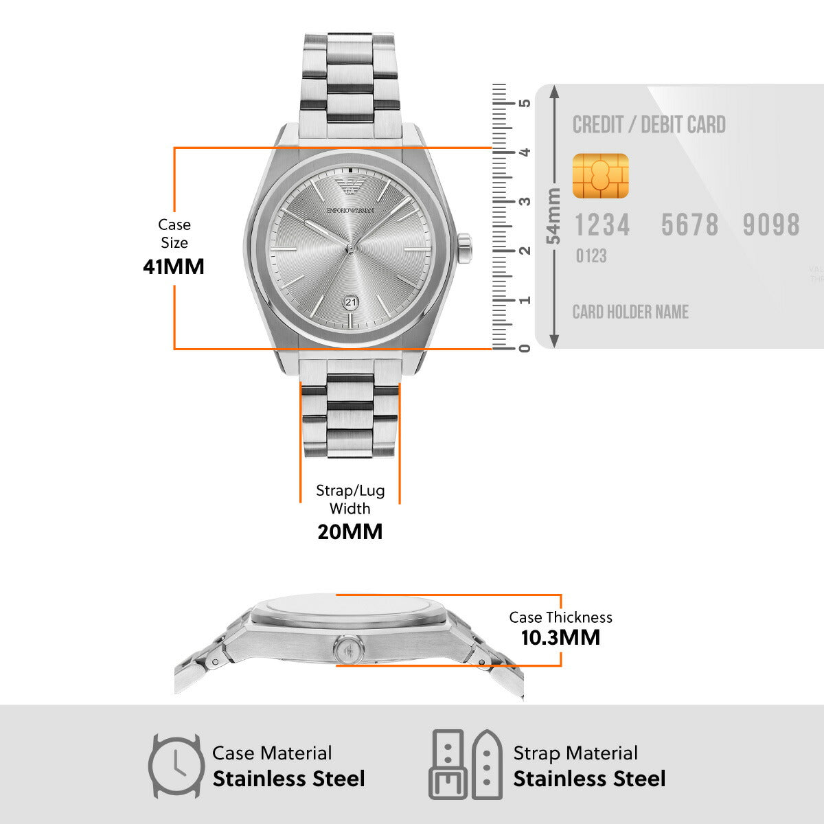 ステンレススチールのチェーンブレスレットとウォッチを組み合わせたEmporio Armaniのギフトセット。デイト表示付き三針ムーブメントを搭載した41mm径のウォッチは、CD仕上げを施したシルバートーンのサンレイダイヤルとステンレススチールブレスレットが特徴です。