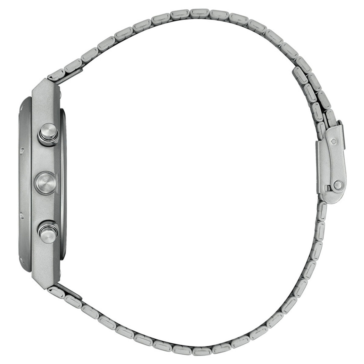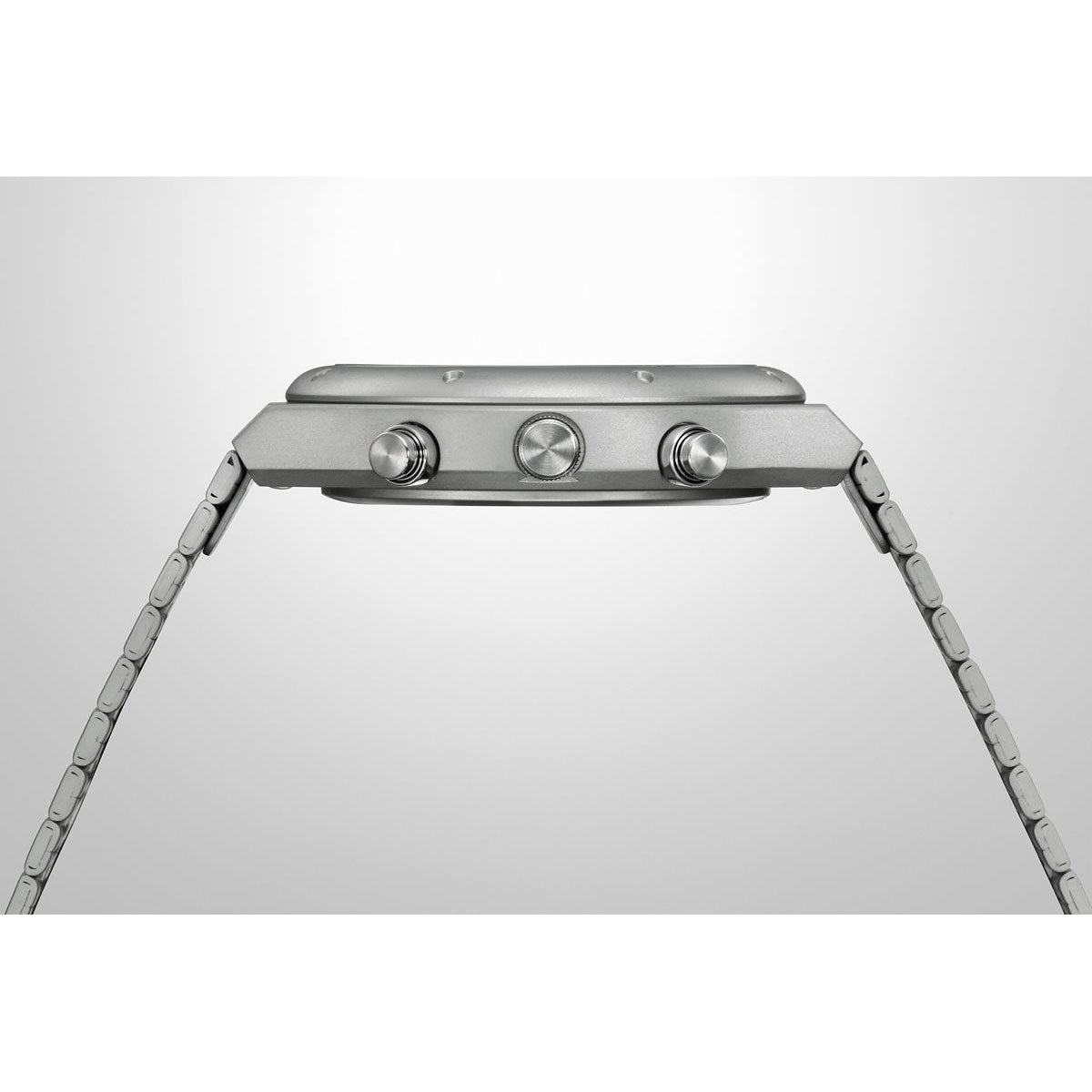 1984 chronograph:1984年に発売された多機能アナログクオーツクロノグラフ「スポルテ MS」を、昭和後期の世界観をイメージした、"ポスト・ヴィンテージ"テイストにアップデートしました。「スポルテ MS」のケースからバンドにかけてのスタイリッシュなラインや少し武骨な印象を与えるベゼルの飾り穴処理を再現。レトロな印象とクロノグラフのスポーティーさを同時に楽しめます。オリジナルモデルをリスペクトした黒文字板モデルは、ケースにホーニング処理を施し、渋めの印象に。上板が金属素材の白文字板モデルはヘアライン仕上げを採用し、レトロな中にもモダンな雰囲気をプラス。同じシルバーでありながらも異なる雰囲気を纏わせています。