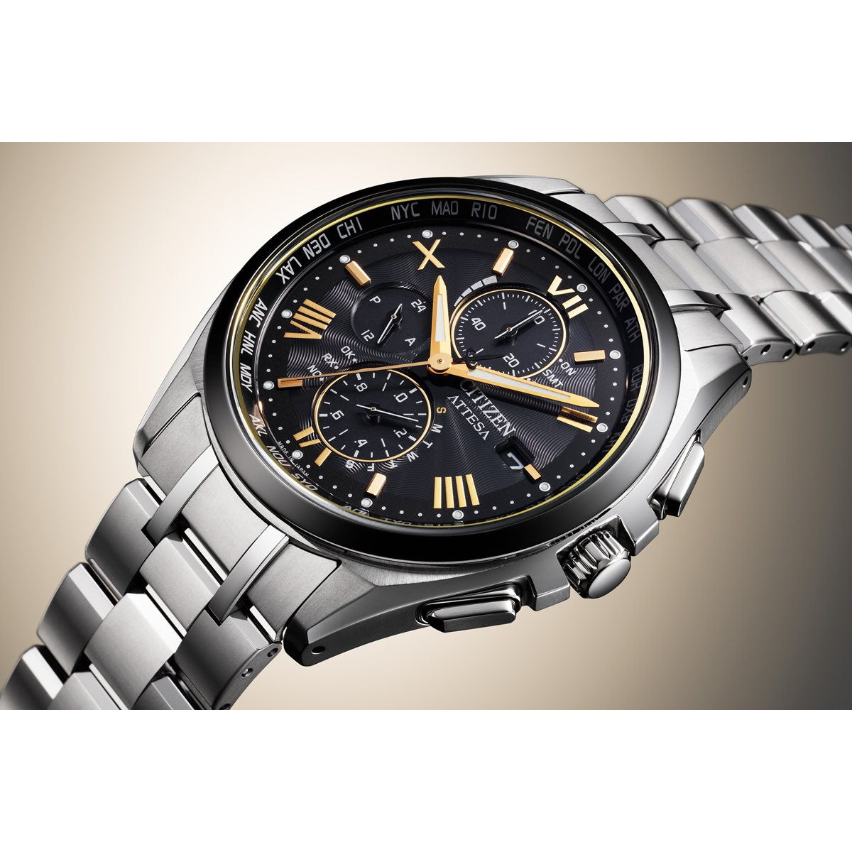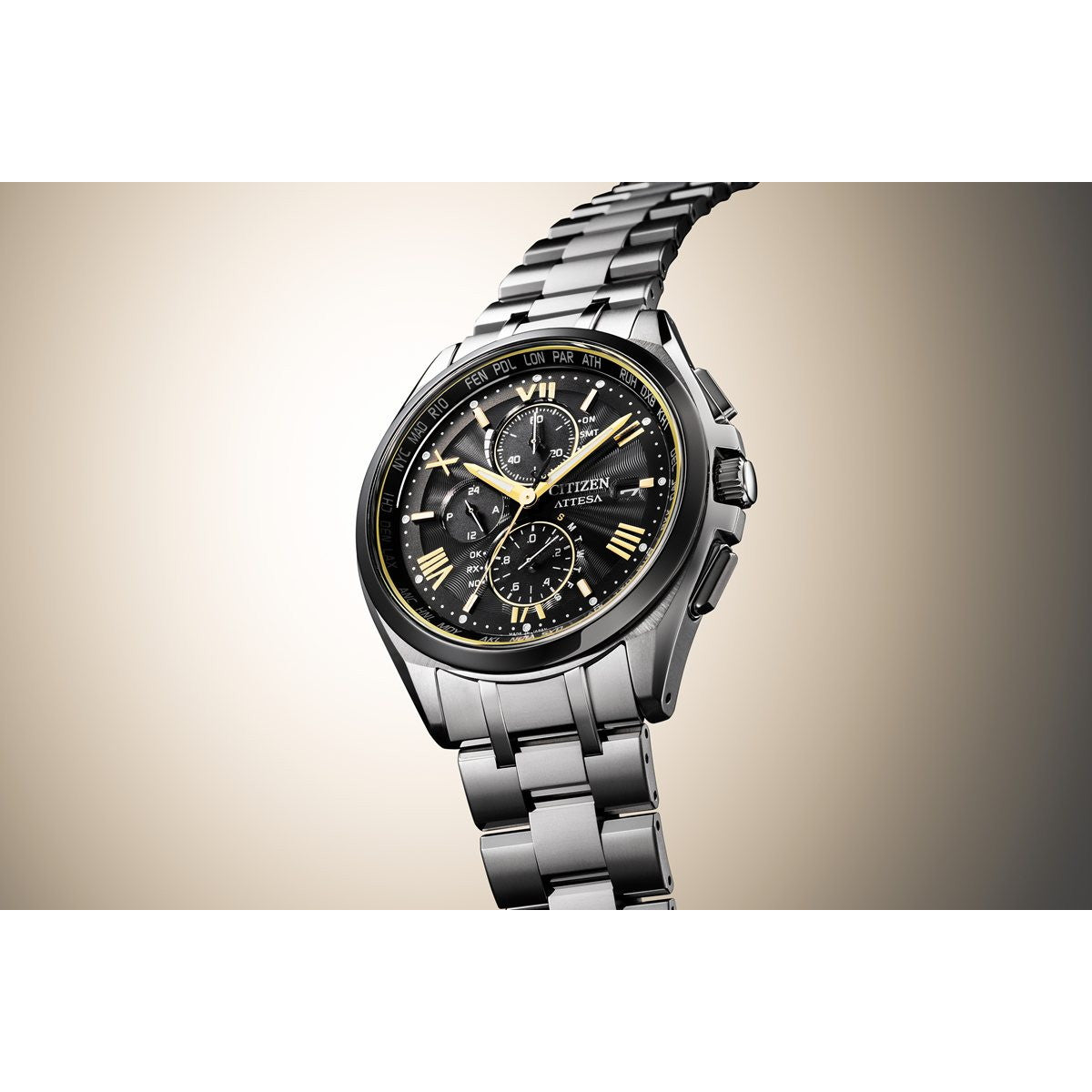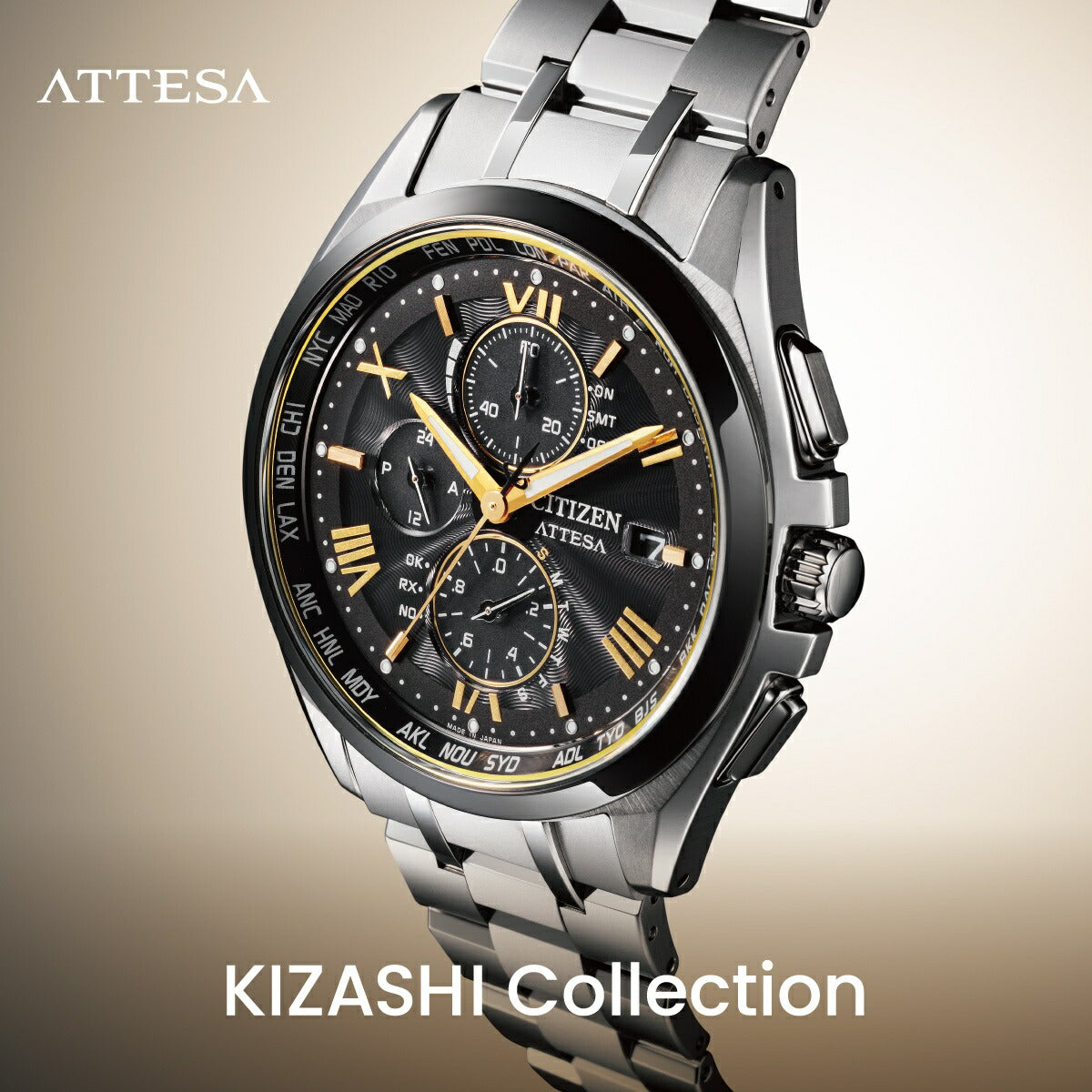新しいときのはじまりを告げる光が、腕元で華やかに彩りを添える、年始のブランド横断企画。サンレイパターンとゴールドをあしらい、中心からまっすぐと広がっていく光を表現した、特別感のあるデザイン。ATTESA、EXCEED、xC、CITIZEN COLLECTIONの4ブランドで展開します。[ATTESA]チタニウムで次世代を進み続ける、シチズン ATTESA(アテッサ)。ロングセラーの人気モデル「AT8040」をベースにアレンジ。中心からまっすぐ広がっていく光を文字板上にデザインしました。サンレイパターンを描いたブラックの文字板に、ゴールドのローマ数字インデックスをレイアウト。黄金の輝きがエレガントな印象を演出します。デュラテクトプラチナのケースとバンドが明るい輝きをプラス。デュラテクトDLCのベゼルが、全体の印象を引き締めています。サファイアガラスの外周は、蒸着で仕上げたゴールドのリングが輝きます。