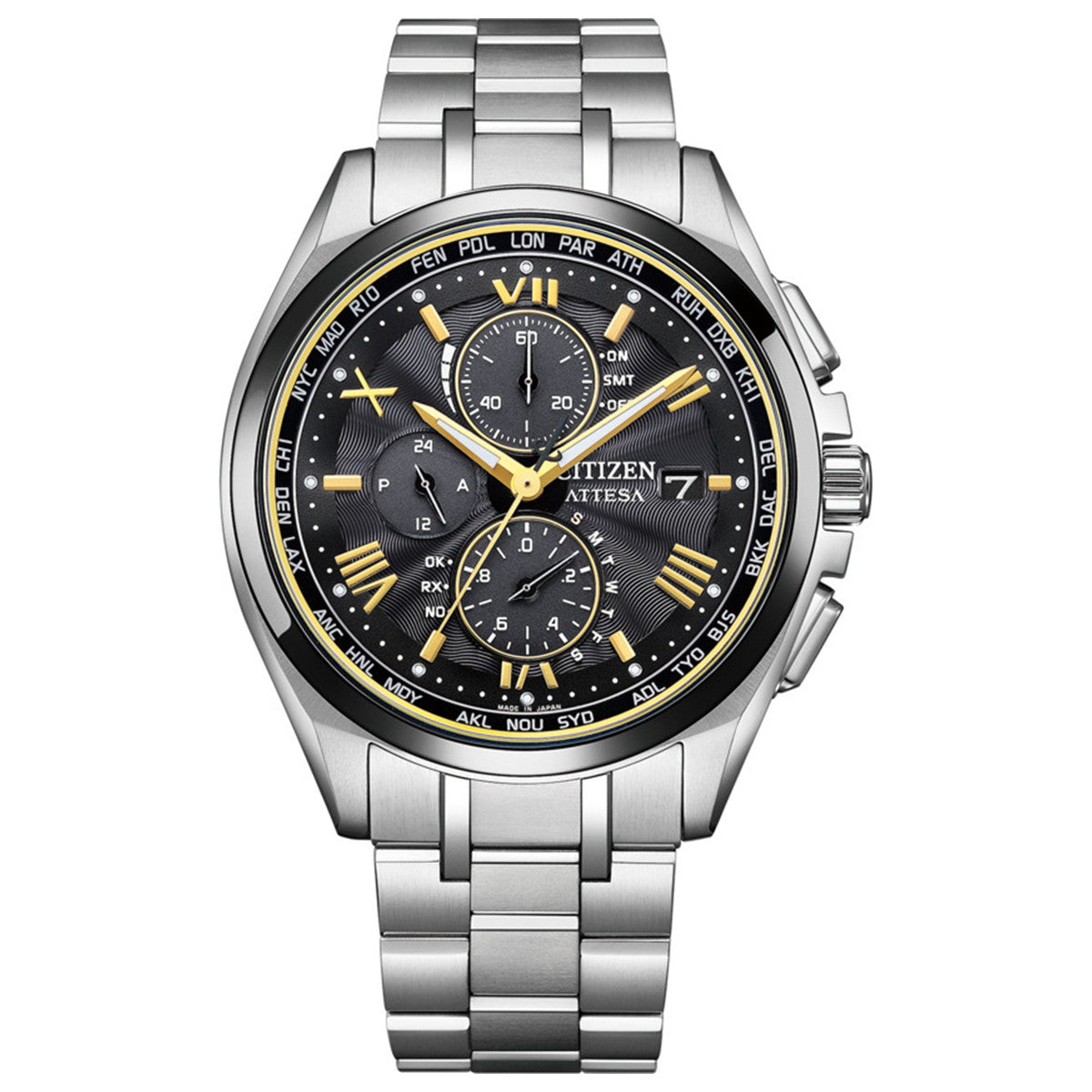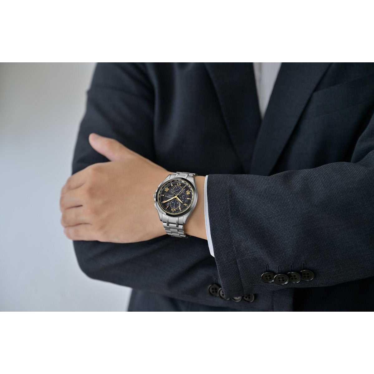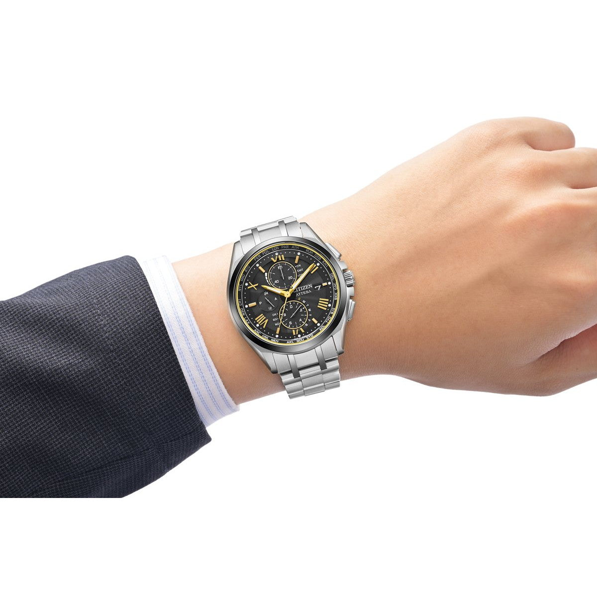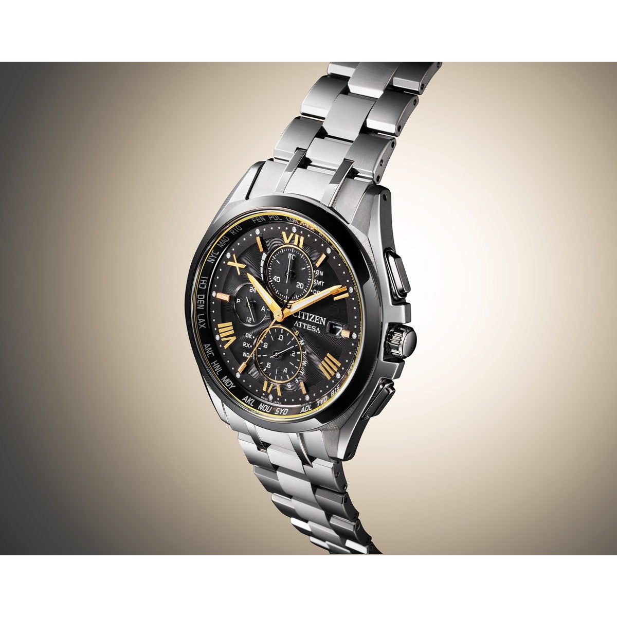 新しいときのはじまりを告げる光が、腕元で華やかに彩りを添える、年始のブランド横断企画。サンレイパターンとゴールドをあしらい、中心からまっすぐと広がっていく光を表現した、特別感のあるデザイン。ATTESA、EXCEED、xC、CITIZEN COLLECTIONの4ブランドで展開します。[ATTESA]チタニウムで次世代を進み続ける、シチズン ATTESA(アテッサ)。ロングセラーの人気モデル「AT8040」をベースにアレンジ。中心からまっすぐ広がっていく光を文字板上にデザインしました。サンレイパターンを描いたブラックの文字板に、ゴールドのローマ数字インデックスをレイアウト。黄金の輝きがエレガントな印象を演出します。デュラテクトプラチナのケースとバンドが明るい輝きをプラス。デュラテクトDLCのベゼルが、全体の印象を引き締めています。サファイアガラスの外周は、蒸着で仕上げたゴールドのリングが輝きます。