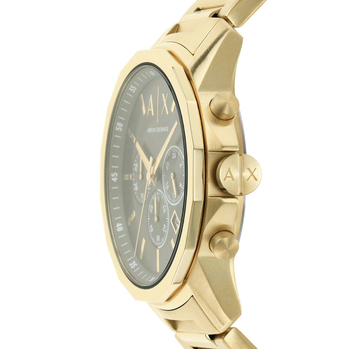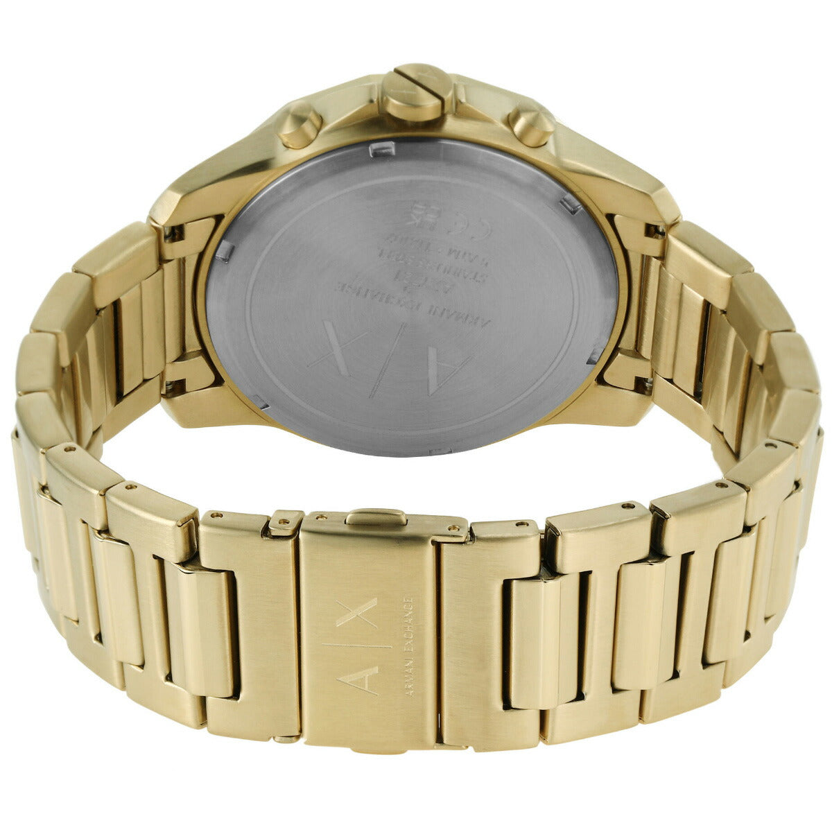 クロノグラフムーブメントを搭載したArmani Exchangeの44mmウォッチ。ゴールドトーンのバーインデックスを配したグレーのCDテクスチャー加工のサンレイダイアルに、ゴールドトーンのステンレススチール製バンドを組み合わせました。