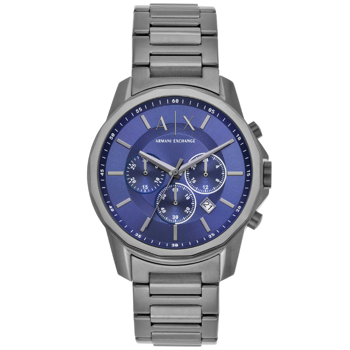 ステンレススチールを使用した44mm径ケースに、クロノグラフムーブメントを搭載したArmani Exchangeのウォッチ。CD仕上げを施したブルーのサンレイダイヤルに、ガンメタルトーンのステンレススチールブレスレットを組み合わせました。
