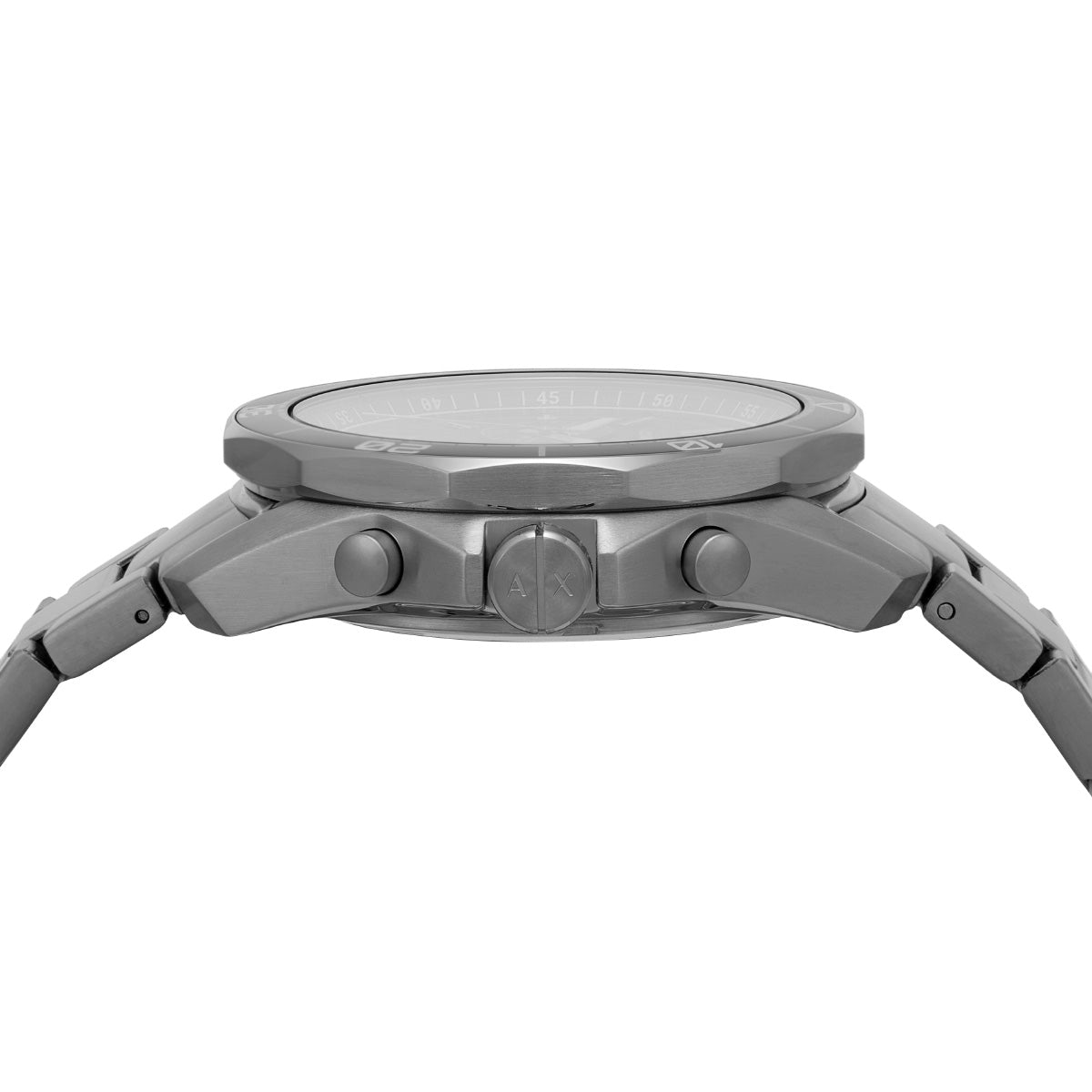 44mm径のケースにクロノグラフムーブメントを搭載したArmani Exchangeのウォッチ。質感のあるブラックダイヤルに、ガンメタルのステンレススチールブレスレットを組み合わせました。