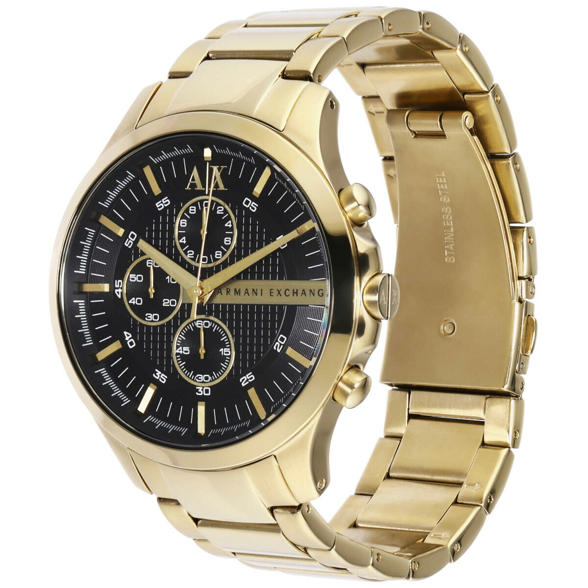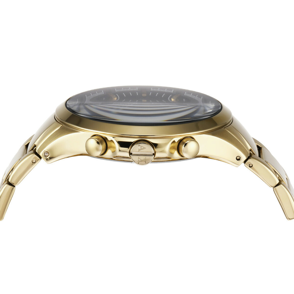 46mm径のケースにクロノグラフムーブメントを搭載したArmani Exchangeのウォッチ。質感のある艶消しのブラックダイヤルに、ゴールドトーンのステンレススチールブレスレットを組み合わせました。