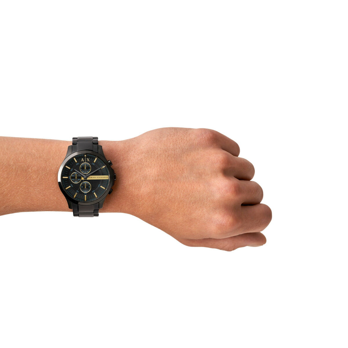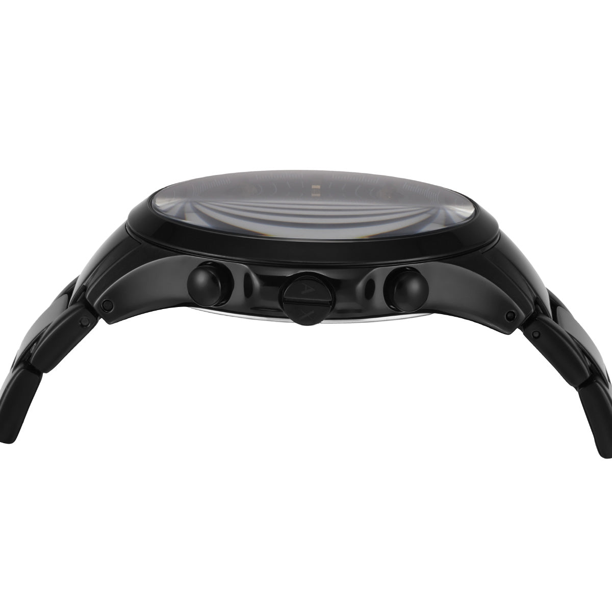46mm径のケースにクロノグラフムーブメントを搭載したArmani Exchangeのウォッチ。質感のある艶消しのブラックダイヤルに、ブラックのステンレススチールブレスレットを組み合わせました。