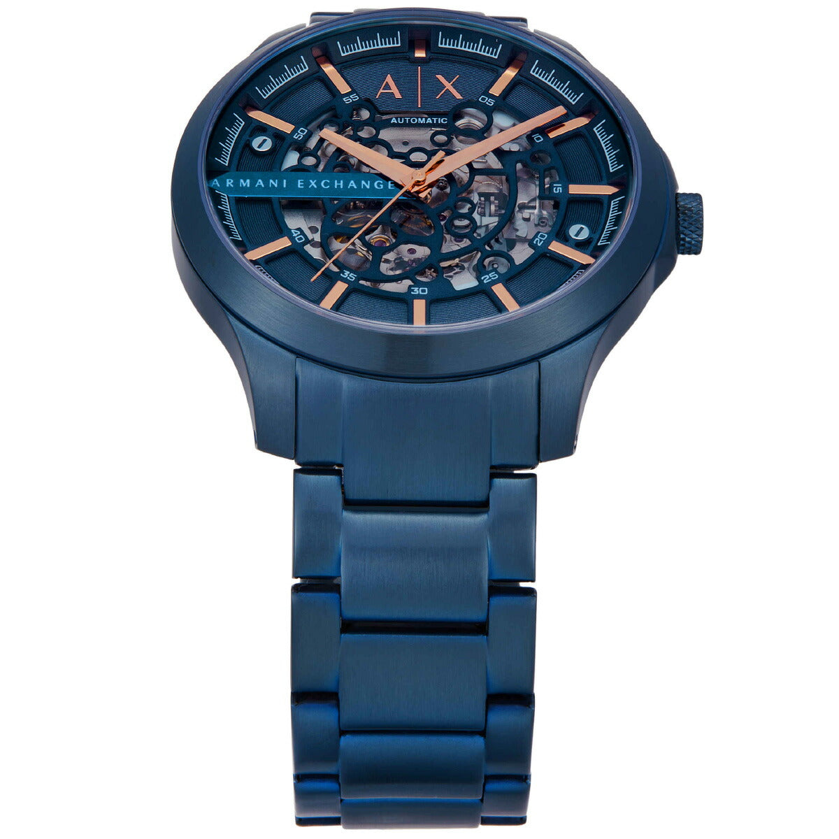 46mm径のケースに自動巻きムーブメントを搭載したArmani Exchangeのウォッチ。CD仕上げを施したブルーのダイヤルに、ブルーのステンレススチールブレスレットを組み合わせました。