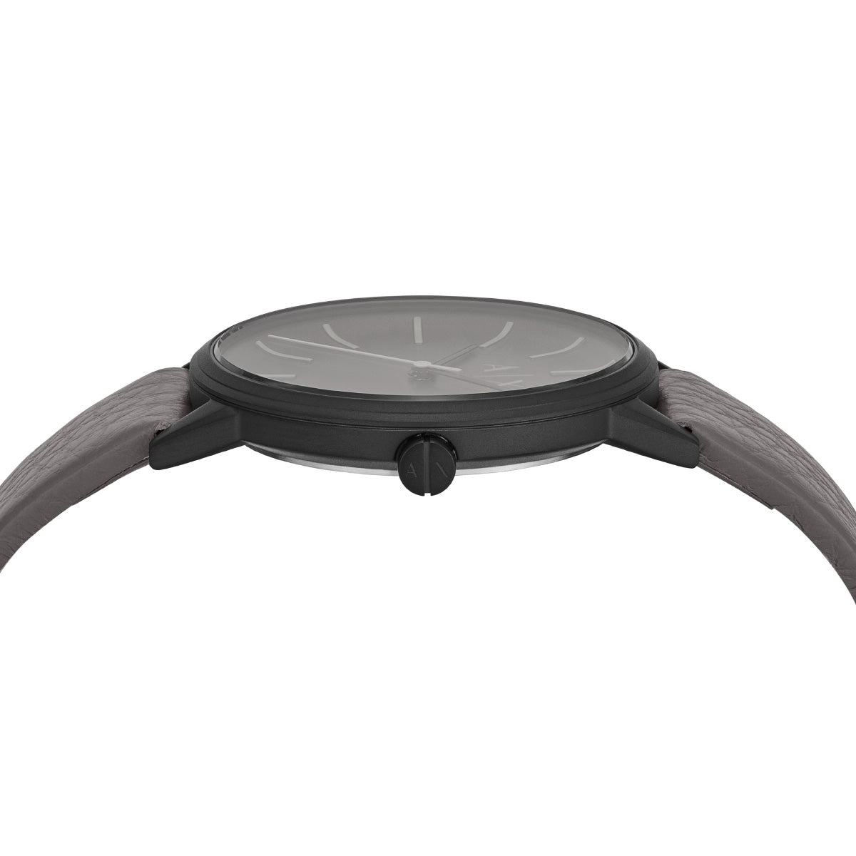 マットグレーのダイヤルと同系色のレザーストラップがシームレスにマッチした、洗練されたデザイン。ブラックのステンレススチール製ケースが微妙なコントラストを生み出し、モノトーンの色調を引き立てています。ミニマルなディテールと三針のクォーツムーブメントが、モダンな機能性と洗練されたシンプルさを融合させたルックを完成させています。