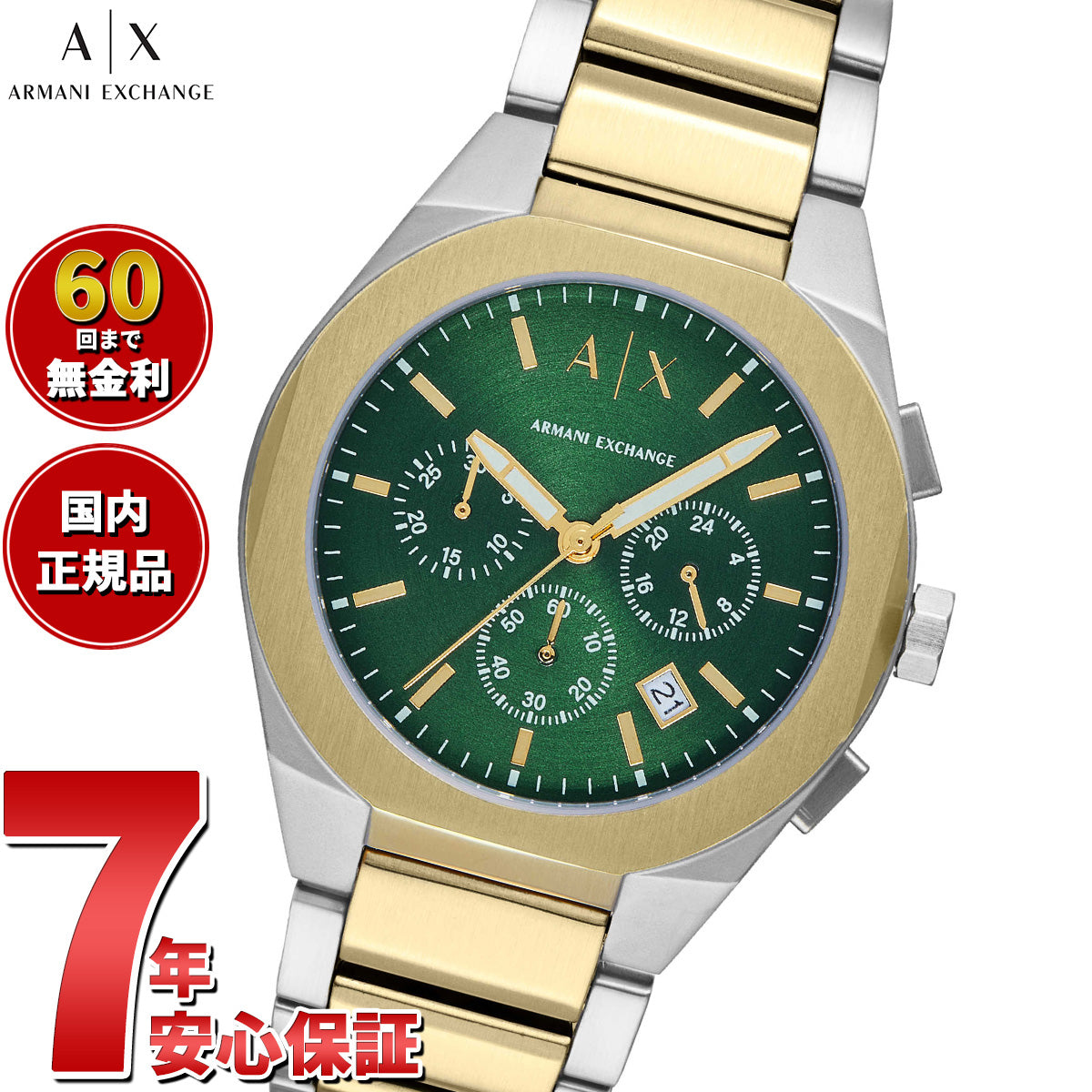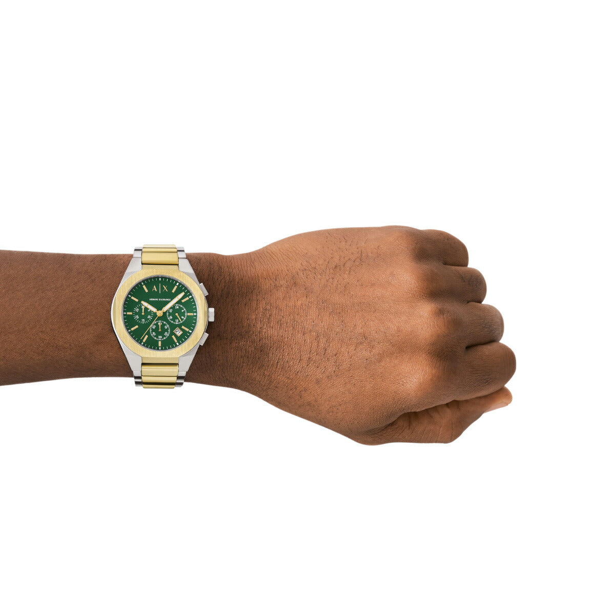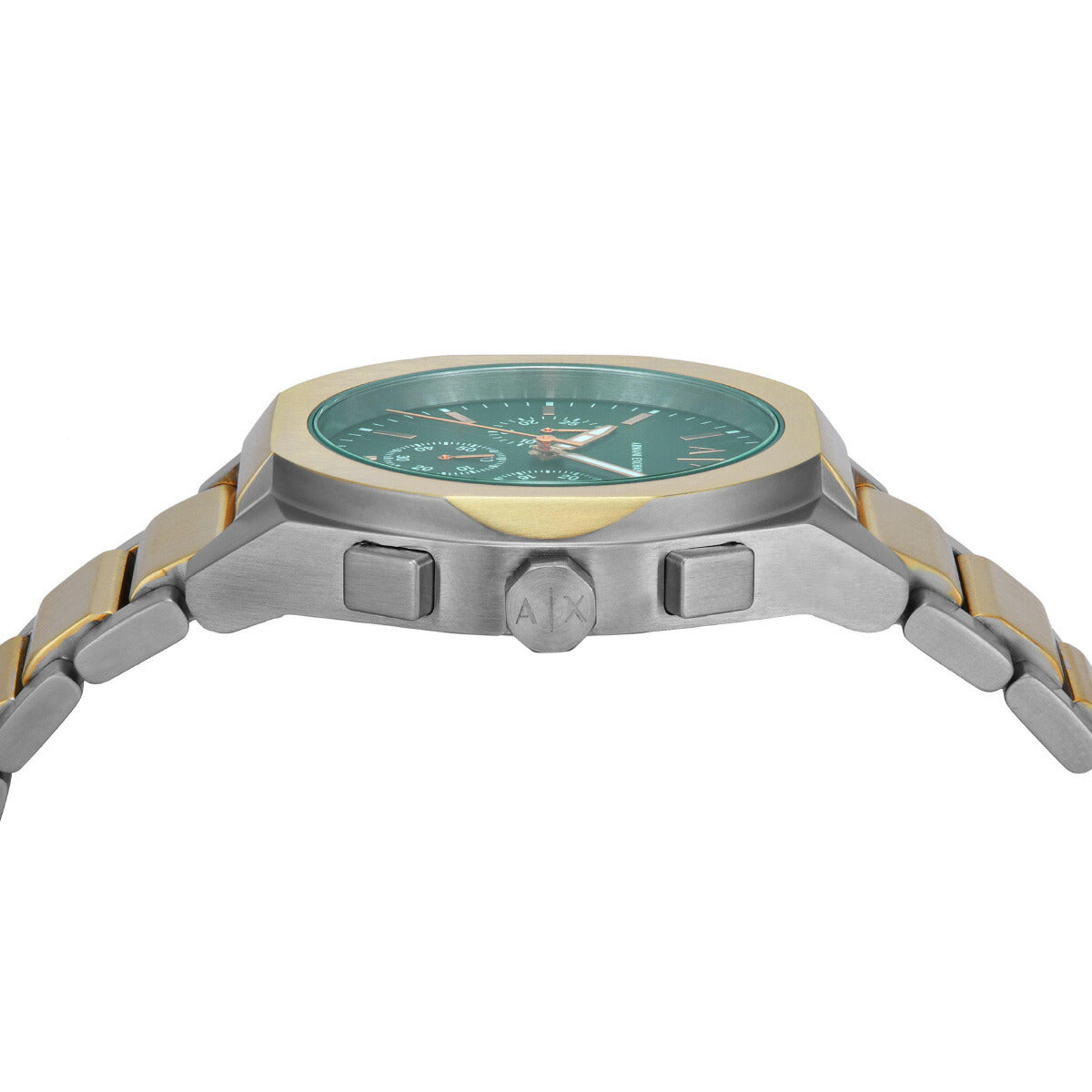 42mm径のケースにクロノグラフムーブメントを搭載したArmani Exchangeのウォッチ。グリーンのサンレイダイヤルに、ゴールドトーンが映えるツートーンのステンレススチールブレスレットを組み合わせました。