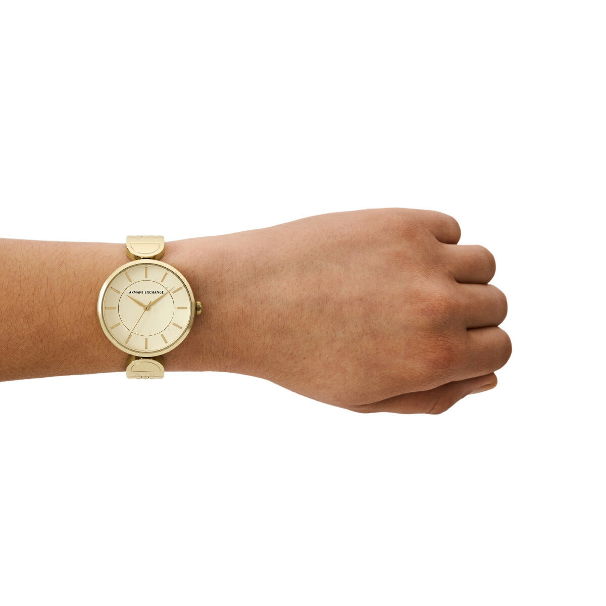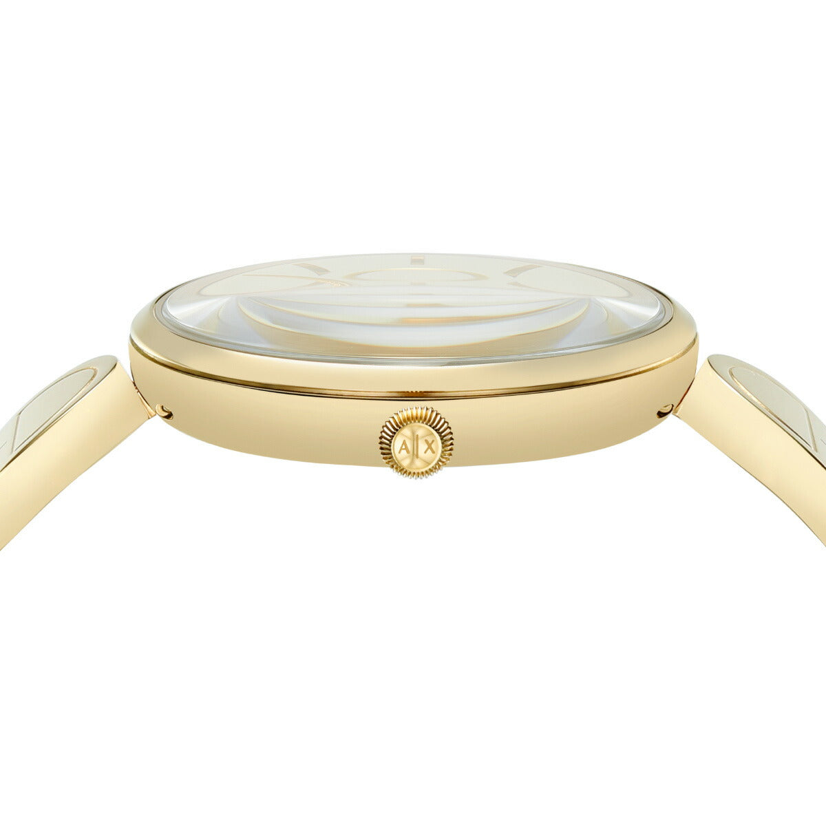 38mm径のケースに三針ムーブメントを搭載したArmani Exchangeのウォッチ。艶消し加工を施したクリームカラーのダイヤルに、ゴールドトーンのステンレススチールブレスレットを組み合わせました。
