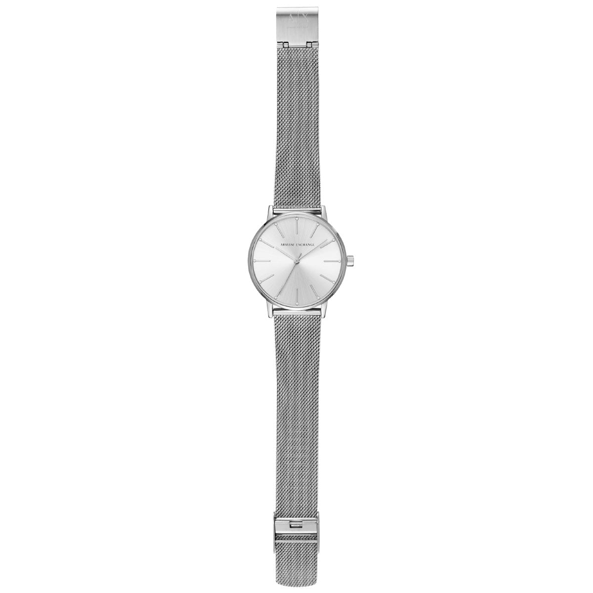 36mm径ケースに三針ムーブメントを搭載したArmani Exchangeのウォッチ。シルバートーンのサンレイダイヤルに、ステンレススチール製メッシュブレスレットを組み合わせました。