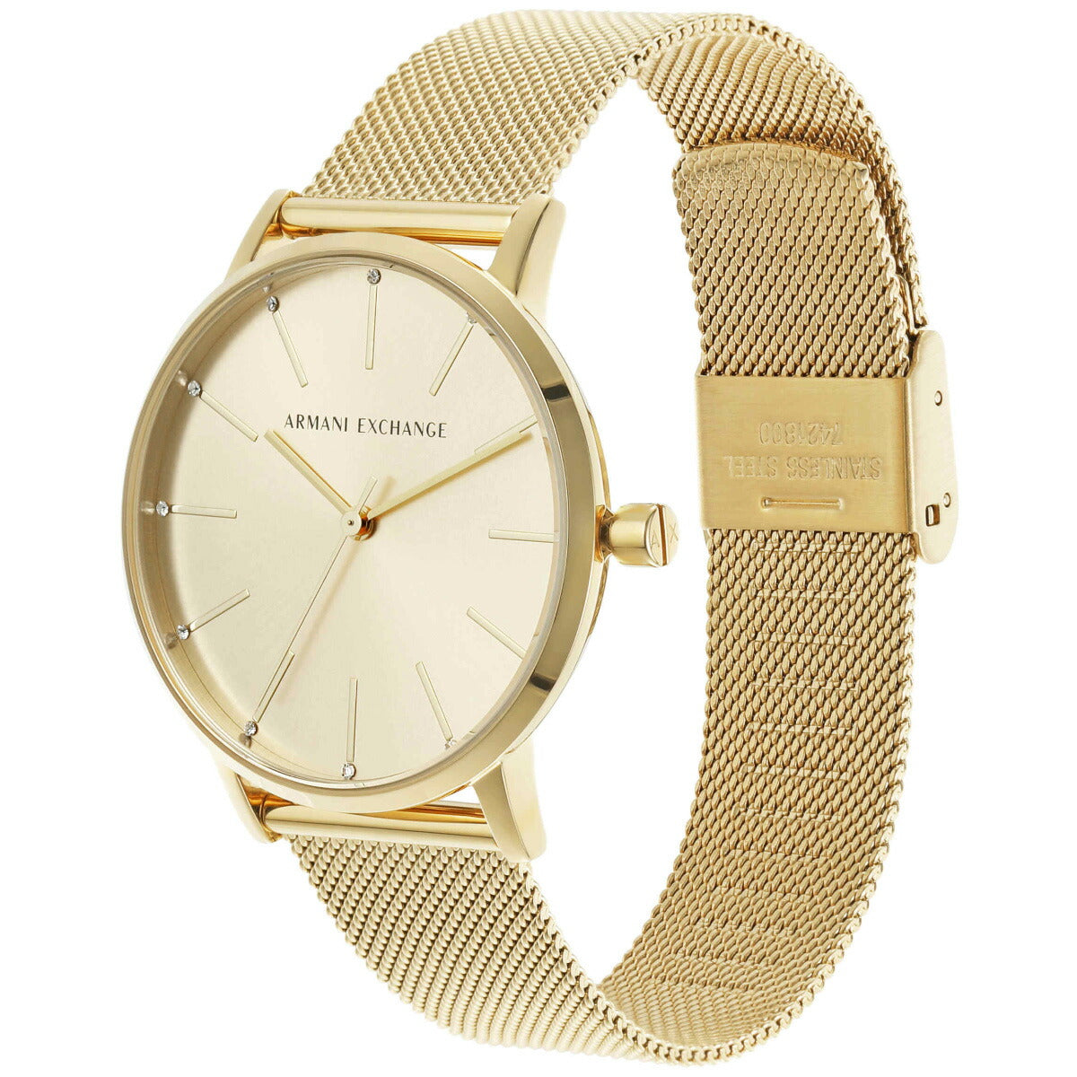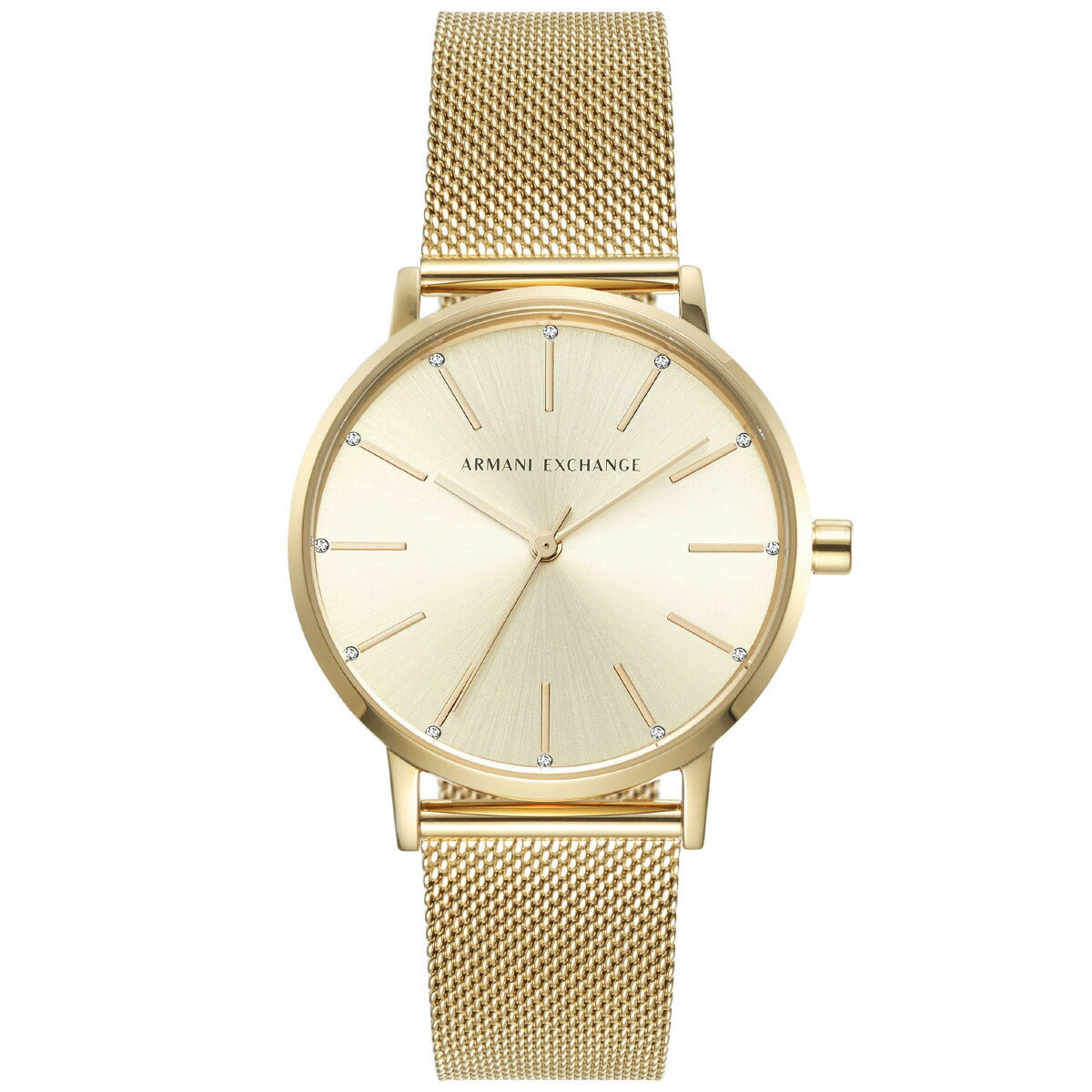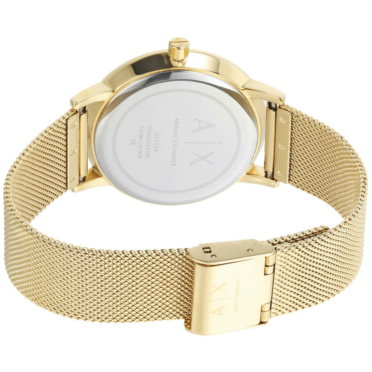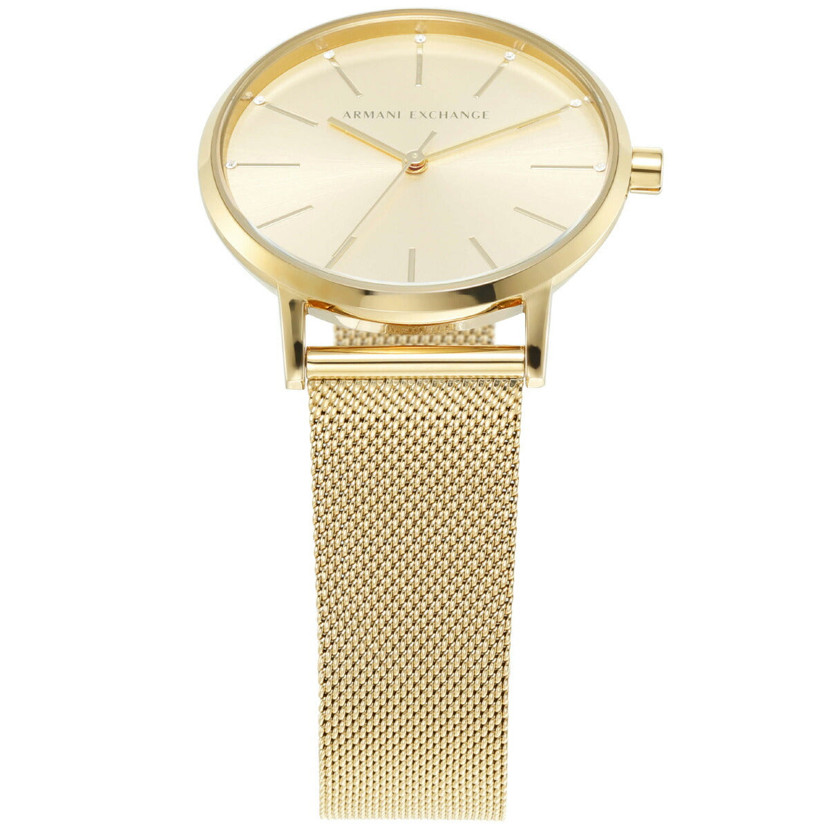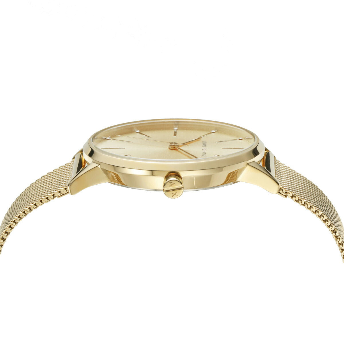 36mm径のケースに三針ムーブメントを搭載したArmani Exchangeのウォッチ。ゴールドトーンのサンレイダイヤルに、ゴールドトーンのステンレススチール製メッシュブレスレットを組み合わせました。
