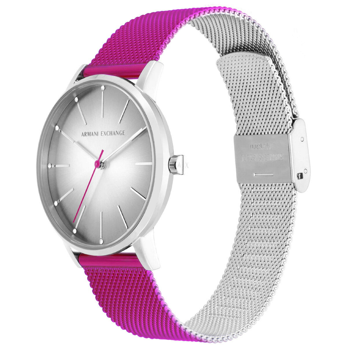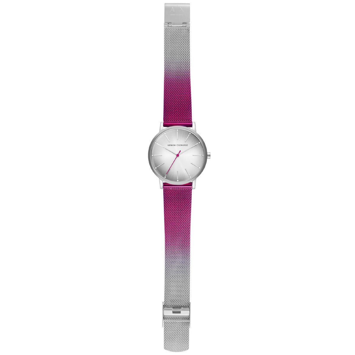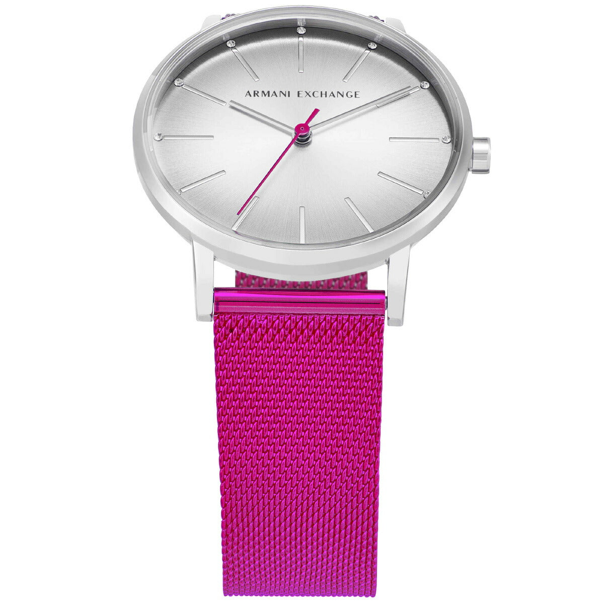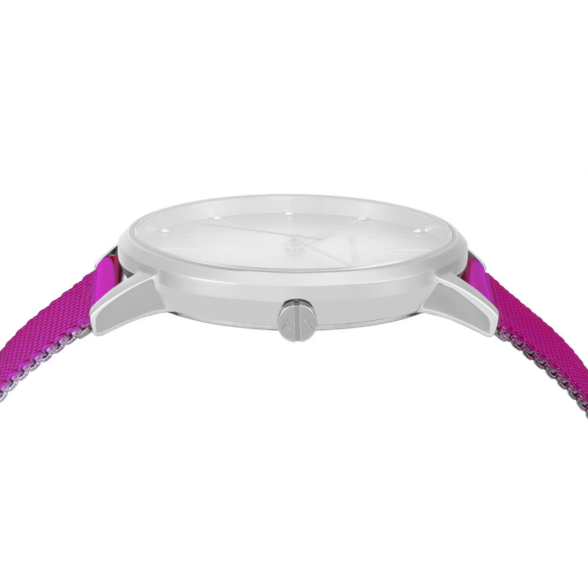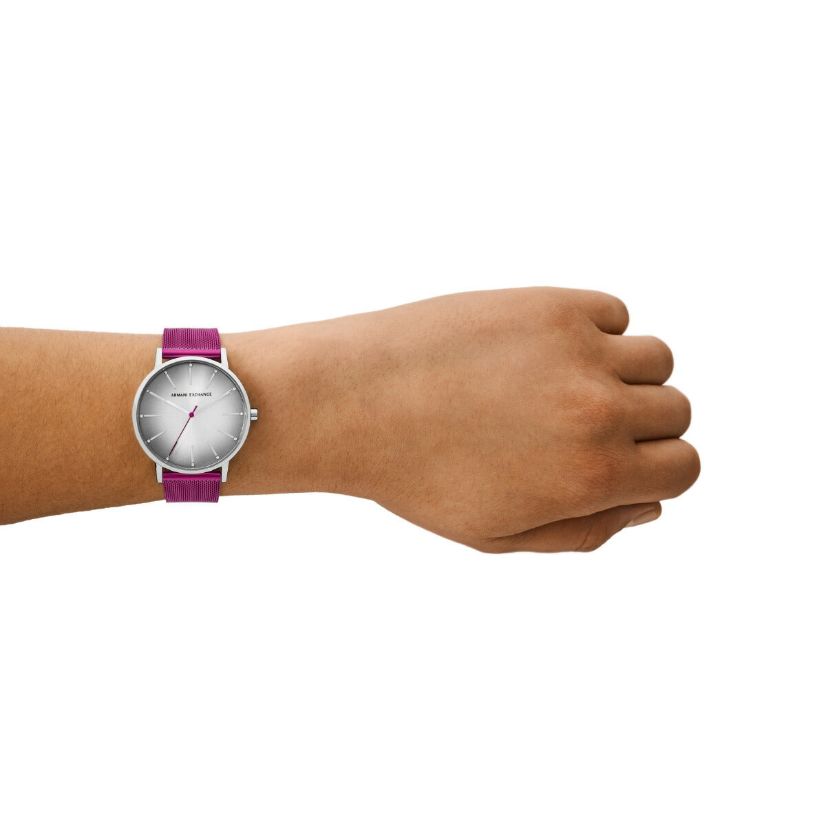 36mm径ケースに三針ムーブメントを搭載したArmani Exchangeのウォッチ。グレーのサンレイダイヤルに、ピンクのステンレススチール製メッシュストラップを組み合わせました。