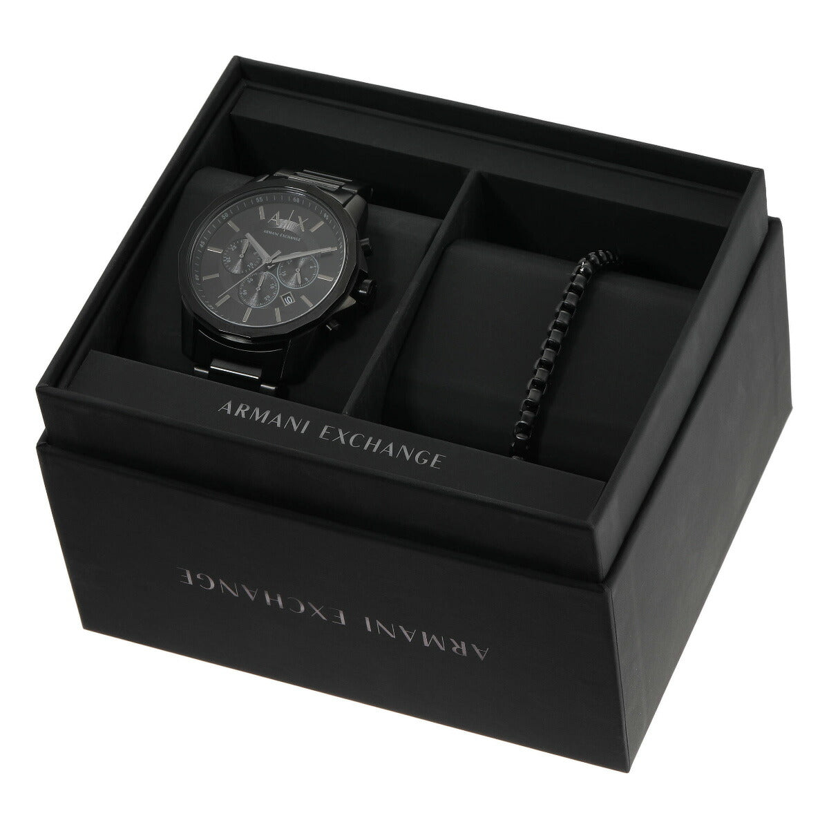 ブラックのステンレススチール製ブレスレットと44mm径のウォッチを組み合わせた、Armani Exchangeのギフトセット。クロノグラフムーブメントを搭載したウォッチは、CD仕上げを施したブラックのサンレイダイヤルと、ブラックのステンレススチールブレスレットが特徴のデザインです。