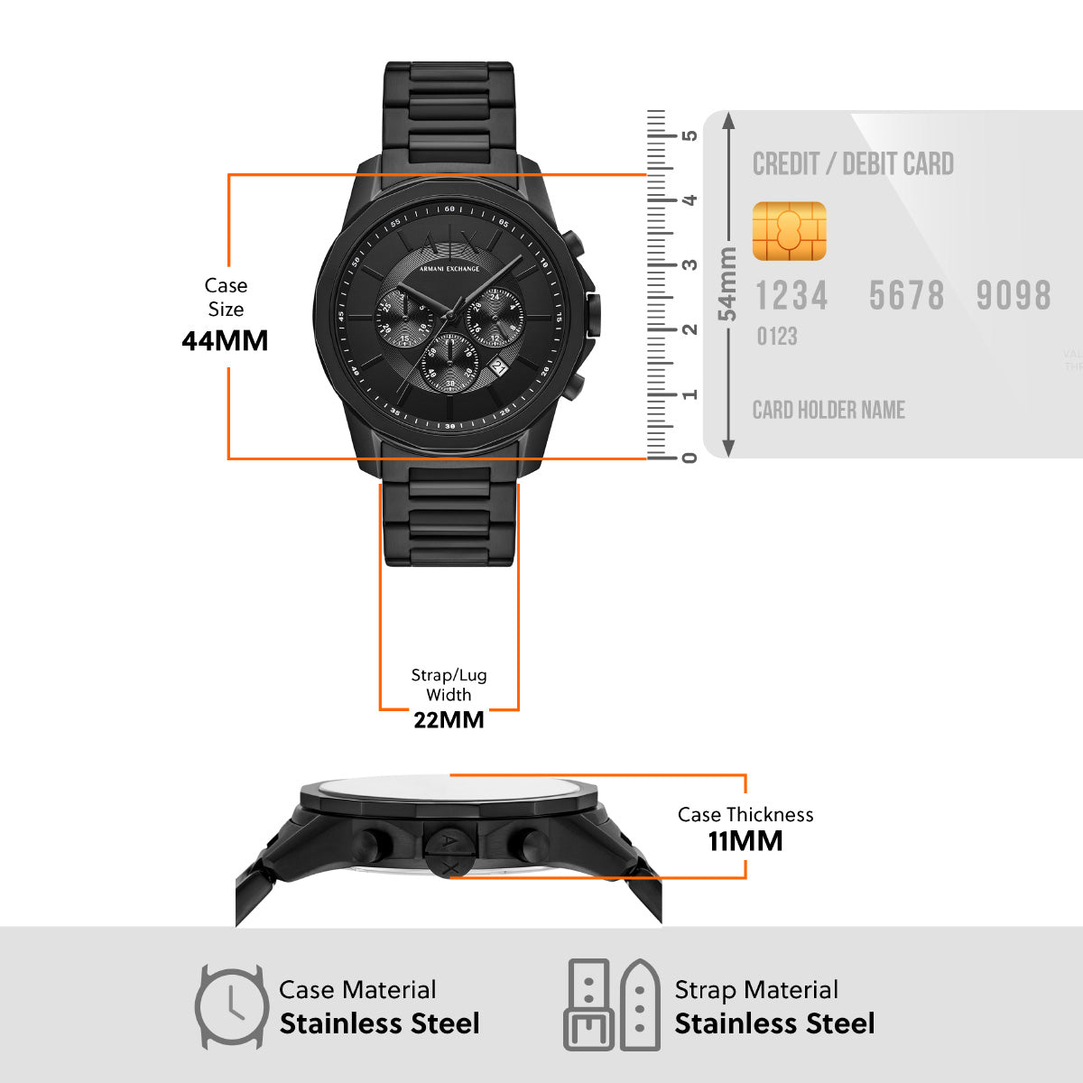 ブラックのステンレススチール製チェーンブレスレットと44mm径のウォッチを組み合わせたArmani Exchangeのギフトセット。ウォッチはクロノグラフムーブメントを搭載し、ブラックのサンレイダイヤルとブラックのステンレススチールブレスレットが特徴です。