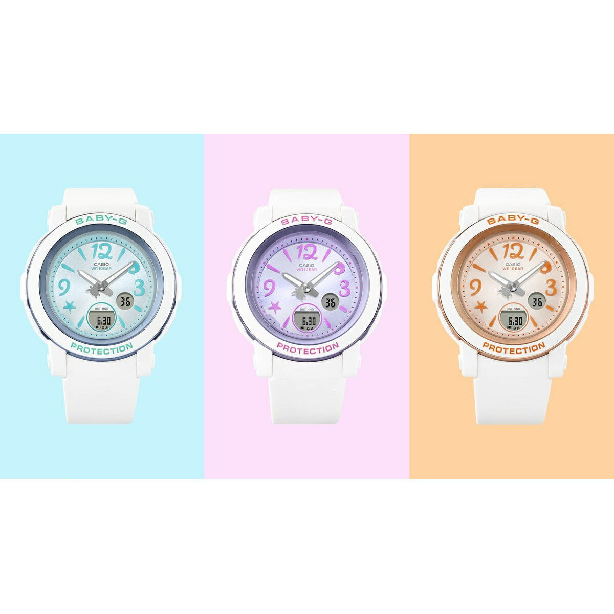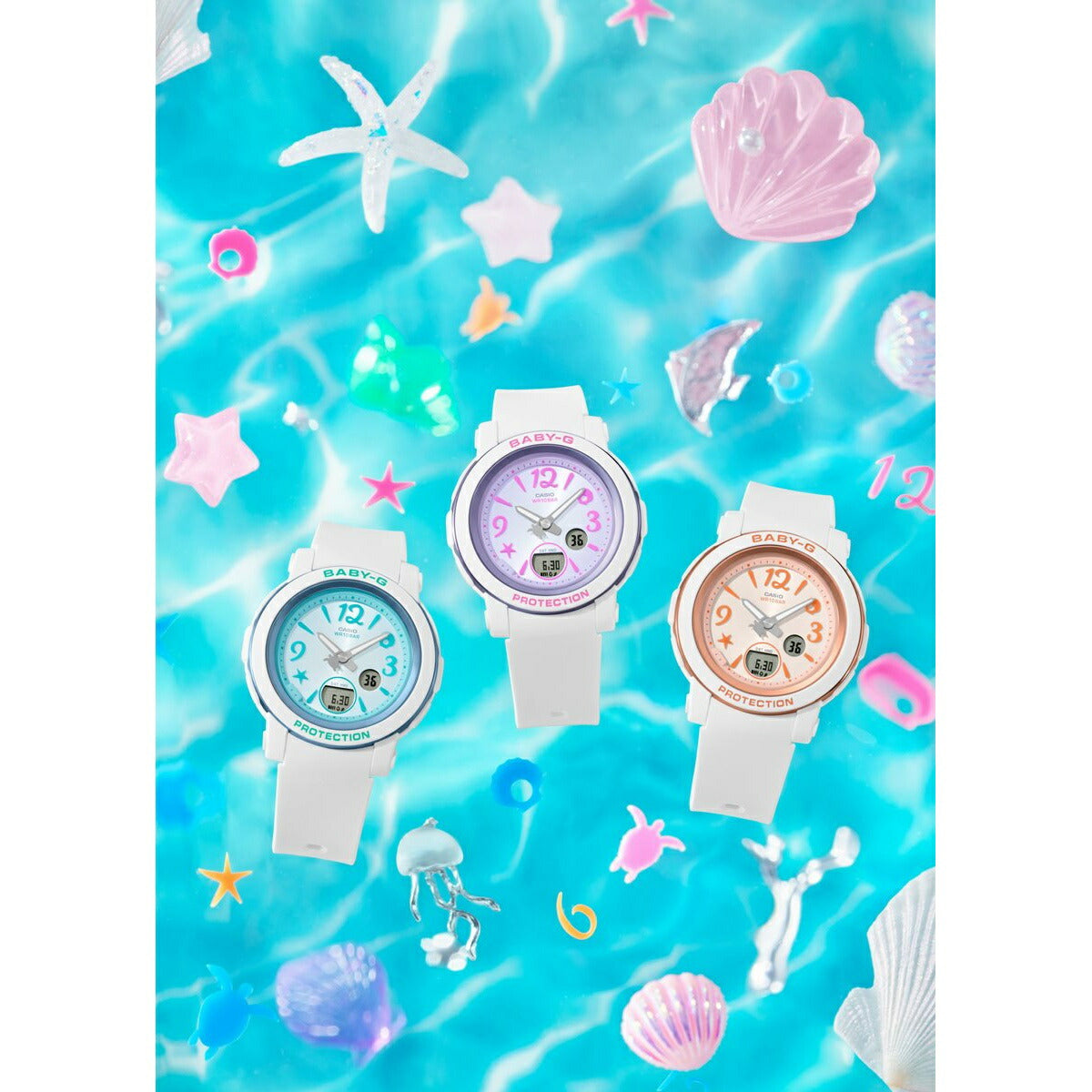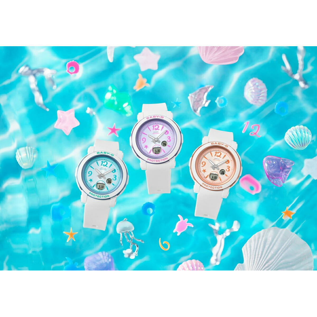 アクティブな女性のためのカジュアルウオッチBABY-Gから、海の中の鮮やかな世界観を表現したトロピカルカラーのウオッチです。ベースモデルはラウンドフェイスのアナログ・デジタルコンビネーションモデルBGA-290。南国の海をイメージしたカラーリングを採用し、夏らしいホワイトを基調に、ブルー、オレンジ、パープルの3色をラインアップ。ベゼルリングにも同系色を蒸着処理し、マットな質感の中にキラリと光るアクセントをプラス。ビーチスタイルの手元を、美しく鮮やかに彩ります。また、様々な生き物でにぎわう海の中を、フェイス全体で表現。海中に差し込む光をイメージしたメタリックカラーの文字板に、ウミガメ(分針)、真珠貝(2時位置)、ヒトデ(8時位置)をあしらい、ポップなデザインに仕上げました。インデックスは、シリコーン素材で立体的に造形。蓄光顔料を混ぜ込んでおり、暗所で光ります。機能面では耐衝撃構造や10気圧防水搭載で実用性も兼備しています。海の中をポップに表現したリゾート気分を盛り上げるBABY-Gです。