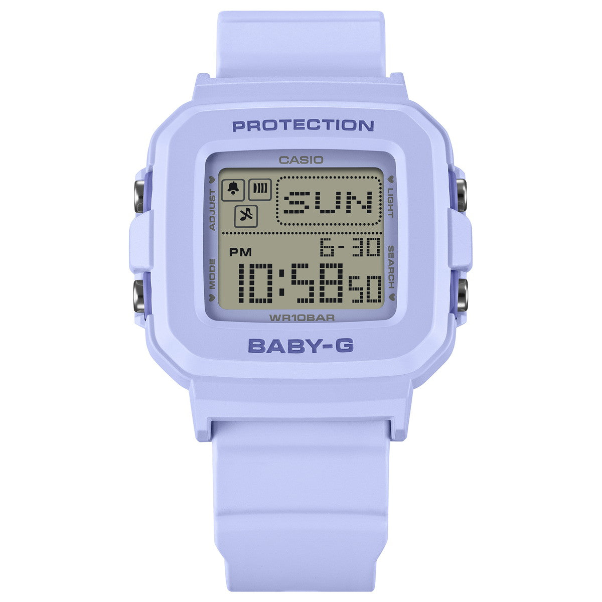 自分の好みに合わせて使い方が楽しめる「BABY-G+PLUS」シリーズから、ハート型の時計ホルダーを採用したポップなモデルです。手首に着けるだけでなく専用ホルダーにセンターケースをセットすれば、ユニークなチャームとしても活躍します。時計本体・ホルダー共にマット調のフレッシュなパステルカラーを採用した、キュートなデザインです。シリコーンの時計ホルダーはシールやデコレーションで自分仕様にアレンジも可能です。また、ライトを点灯すると液晶に可愛いハートが浮かび上がり、フェイスを楽しく演出します。耐衝撃構造はもちろん、10気圧防水機能も備えており、実用性も兼備しています。