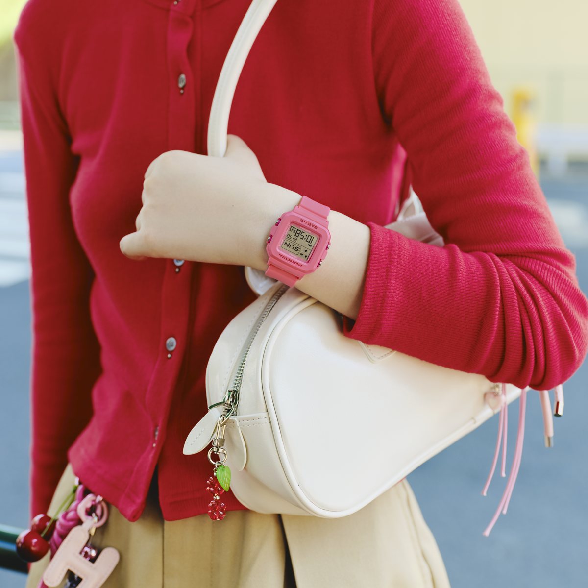 自分の好みに合わせて使い方が楽しめる「BABY-G+PLUS」シリーズから、ハート型の時計ホルダーを採用したポップなモデルです。手首に着けるだけでなく専用ホルダーにセンターケースをセットすれば、ユニークなチャームとしても活躍します。時計本体・ホルダー共にマット調のフレッシュなパステルカラーを採用した、キュートなデザインです。シリコーンの時計ホルダーはシールやデコレーションで自分仕様にアレンジも可能です。また、ライトを点灯すると液晶に可愛いハートが浮かび上がり、フェイスを楽しく演出します。耐衝撃構造はもちろん、10気圧防水機能も備えており、実用性も兼備しています。