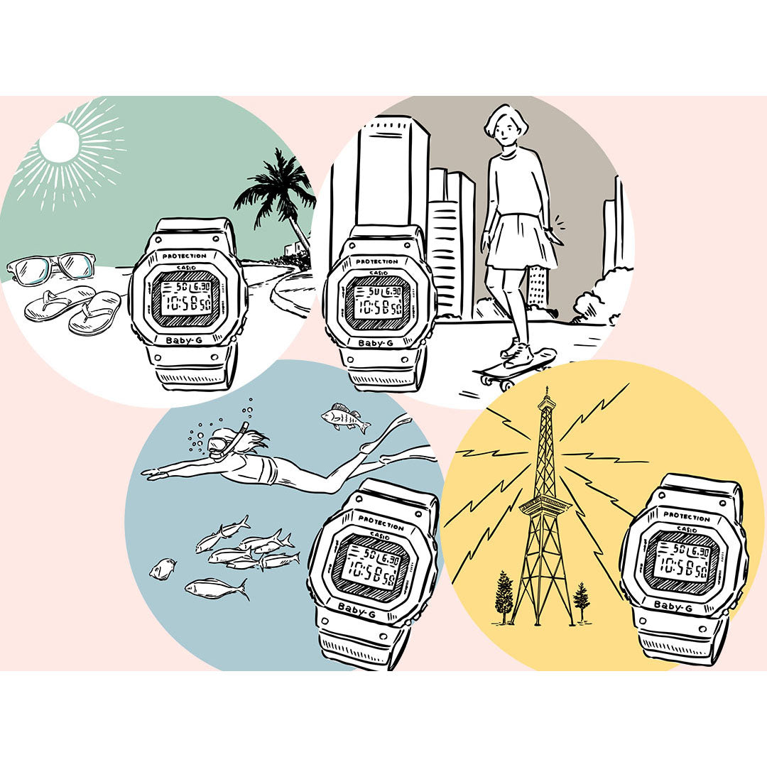 アクティブな女性に向けた耐衝撃・カジュアルウオッチBABY-Gから、春の季節にぴったりのフラワーカラーに彩られたモデルです。ベースモデルには、コンパクトなサイズが人気のBGD-565をセレクト。カラーは3色。それぞれ、「ライラック」「セージ」「桜」をイメージしてご用意しました。桜をイメージしたバイカラーモデルは、ホワイトとペールピンクで普段使いしやすい落ち着いた印象に。ダイアルには光沢感のあるパール塗装を施し、華やかさをプラス。春気分をより一層盛り上げてくれるウオッチです。