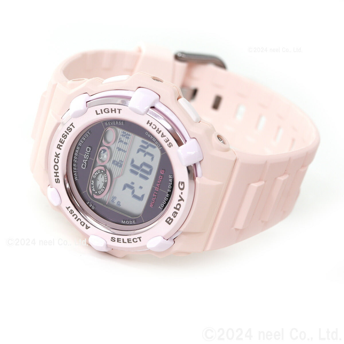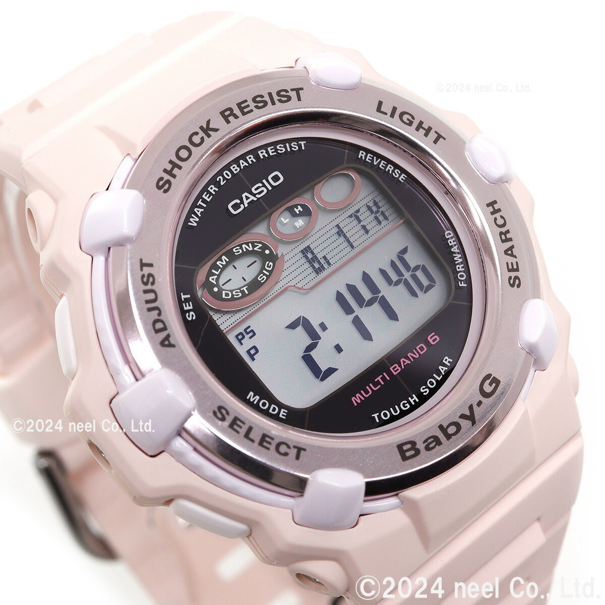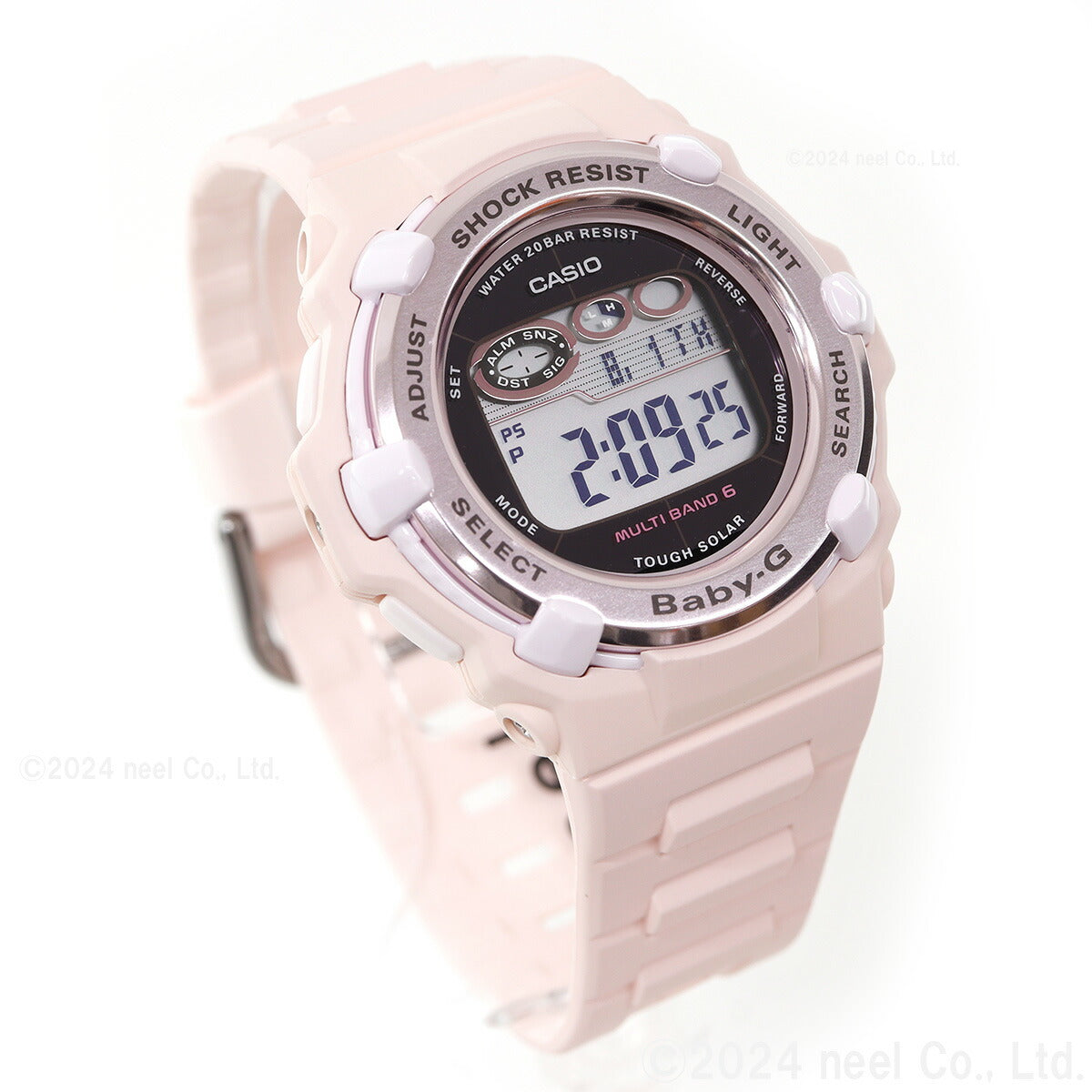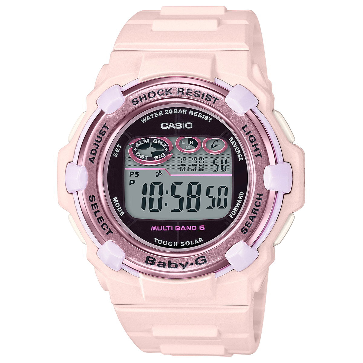 アクティブな女性のためのカジュアルウオッチBABY-G。薄型ラウンドフェイスのデジタルモデルです。ホーム都市設定を変えるだけで日本国内はもとより、海外でも時刻を自動修正します。機能面では、世界6局の標準電波に対応しタフソーラーも搭載。更に20気圧防水機能にも対応し実用性も兼ね備えました。ワールドタイムやストップウオッチなどの機能も充実。アクティブな女性をサポートするモデルです。