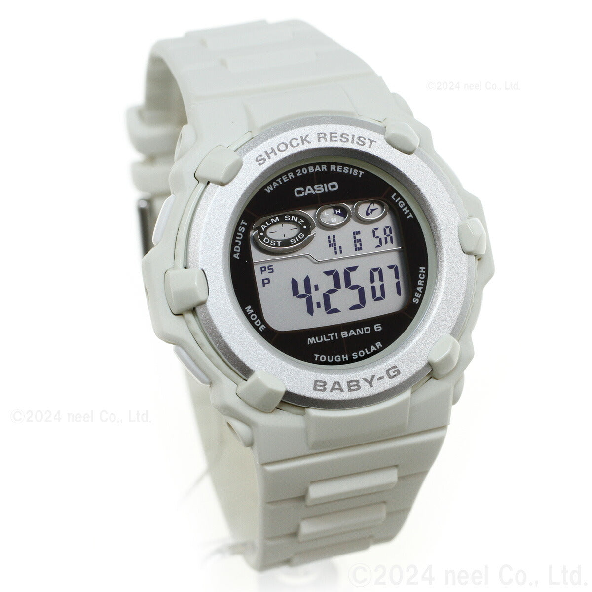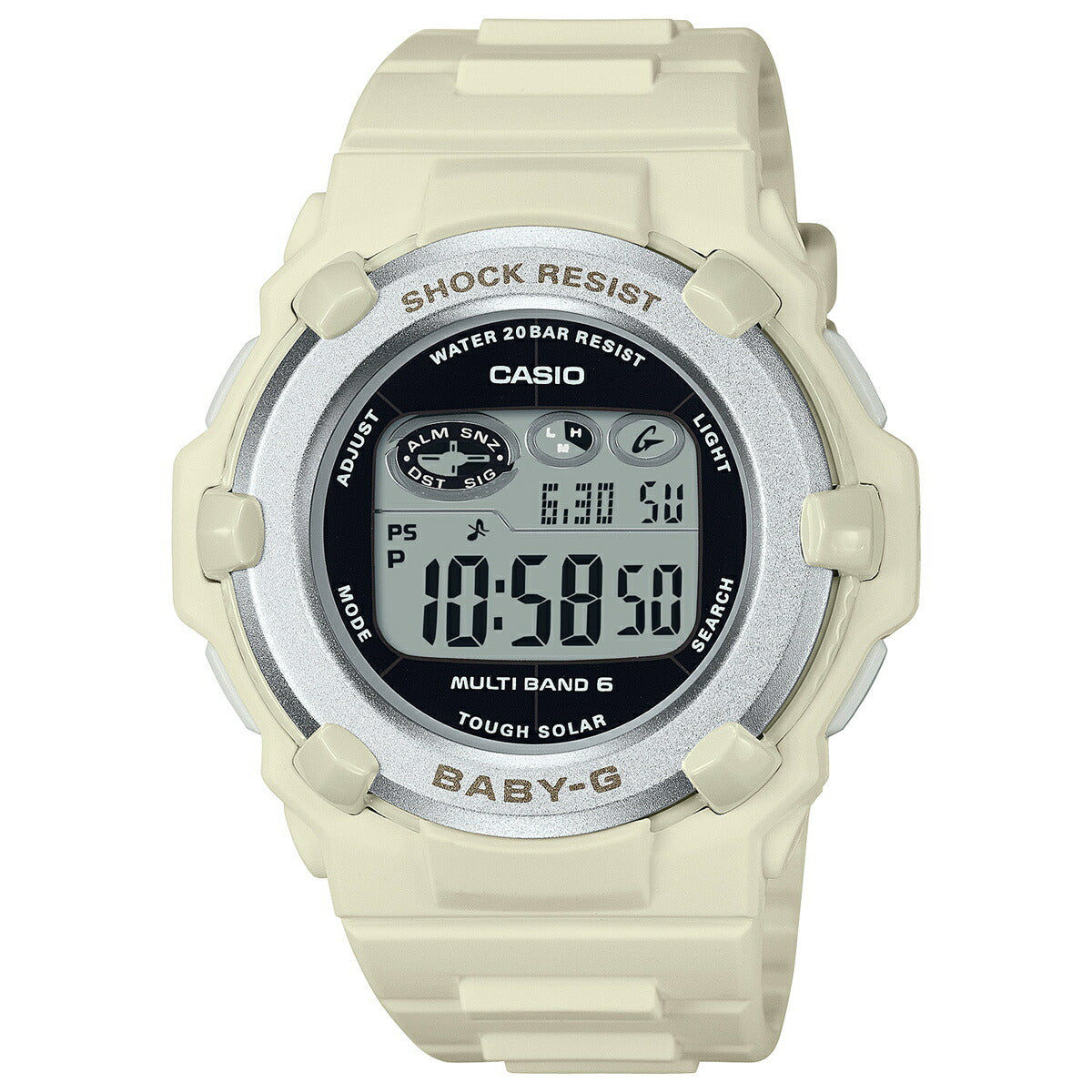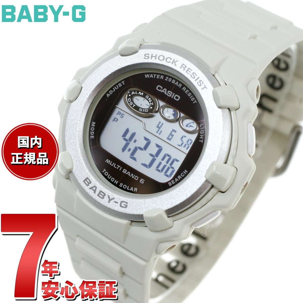 アクティブな女性のためのカジュアルウオッチBABY-G。シンプルで様々なファッションに合わせやすい薄型ラウンドフェイスのデジタルモデルです。カラーはベーシックなホワイト。季節を問わず幅広いファッションに合わせやすいデザインです。機能面では、世界6局の標準電波に対応し、ホーム都市設定を変えるだけで日本国内はもとより、海外でも時刻を自動修正します。また、タフソーラーも搭載。更に20気圧防水機能にも対応し実用性も兼ね備えました。アクティブな女性をサポートするモデルです。