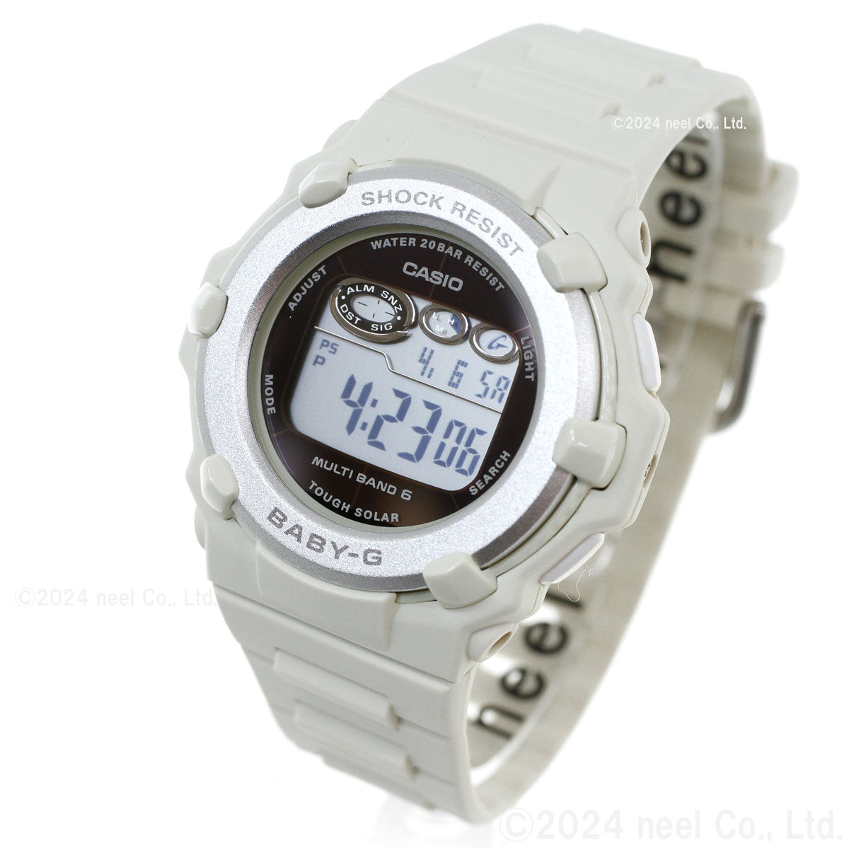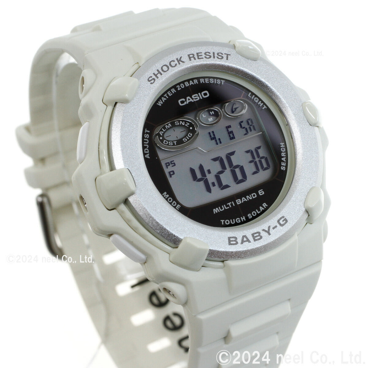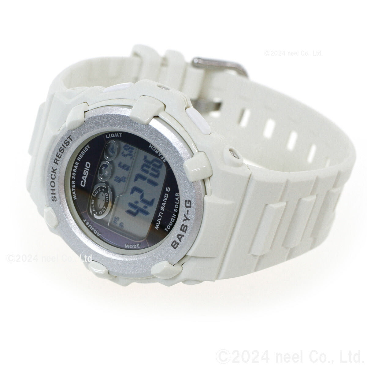 アクティブな女性のためのカジュアルウオッチBABY-G。シンプルで様々なファッションに合わせやすい薄型ラウンドフェイスのデジタルモデルです。カラーはベーシックなホワイト。季節を問わず幅広いファッションに合わせやすいデザインです。機能面では、世界6局の標準電波に対応し、ホーム都市設定を変えるだけで日本国内はもとより、海外でも時刻を自動修正します。また、タフソーラーも搭載。更に20気圧防水機能にも対応し実用性も兼ね備えました。アクティブな女性をサポートするモデルです。