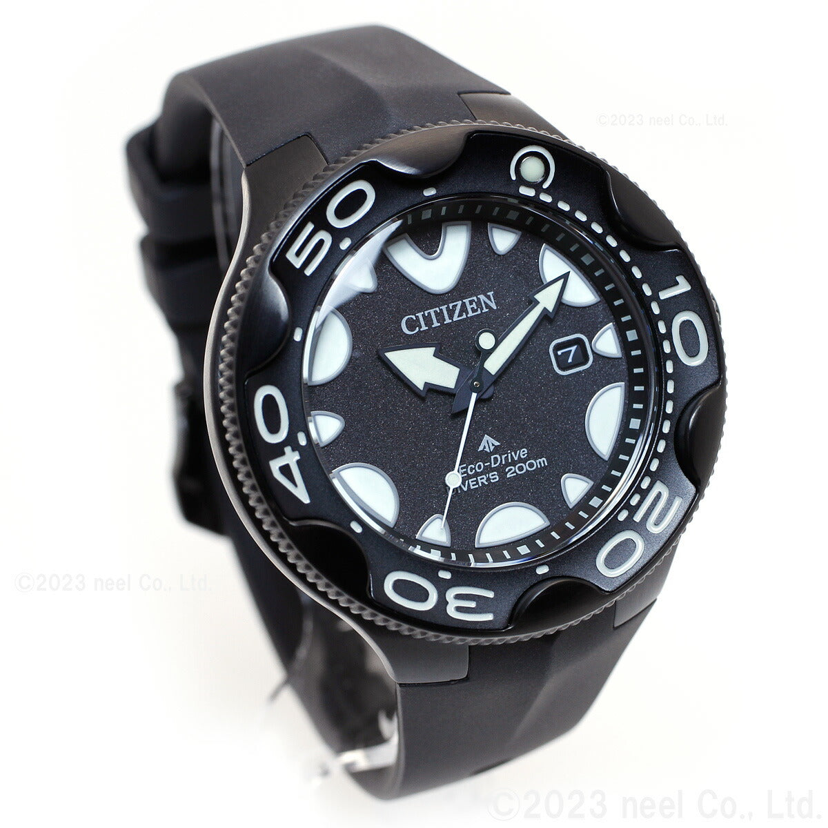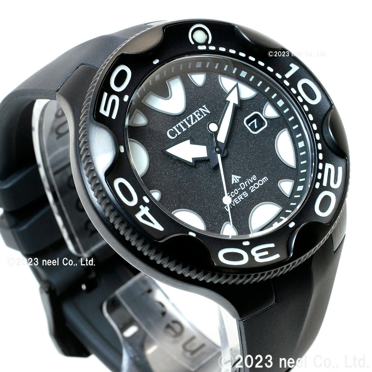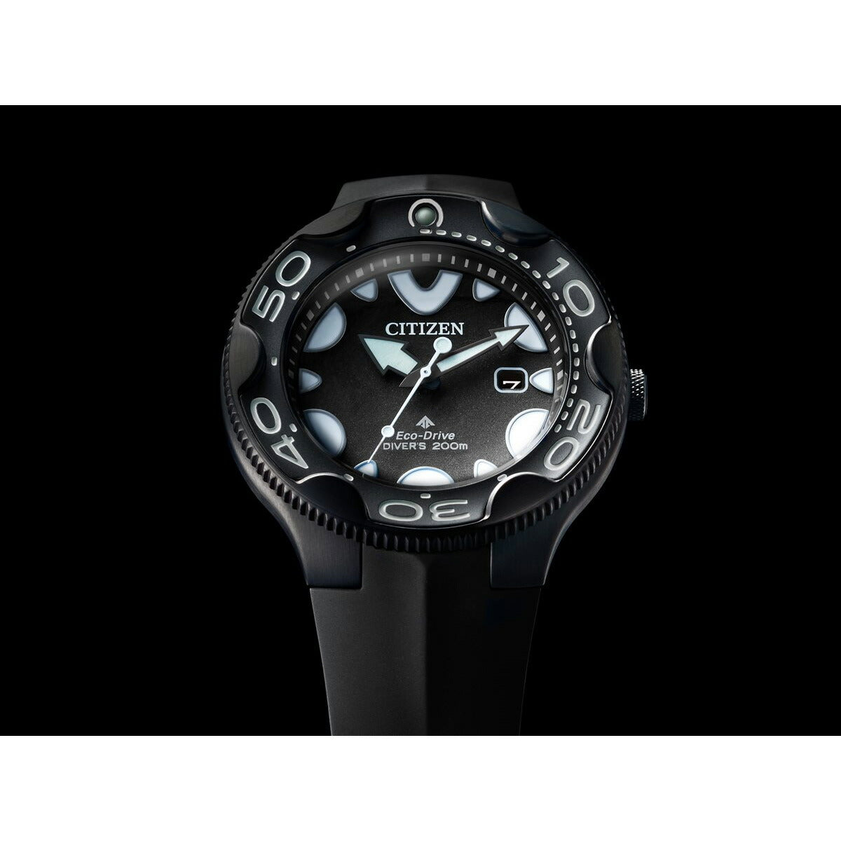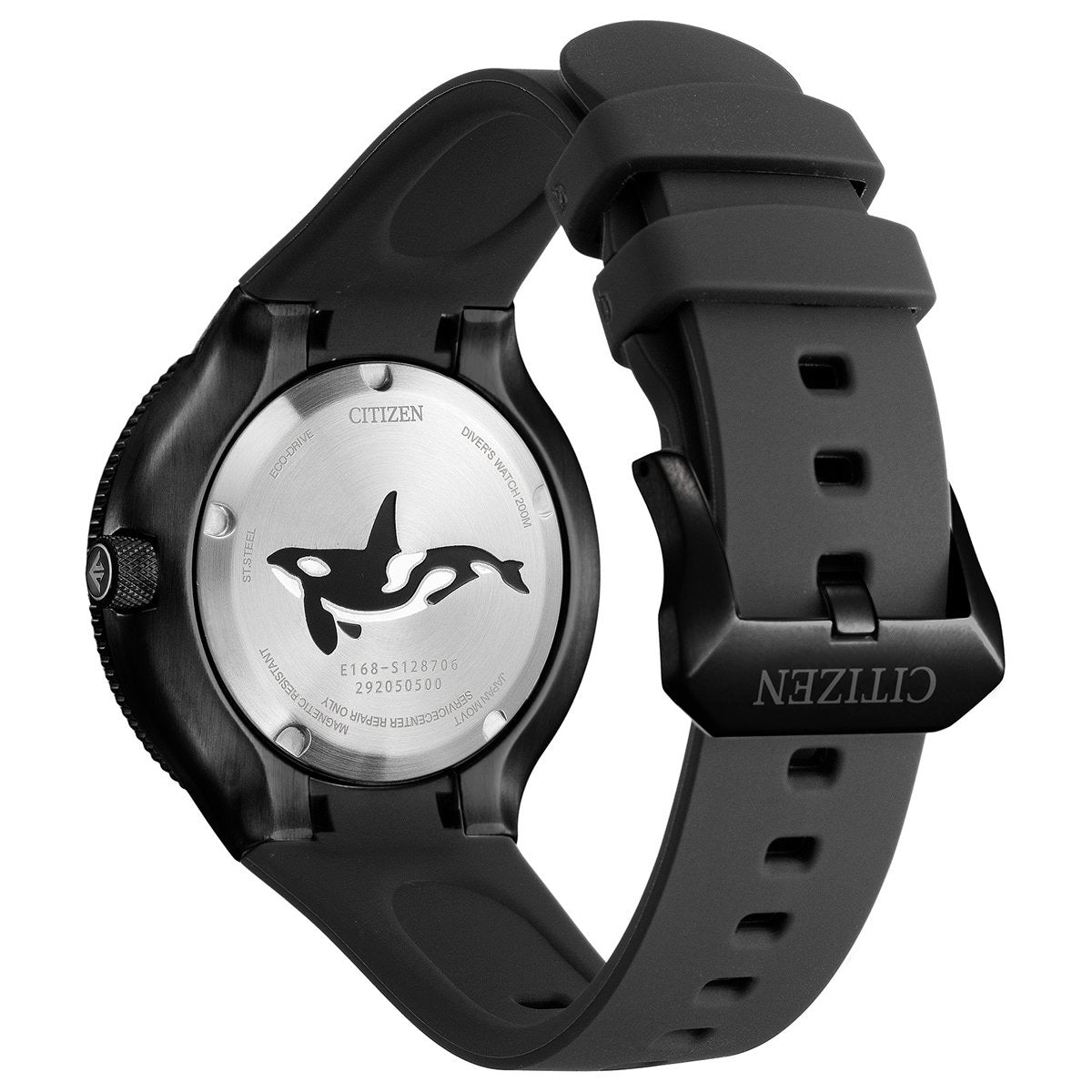 機能性、耐久性、安全性を兼ね備えた本格スポーツウオッチ、シチズン PROMASTER(プロマスター)。海外で人気を集めてきたダイバーズウオッチが日本初登場。オルカをモチーフにした独創的なデザインが視線を惹きつけます。2022年度グッドデザイン賞受賞。これまで海外モデルとして海外で人気を集めてきたダイバーズウオッチが日本初登場です。オルカ(シャチ)をモチーフにした独創的なデザイン。オルカのフォルムのような流線型のケースラインやふっくらとした時分針、オルカが水面に上がった際の背中をイメージしたウレタンバンドなど、ディテールにもこだわっています。12時の位置と奇数時のインデックスは、オルカが水面から顔を出す際のシルエットをイメージしています。裏ぶたには、雄大なオルカが泳ぐ姿のマーキングが入っています。