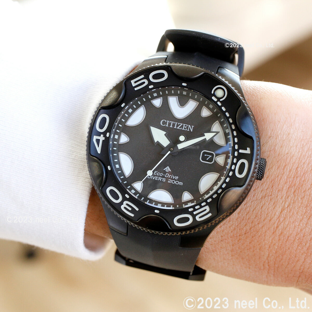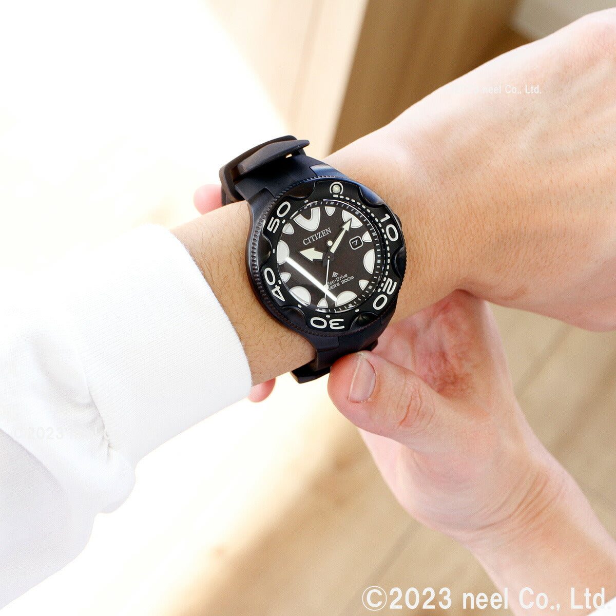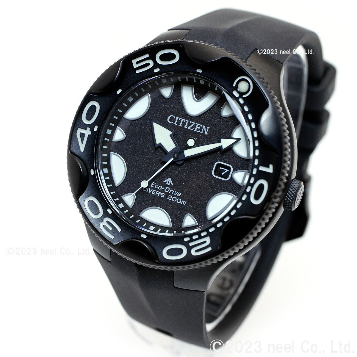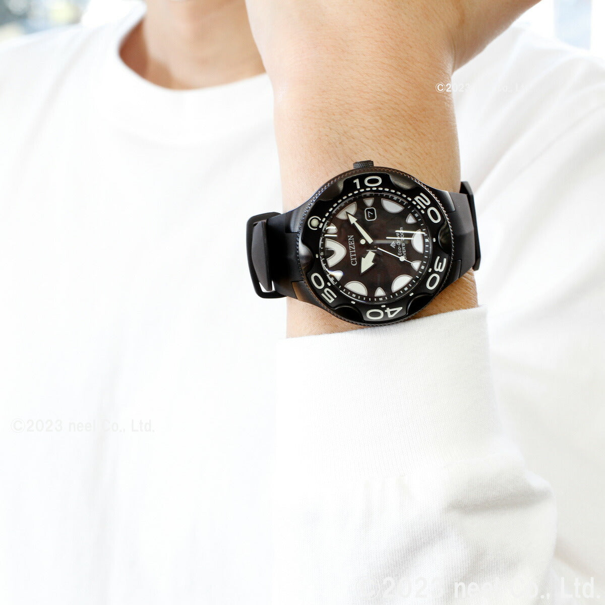 機能性、耐久性、安全性を兼ね備えた本格スポーツウオッチ、シチズン PROMASTER(プロマスター)。海外で人気を集めてきたダイバーズウオッチが日本初登場。オルカをモチーフにした独創的なデザインが視線を惹きつけます。2022年度グッドデザイン賞受賞。これまで海外モデルとして海外で人気を集めてきたダイバーズウオッチが日本初登場です。オルカ(シャチ)をモチーフにした独創的なデザイン。オルカのフォルムのような流線型のケースラインやふっくらとした時分針、オルカが水面に上がった際の背中をイメージしたウレタンバンドなど、ディテールにもこだわっています。12時の位置と奇数時のインデックスは、オルカが水面から顔を出す際のシルエットをイメージしています。裏ぶたには、雄大なオルカが泳ぐ姿のマーキングが入っています。
