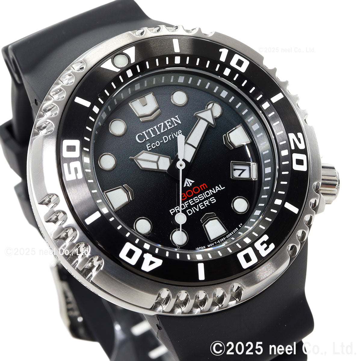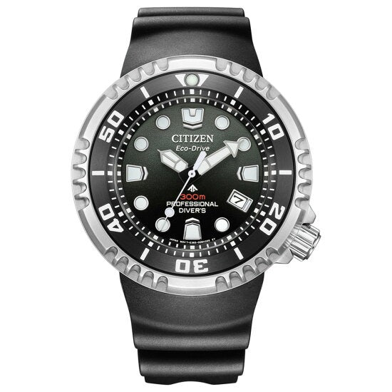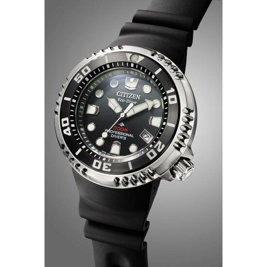 機能性、耐久性、安全性を兼ね備えた本格スポーツウオッチ、シチズン PROMASTER(プロマスター)。人気モデルBN015シリーズをベースにアップデート。デザイン、機能、耐久性、すべてを進化させた飽和潜水モデルの新作です。ケースの2時側に、時計の破損を防ぎ、ダイバーを守る機構「ヘリウムエスケープバルブ」を設置した300m防水。ダイバーモデル初のCal.E365を搭載し、光が届かない深海の環境下でもフル充電から1年間駆動し続けます。りゅうず、りゅうずガード、インデックス、時分針はBN015シリーズのデザインを踏襲。立体感と迫力がきわだつステンレス製の回転ベゼルを採用し、ベゼルリングは操作が容易な120クリックにスペックアップ。ウレタンバンドには、ひび割れや破損が起こりにくく、環境に配慮した樹脂素材「BENEBiOL(TM)」を採用しました。文字板は、艶感のあるブラック。高性能ムーブメント搭載により、従来よりも透過率を抑えた濃色が可能になりました。2色とも、深海をイメージしたグラデーションをうっすらと施し、シンプルでありながらも重厚で力強い印象に仕上げています。飽和潜水モデルの証として、裏ぶたに潜水用ヘルメットの柄、ケースの9時側に「300m PROFESSIONAL DIVER'S」の文字が刻印されています。