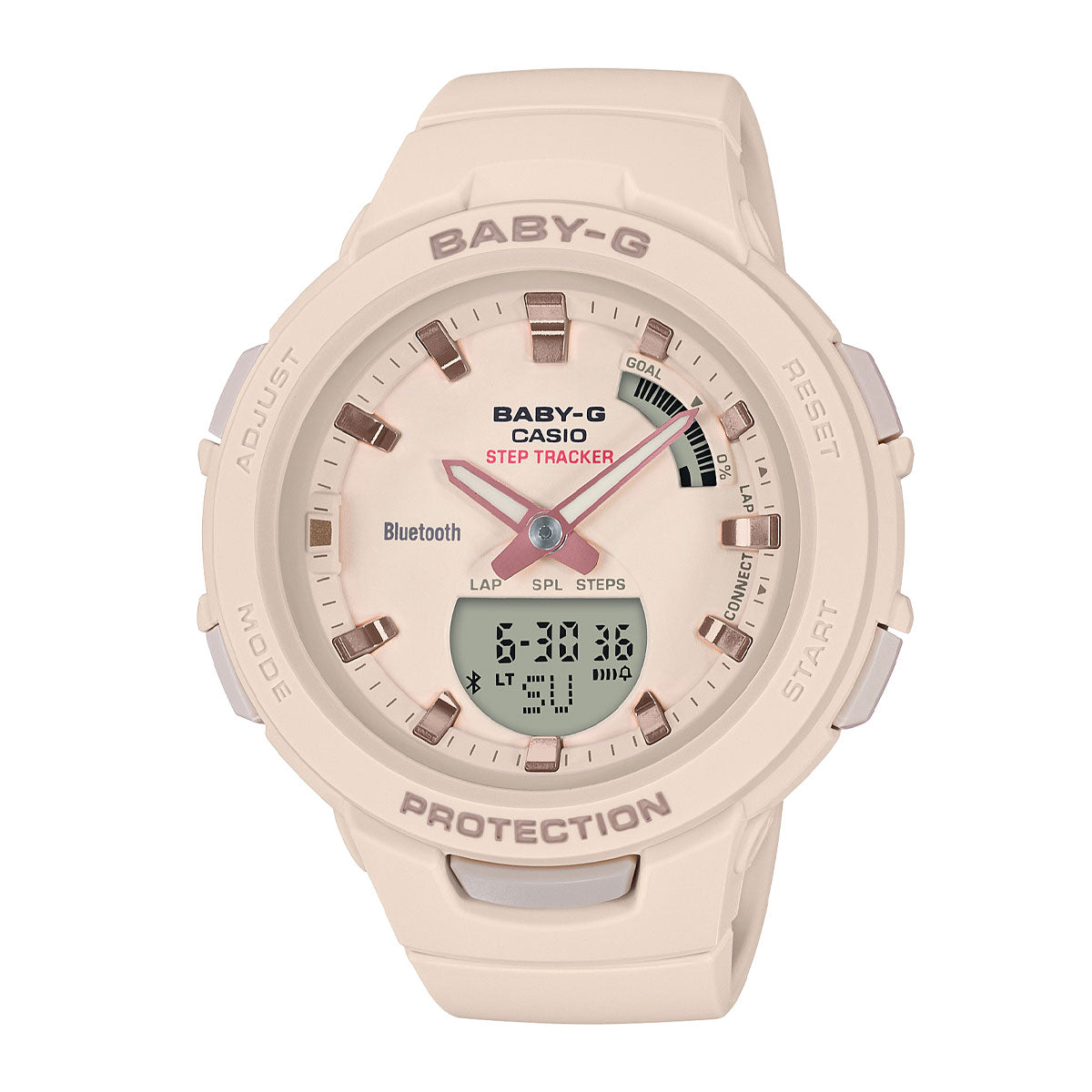 アクティブな女性のためのカジュアルウオッチBABY-Gから、日常の運動やトレーニングを快適にサポートするNewスポーツライン「G-SQUAD(ジー・スクワッド)」が登場します。アスレジャーウェアと相性の良い、マットな質感で女性らしいカラーリングをラインアップ。ベーシックなオールブラック・オールホワイトを始め、ネイビー・ベージュ・ラベンダーカラーには蒸着仕上げを施した華やかなピンクゴールドのインデックスを組み合わせ、スタイル・好みによって選べるデザインです。また、運動時の妨げにならないようケースも薄型化。暗所でのワークアウトにも役立つオートダブルLEDライトも搭載し実用性を備えます。3軸加速度センサーによる歩数計測機能、最大5本×20セットの計測が可能なタイマー、ラップメモリー最大200本、一定時間の間に歩数が少ないとお知らせするステップリマインダー機能など、日常の健康管理やスポーツ時に役立つ機能を搭載。また、BABY-G初となる、スマートフォンリンク機能が搭載され、Bluetooth通信による専用アプリケーション「BABY-G Connected」との連携で、日々の活動記録管理や運動設定がスマートフォン側からの簡単操作で実現しました。カロリー算出や目標歩数設定、更にタイマーメニュー作成+転送、5段階運動強度付歩数ログ、ストップウオッチ計測データ保管、カレンダーでのデータ一括確認などが可能です。アプリ連携により、自動時刻修正など時計本来の機能も追求しています。女性のアクティブで健康的な日常を、役立つ機能と爽やかなデザインで応援する、New BABY-Gの登場です。