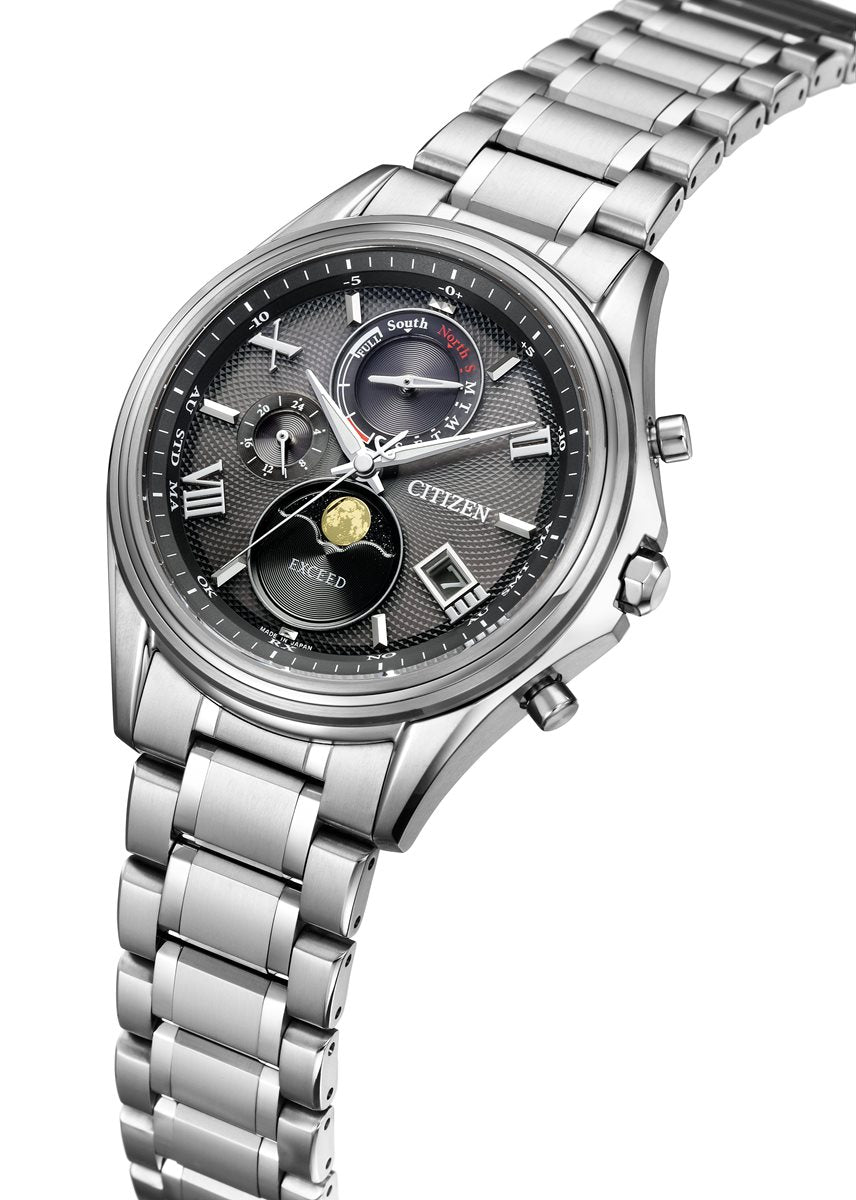 確かな品質と洗練されたデザイン。大人のためのドレスウオッチ、シチズン EXCEED(エクシード)。月の周りに広がる光の輪「月暈(つきがさ)」をテーマにした、月齢自動計算機能「ルナプログラム」搭載モデルです。月齢自動計算機能「ルナプログラム」を搭載したキャリバーを採用。サンアンドムーン機能を搭載したモデルとペアでお勧めいただけます。デザインのテーマは、月に薄い雲がかかったとき、その周囲に光の輪が現れる現象「月暈(つきがさ)」。この現象は「幸せの訪れを意味するもの」として幸運のサインであるという言い伝えがあります。ムーンフェイズ表示の月を金色で表現。ローマ数字インデックスとともにエレガントな印象を与えます。文字板には、ギョーシェ加工の一種である麦の穂のような「グレンドルジュ」装飾パターンを施しています。
