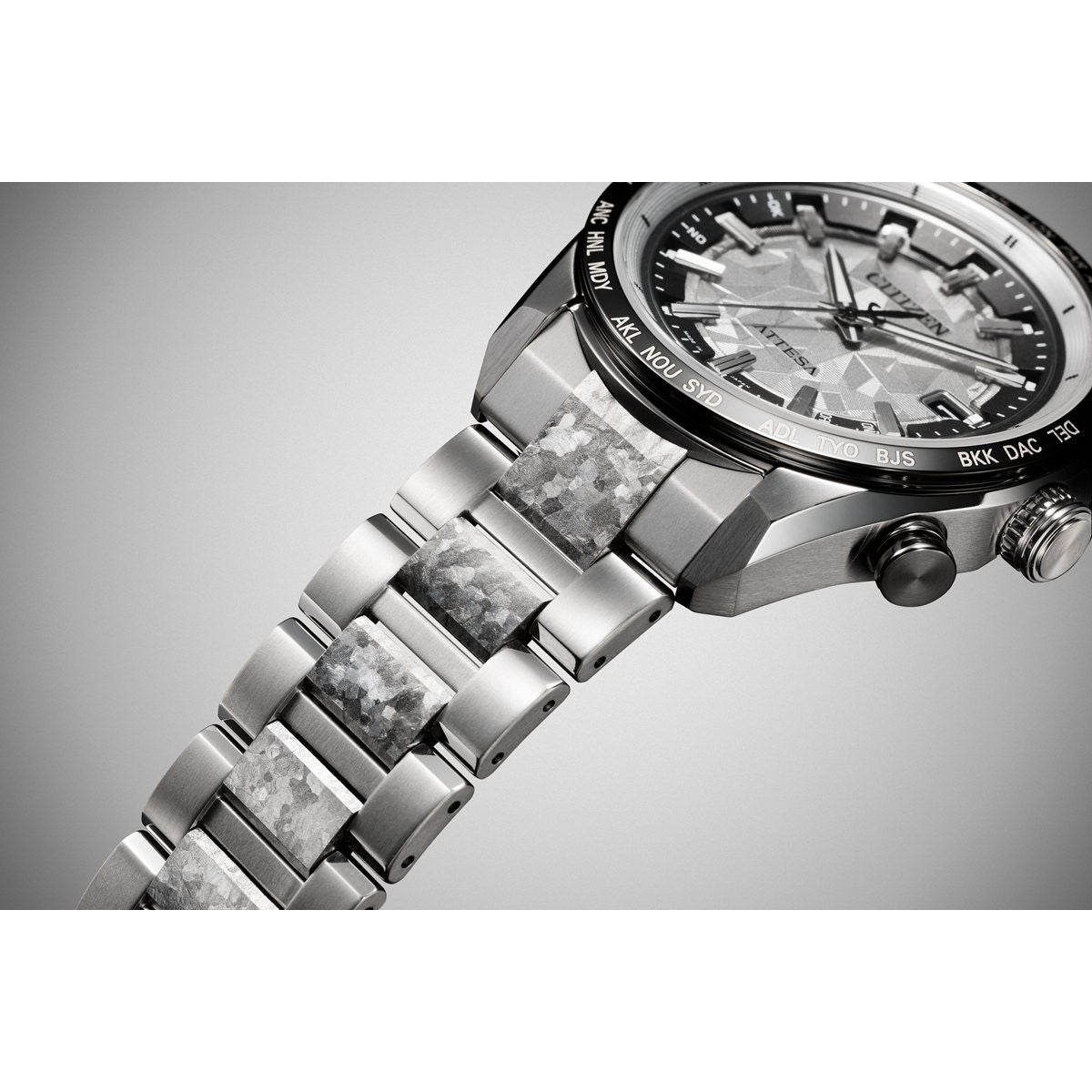 チタニウムで次世代を進み続ける、シチズン ATTESA(アテッサ)。結晶チタニウムにデュラテクトプラチナを重ねて手に入れた新しい輝き。1本1本が異なる表情を持つ限定モデルです。シチズン独自の技術で開発した「結晶チタニウム」に、デュラテクトプラチナを重ねた中駒を採用。結晶模様がプラチナの輝きをまとい、存在感を放ちます。シルバーの文字板は、結晶チタニウムをイメージしてデザインされたパターンをあしらい、光に反射して表情を変えるメタリック塗装をプラス。見返しリングにも同様にメタリック塗装を施すことで、文字板や外装との一体感を演出しました。