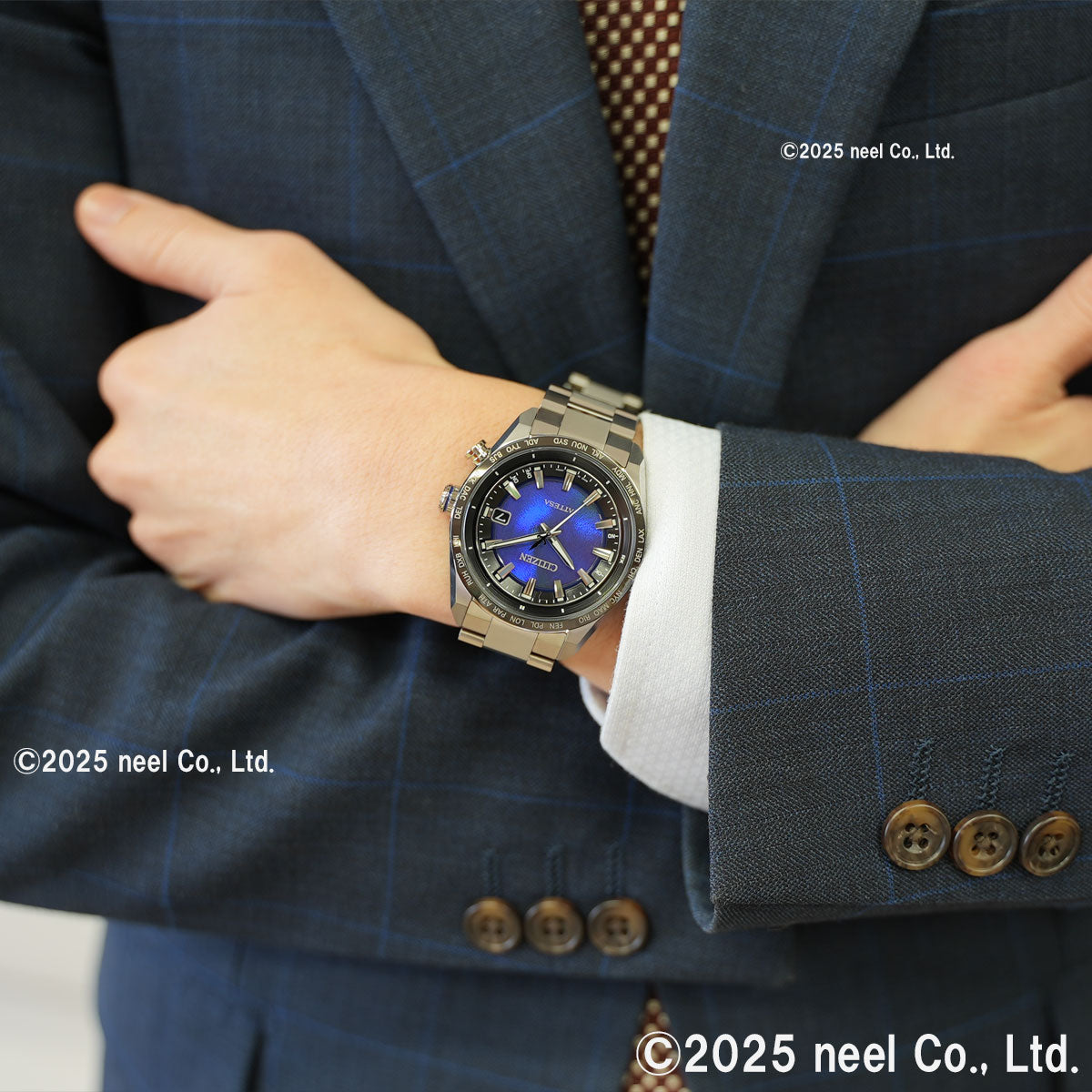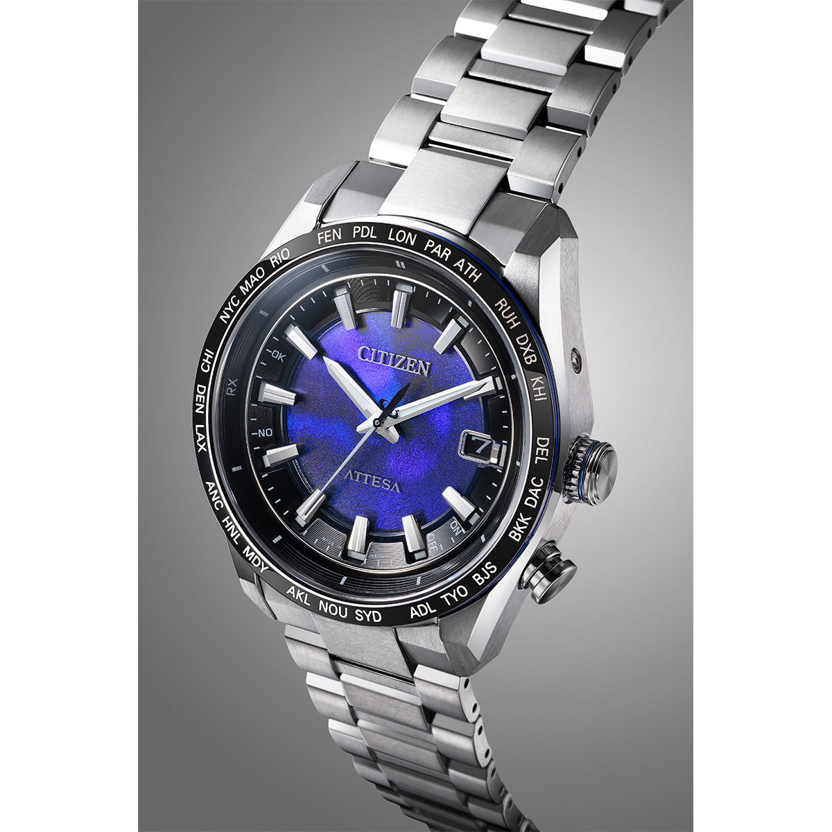 チタニウムで次世代を進み続ける、シチズン ATTESA(アテッサ)。構造色の魅力を堪能できるベーシックな3針モデル。構造色フィルムの上に3枚の文字板を重ね、立体的な文字板の中心で揺らめく、青の輝きを演出。吸い込まれるような躍動感を表現しています。ケースとバンドはデュラテクトプラチナを採用。鏡面仕上げの光沢が映えるブラックチタンのベゼル、ブルーの差し色をプラスしたシルバーのりゅうずが、神秘的な印象の中にもアクトラインらしさを感じさせます。