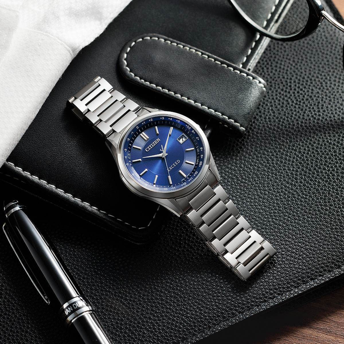 確かな品質と洗練されたデザイン。大人のためのドレスウオッチ、シチズン EXCEED(エクシード)。シンプルでスマートな印象の3針モデルに、ブルー文字板のペアウオッチが登場。「限界を超える」「卓越した」を意味するエクシードの名にふさわしい高機能。確かな技術と品質、洗練されたデザインをベースとした大人のための高級ドレスウオッチです。グローバル電波を受信し、現地時刻にすばやく合わせることができるダイレクトフライト機能搭載。文字板の中央とインデックス部分の文字板の仕上げを描き分け、シンプルでありながらもメリハリの効いたデザインに仕上げています。