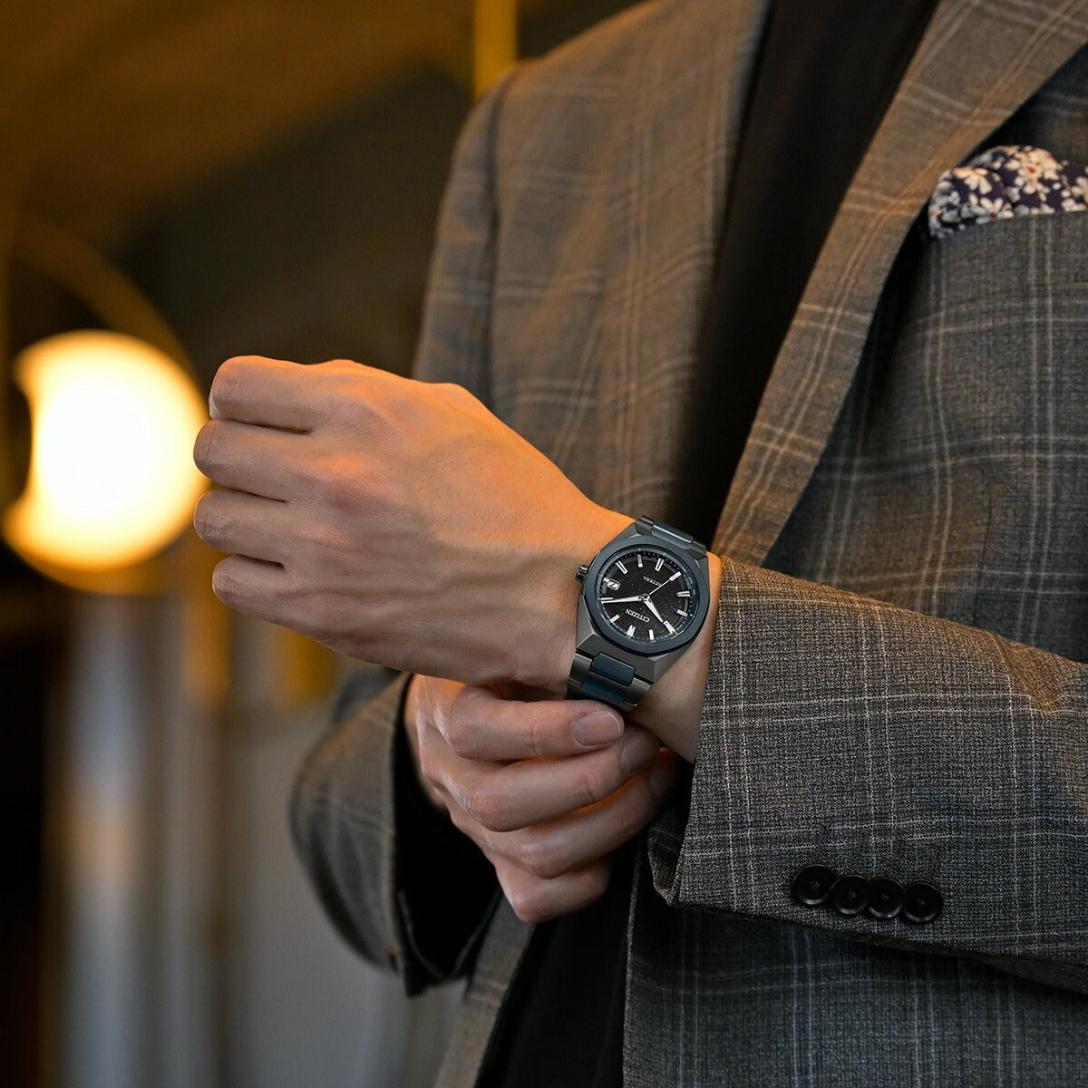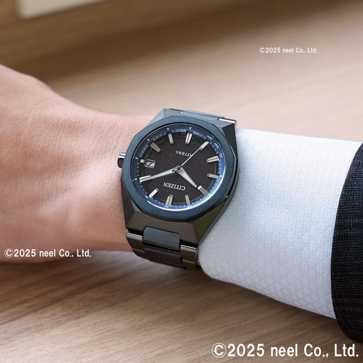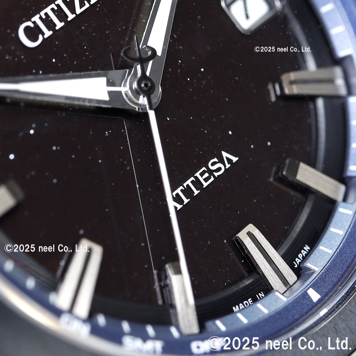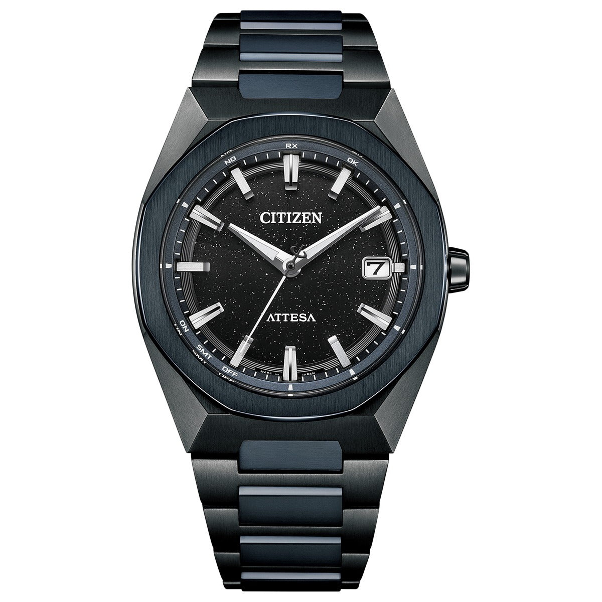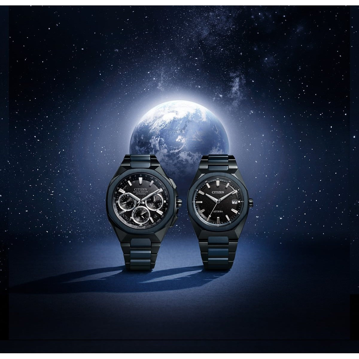 チタニウムで次世代を進み続ける、シチズン ATTESA(アテッサ)。ブラックとダークブルーの組み合わせが大人の落ち着きと特別感を演出。宇宙に浮かぶ星の輝きを表現した「Blue Universe Collection」第2弾です。ベゼルとバンドの中駒にDLCブルーを採用。グレイッシュなブラックとダークブルーの組み合わせが、特別感とともに大人の落ち着きを感じさせます。ラメを練り込んだブラックの文字板が、漆黒の静かな宇宙空間に浮かぶ星々を表現。シンプルなインデックスと針が、輝きを放ちつつも優れた視認性を確保しています。