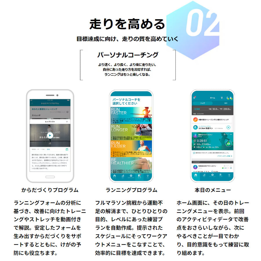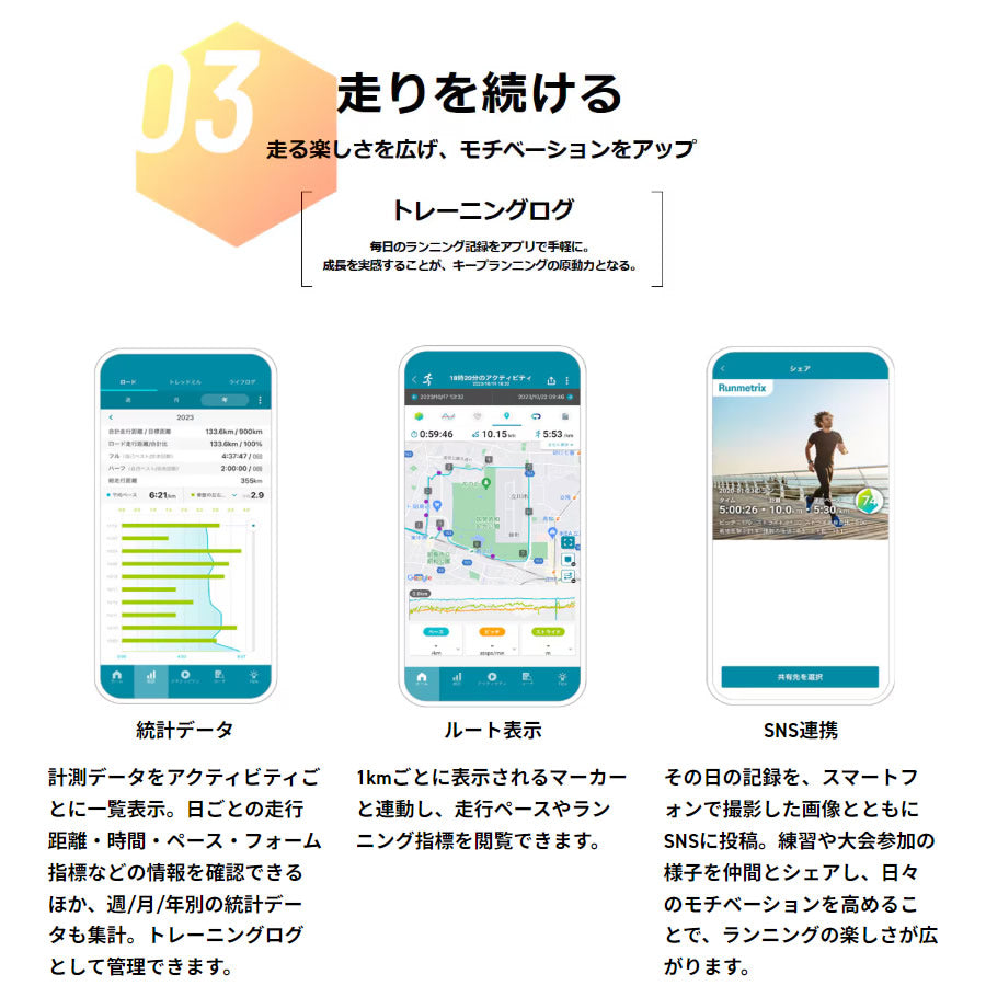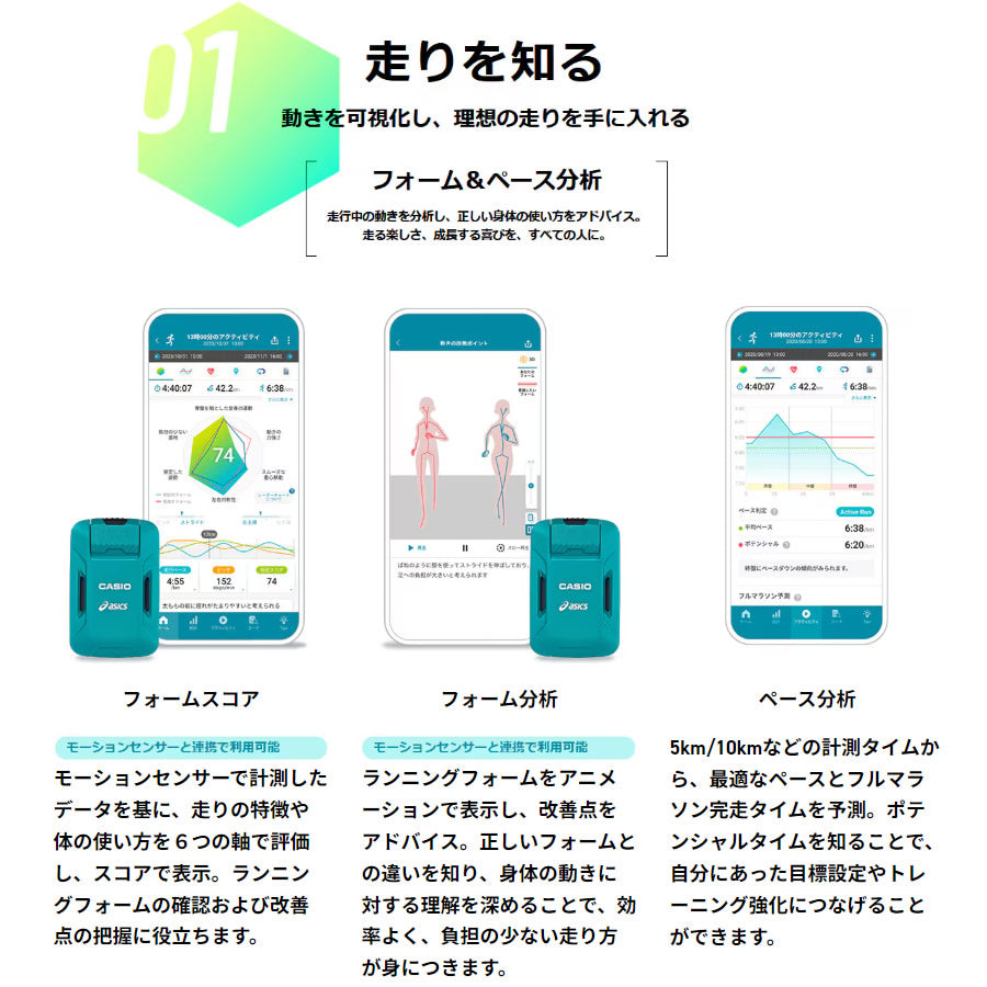 | カシオとアシックスの共同開発により、新たなランナー向けサービス「Runmetrix」が誕生します。カシオのセンシング技術、ウェアラブル技術と、アシックスのスポーツ工学に関する知見、ノウハウ、ビッグデータの融合により、ランナーひとりひとりに最適な情報を提供。モーションセンサーは、GPS機能+9軸センサーを搭載し、スマートフォンなしでランニング中の身体の動きを細かく計測可能。ウェアに装着して走ることで、ピッチ、ストライドはもちろん、上下動や左右の傾きなど、20種類以上のランニング指標を測定できます。また、専用のスマートフォンアプリ「Runmetrix」を新たに開発。モーションセンサーの計測データをアプリで確認できるほか、ランニングフォームやペースの分析、トレーニングプランやからだづくりのアドバイスまで、パーソナルコーチとして日々の運動をアシストします。自分らしく走る喜びをすべての人に。新たなランニング体験が、いま始まります。 |