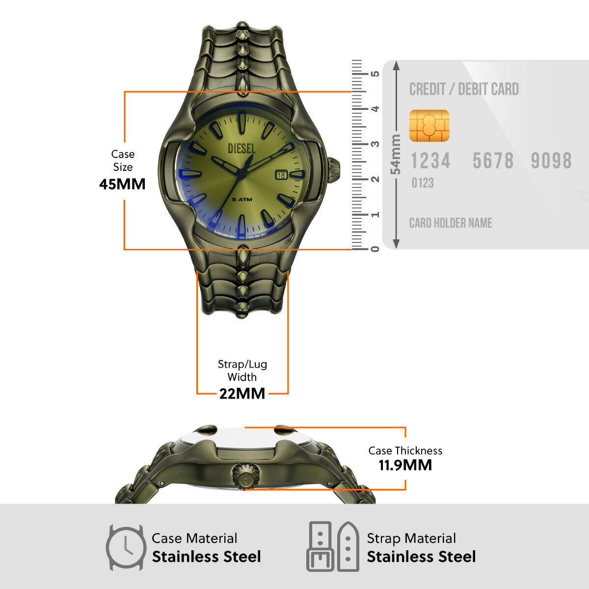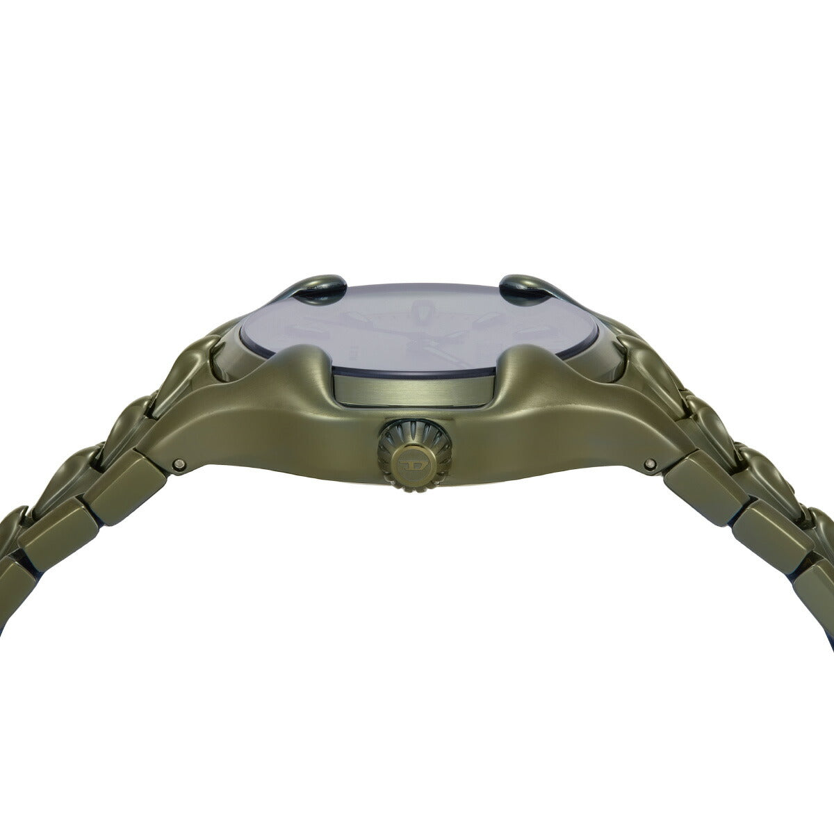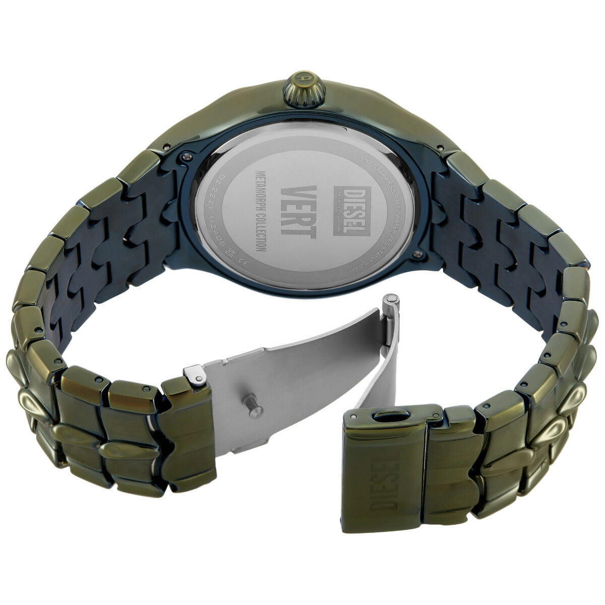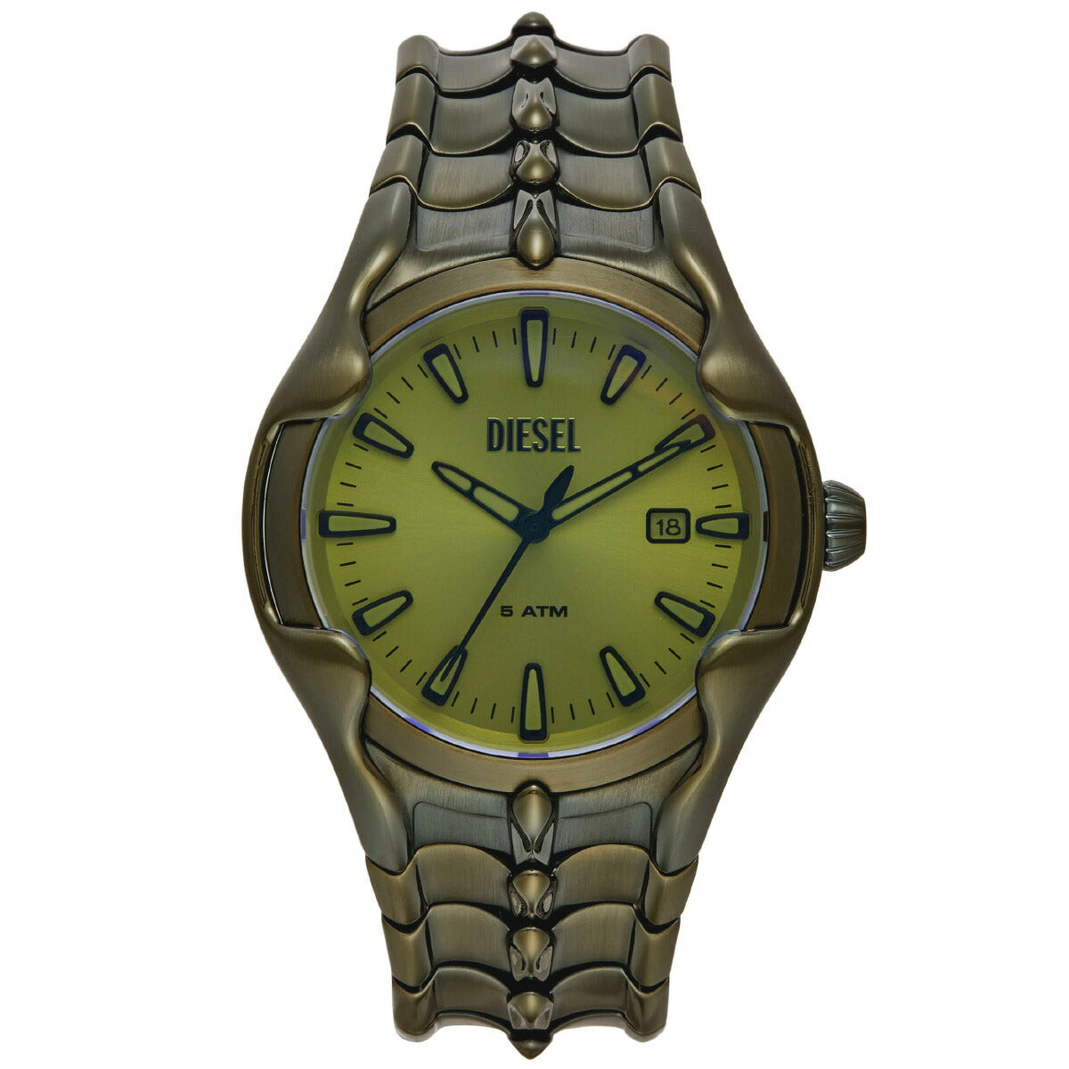 44mm径のケースにデイト表示付き三針ムーブメントを搭載したDieselのVERTウォッチ。グリーンのイリデセントクリスタルを使用したシルバートーンのサンレイダイヤルに、グリーンのステンレススチールブレスレットを組み合わせました。