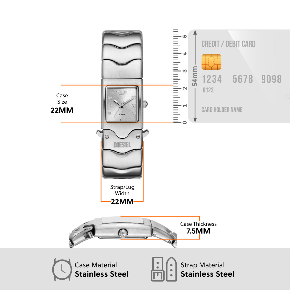 22mmのケースに三針ムーブメントを搭載したDieselのCLOSERウォッチ。シルバートーンのサンレイダイヤルに、ステンレススチールブレスレットを組み合わせました。バックル留め。