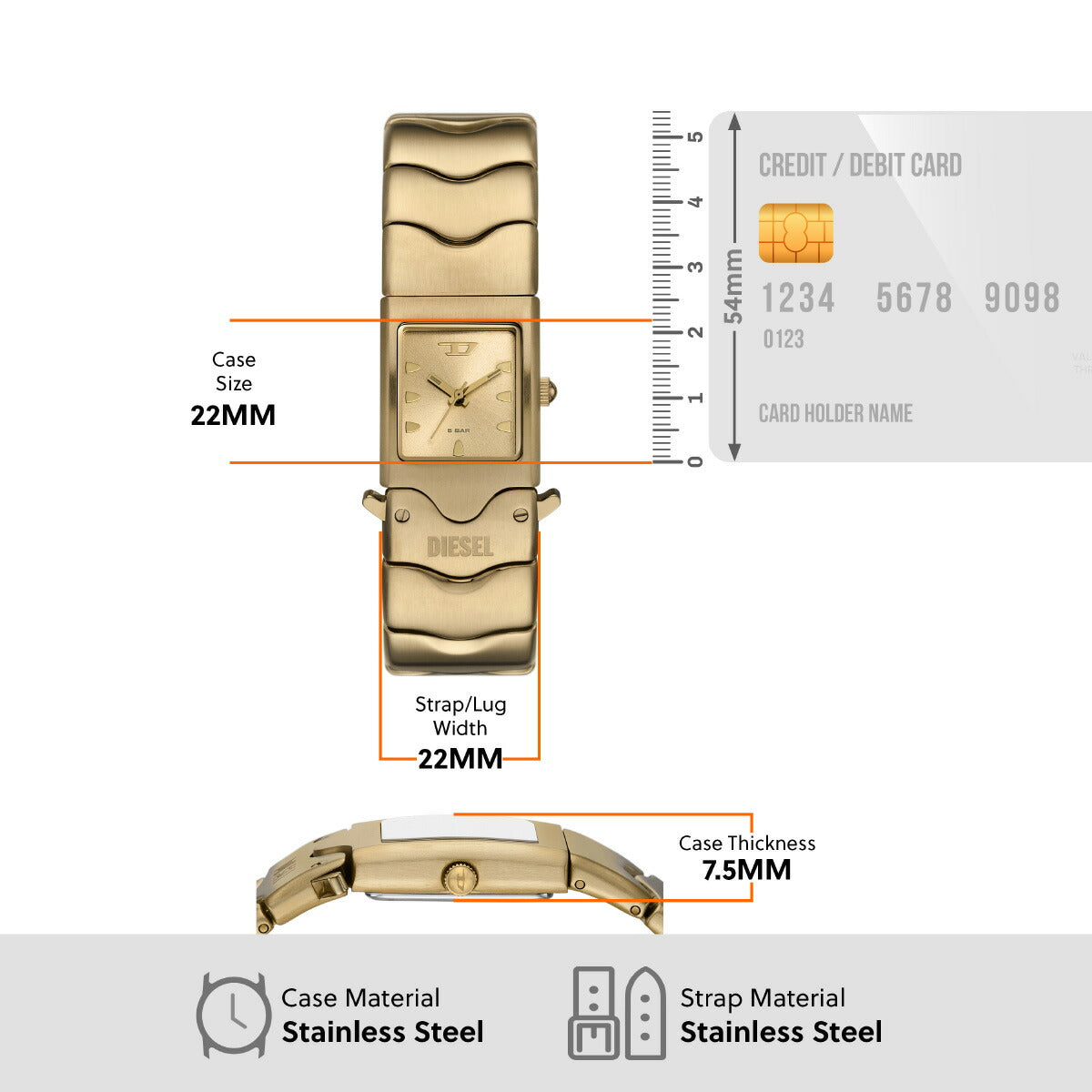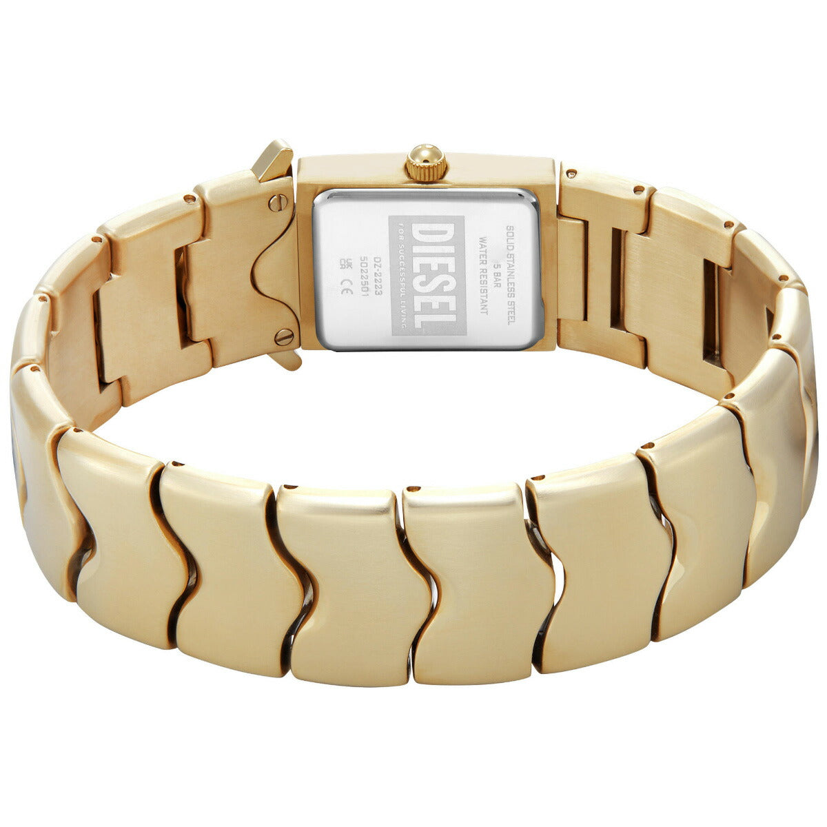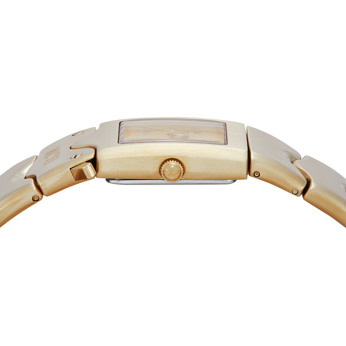 22mmのケースに三針ムーブメントを搭載したDieselのCLOSERウォッチ。ゴールドトーンのサンレイダイヤルに、ゴールドトーンのステンレススチールブレスレットを組み合わせました。バックル留め。