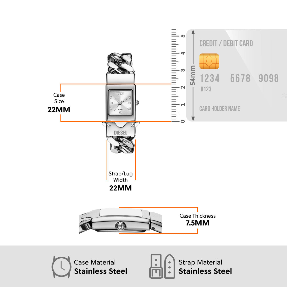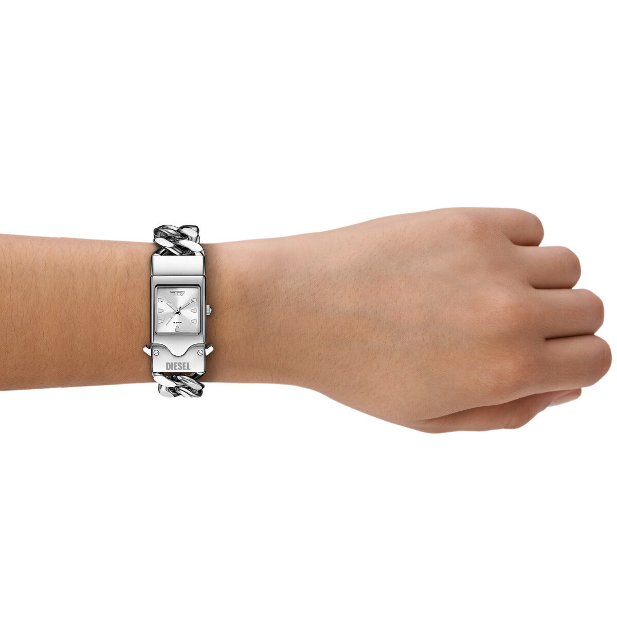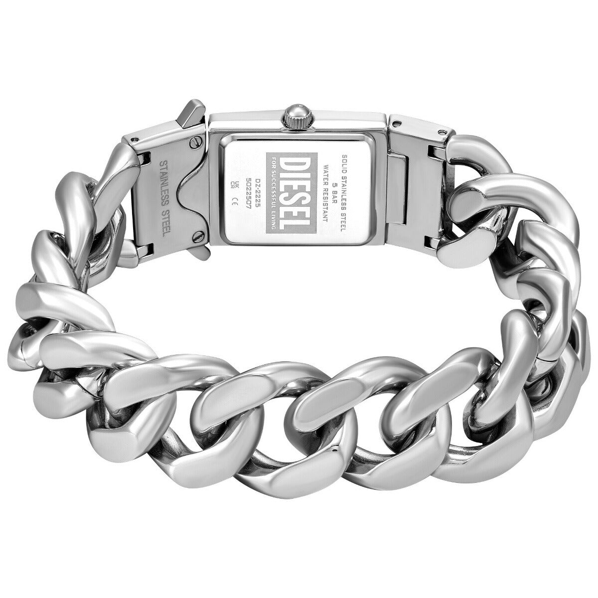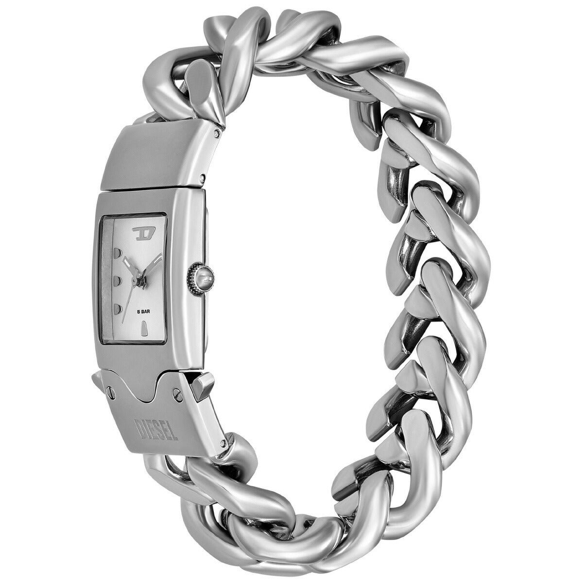 DIESELの22mm CLOSERウォッチ。シルバーのサンレイダイヤル、三針ムーブメント、ジュエリーからインスピレーションを得たステンレススチール製バックル留めブレスレットアタッチメントが特徴です。